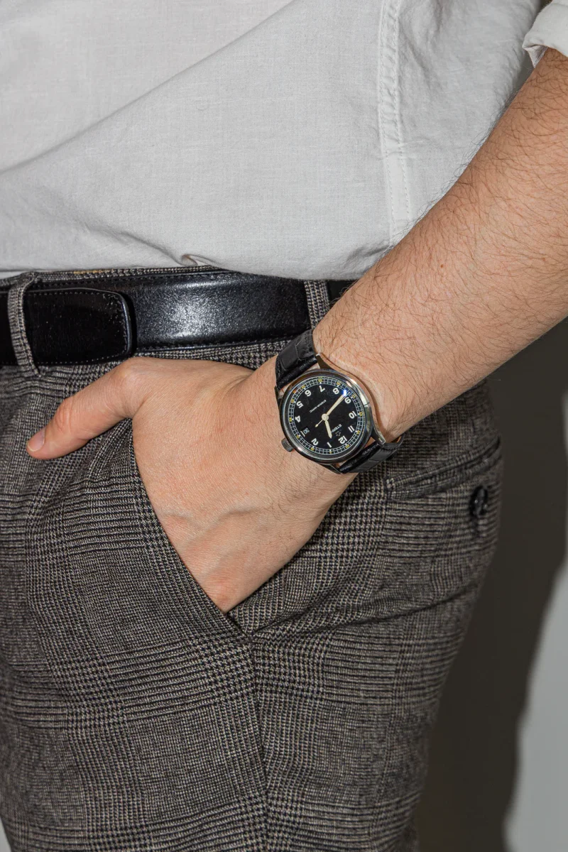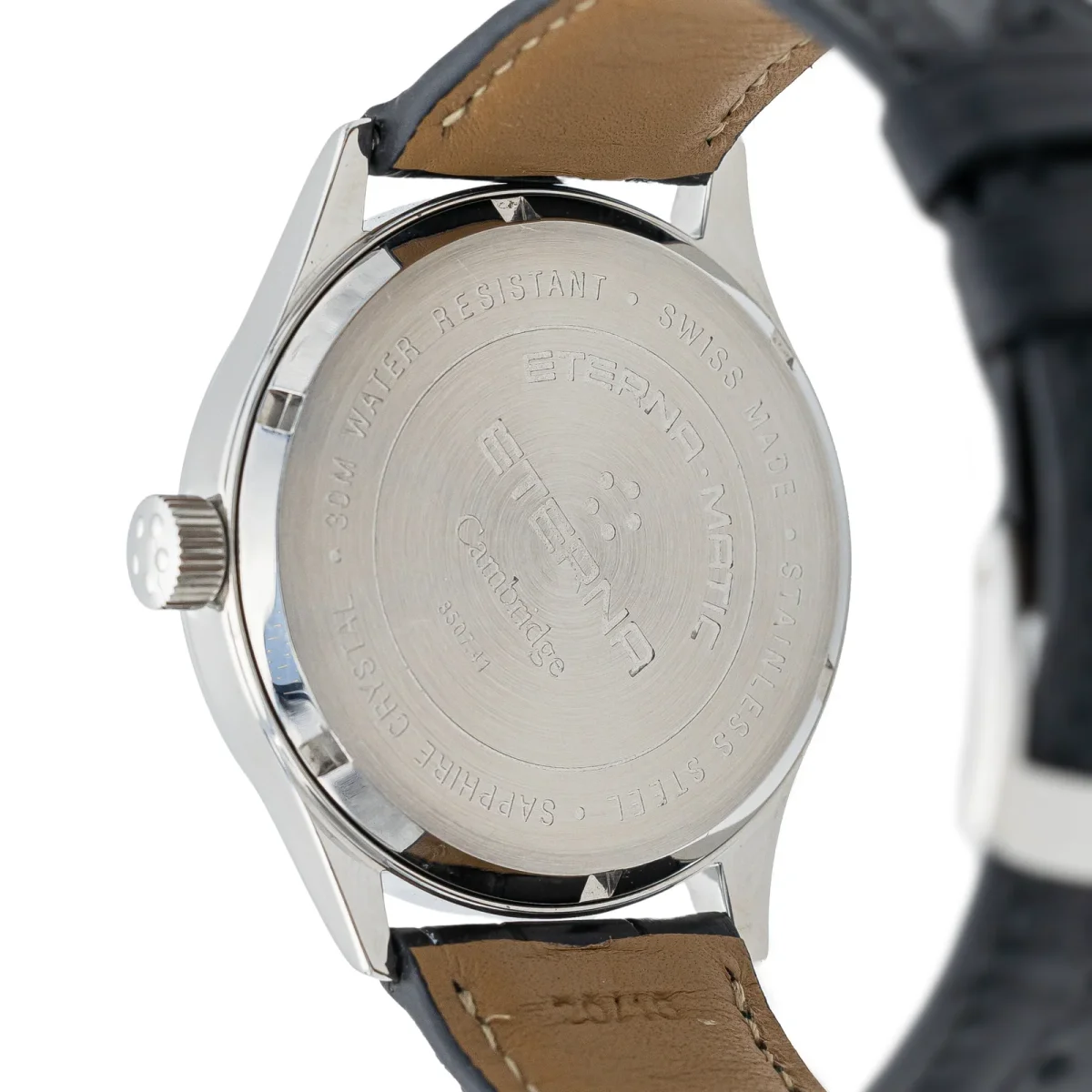 Montre Eterna Matic modèle Cambridge 3 aiguilles acier réf 8507.41, cadran noir à chiffre arabe, mouvement mécanique à remontage automatique, boitier 38 mm, verre saphir, bracelet cuir à boucle ardillon (Taille poignet 21 cm ajustable, Largeur bracelet 1,55cm) poids total 59,04 g, année 1990, Excellent état