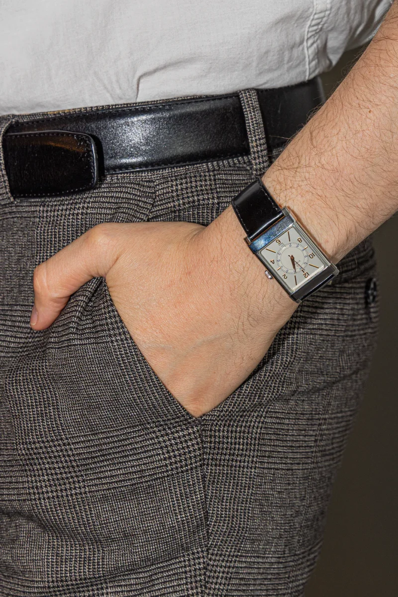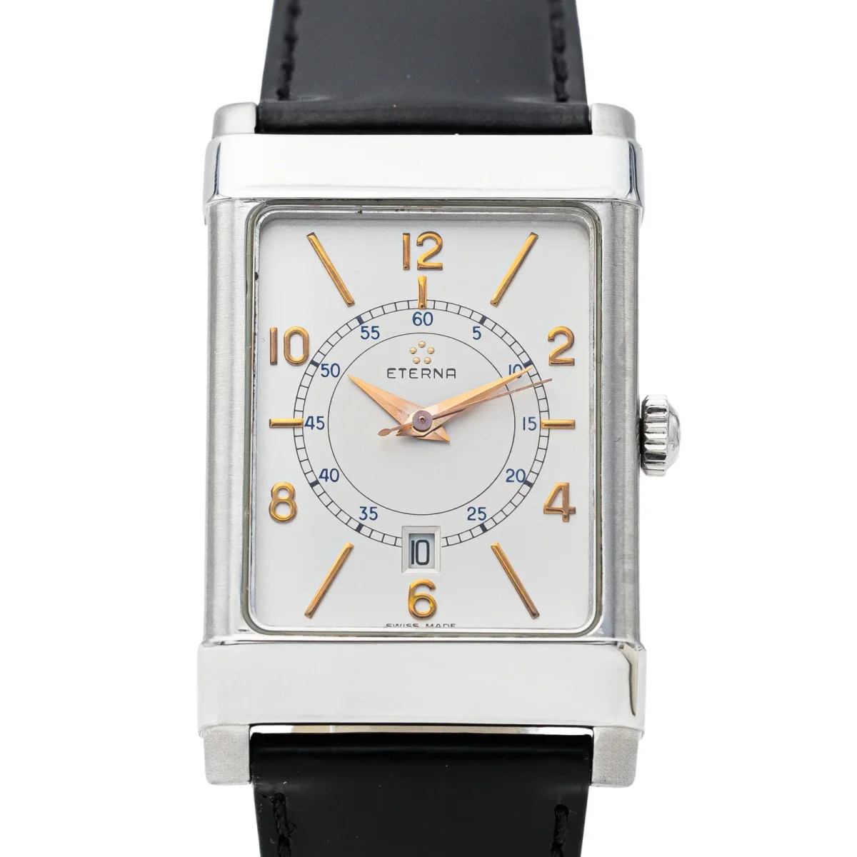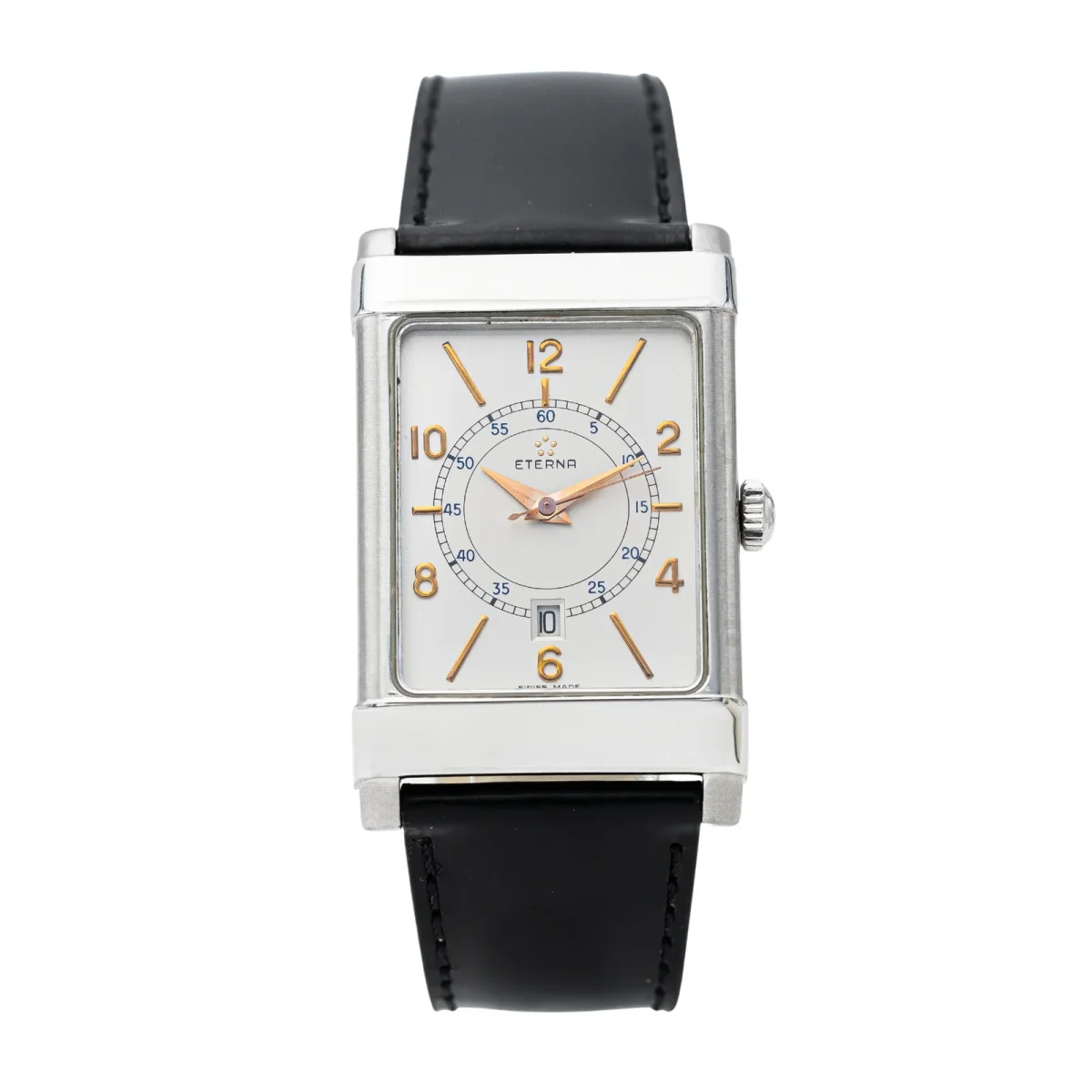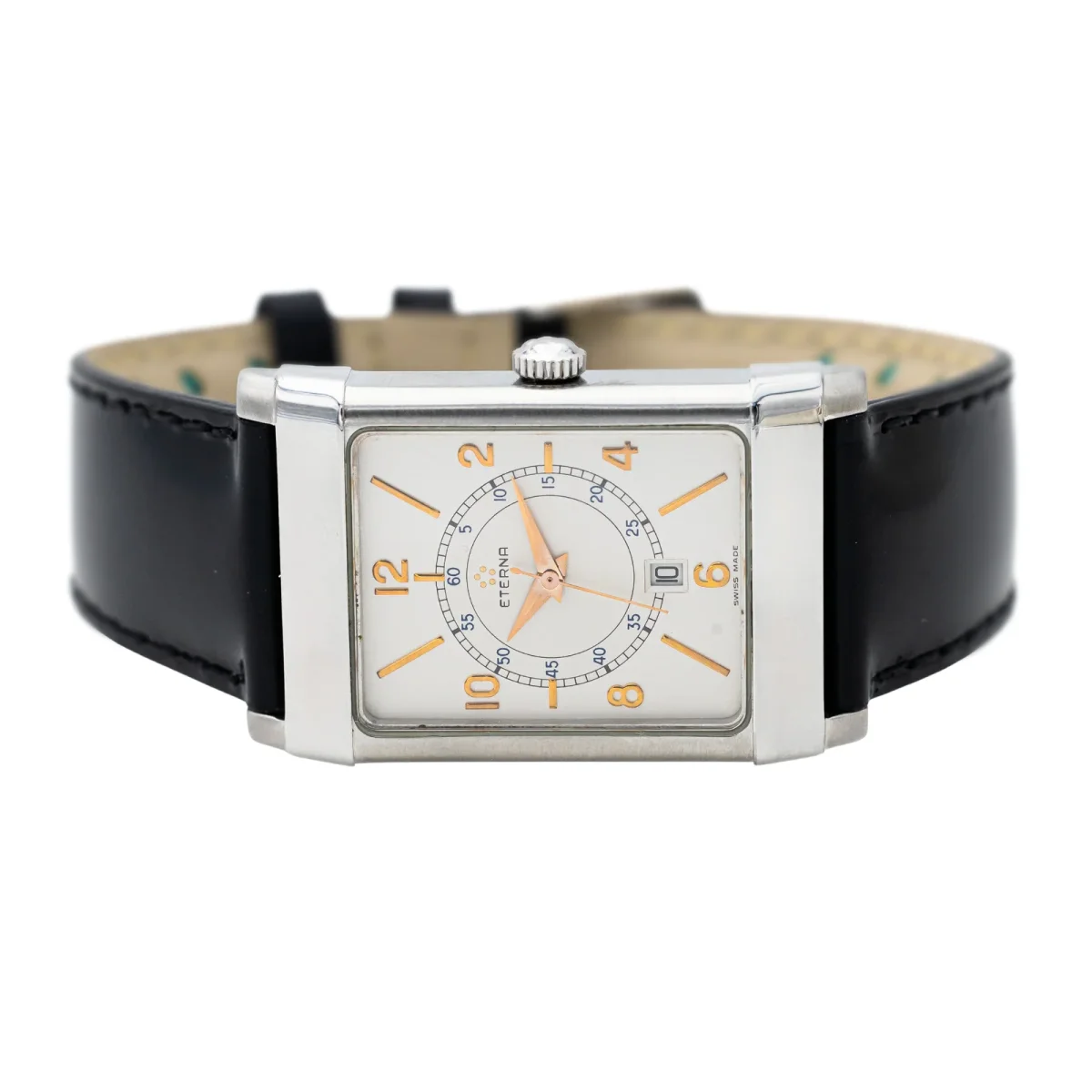 Montre Eterna Matic modèle Les historiques 1935, n°série A2786, cadran blanc à chiffre arabe et index batons, mouvement automatique, boitier 41×26 mm, verre saphir, bracelet cuir boucle ardillon (Taille poignet 21cm ajustable, Largeur bracelet 1,6cm) poids total 40,03 g, année 2000, Excellent état
