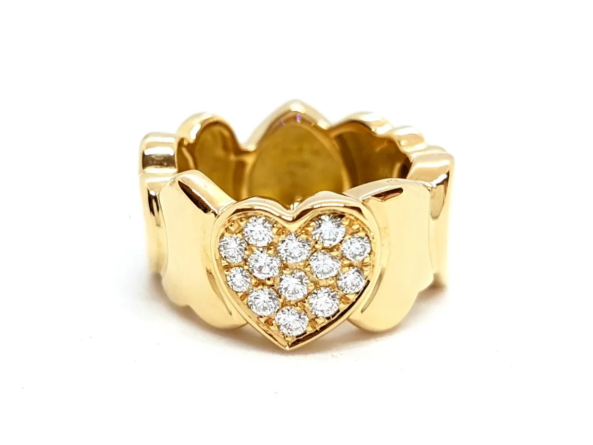 Magnifique bague signée de la maison Fred, modèle bandeau coeur, en Or jaune 750 millièmes (18 carats), pavée de 13 diamants taille brillant G-VS pour environ 0,26 carat au total, taille de doigt: 48, largeur: 1 cm, poids total: 9,41 g, poinçonné tête d’aigle, excellent état, prix neuf: 3000€