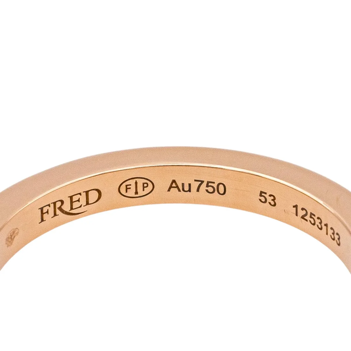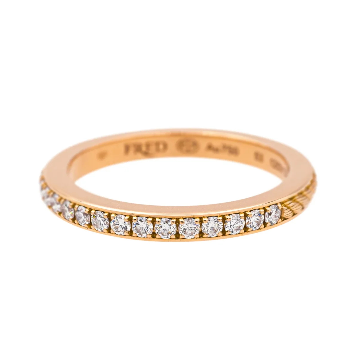 Demi-alliance signée de la Maison Fred en or rose 750 millièmes (18 carats), modèle Force 10 duo, sertie de 19 diamants taille brillant environ G-VS, d’environ 0,01 ct chacun, poids total diamants: environ 0,32 ct, largeur sur le dessus : 0,22 cm, tour de doigt : 53, poids total : 3,71 g, poinçon tête d’aigle, vendue avec écrin et certificat d’origine et d’époque, numérotée : 1253133, excellent état