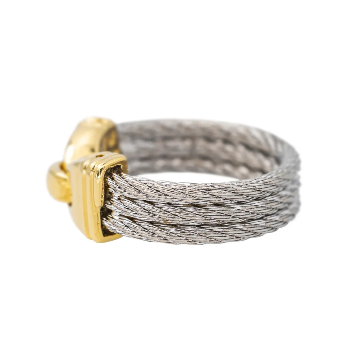 Bague signée de la Maison Fred en or jaune 750 millièmes (18 carats) et acier, modèle Force10, largeur sur le dessus : 0,75 cm, tour de doigt : 50, poids total : 4,41 g, vendue avec pochette d’origine et d’époque, excellent état
