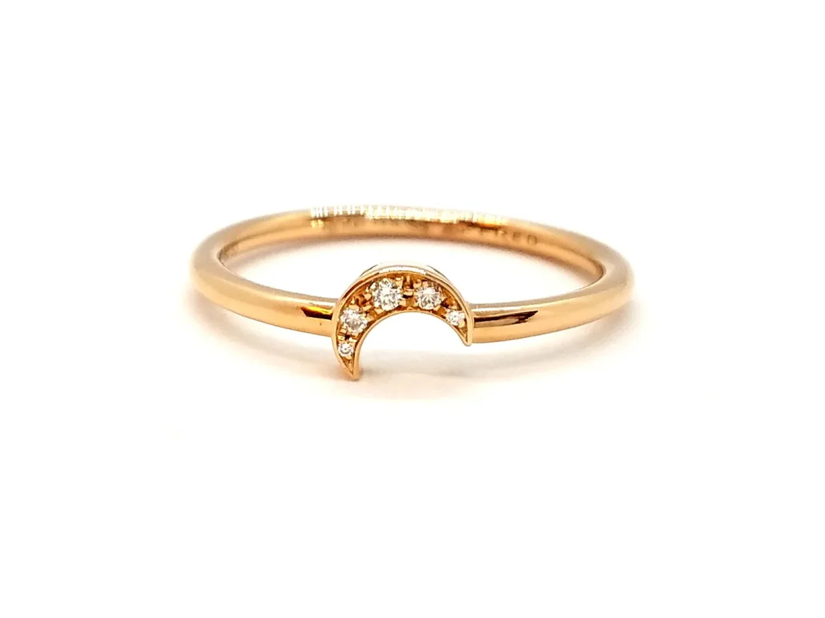 Bague signée de la maison Fred, collection « Kate Moss for Fred », en or rose 750 millièmes (18 carats), modèle lune sertie de 5 diamants taille brillant G-VS pour un total de 0,03 ct, taille: 53, largeur anneau: 0,15 cm, dimensions lune: 0,57 cm x 0,5 cm, poids total: 1,97 g, numéroté: 906924, excellent état, prix neuf: 710€