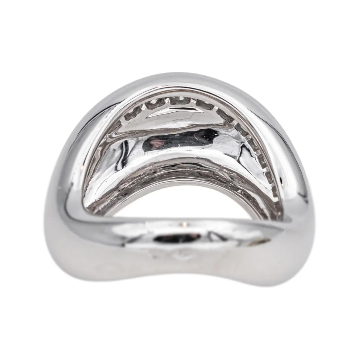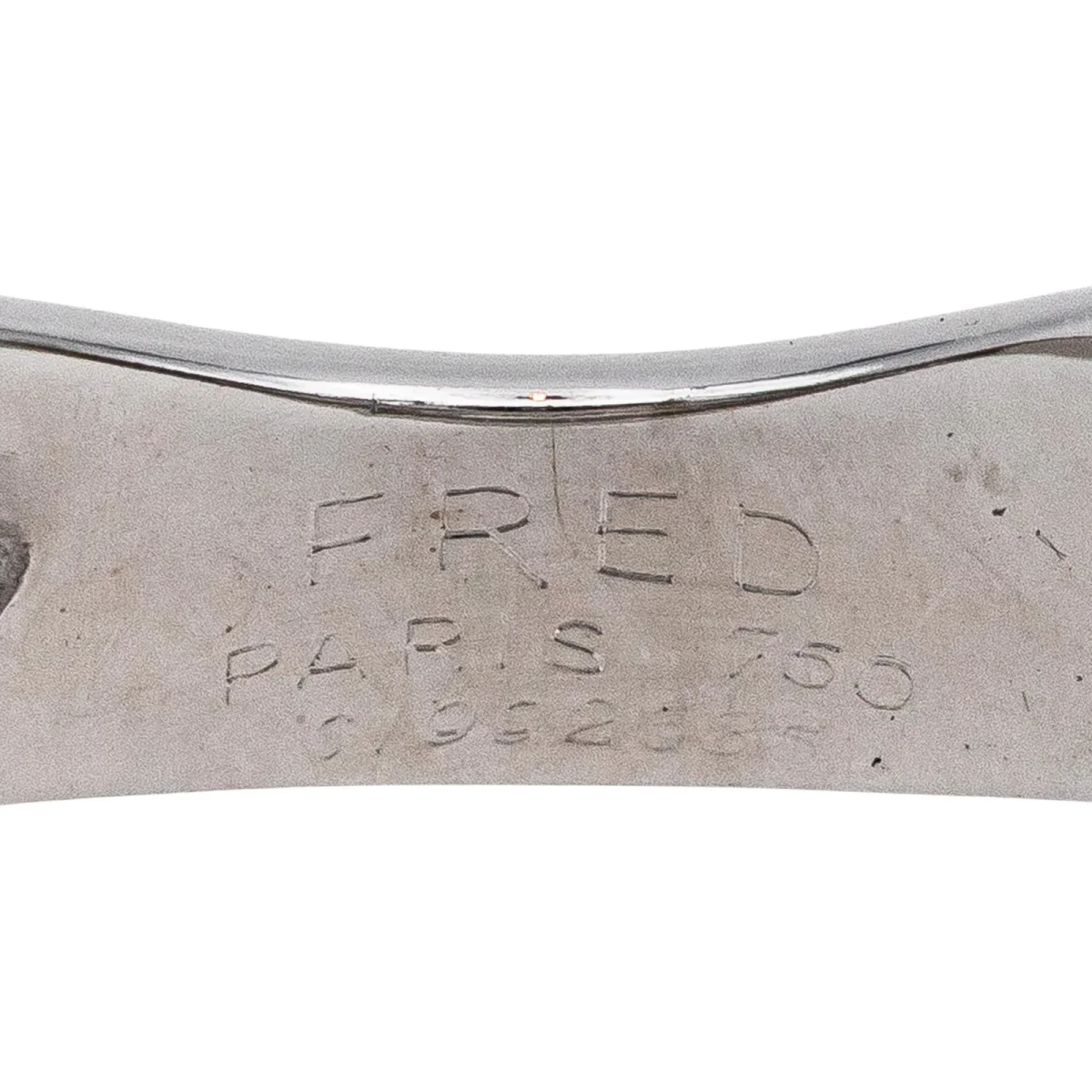 Bague signée de la Maison Fred en or blanc 750 millièmes (18 carats), modèle Mouvementée, sertie de 19 diamants, taille brillant, environ G-VS, d’un poids total d’environ 0,45 ct, (un diamant d’un poids d’environ 0,09 ct, 6 diamants d’un poids d’environ 0,04 ct, et 12 diamants d’un poids d’environ 0,01 ct), largeur sur le dessus : 1,13 cm, tour de doigt : 53, poids total : 15,33 g, poinçon tête d’aigle, numérotée : S/992635, excellent état