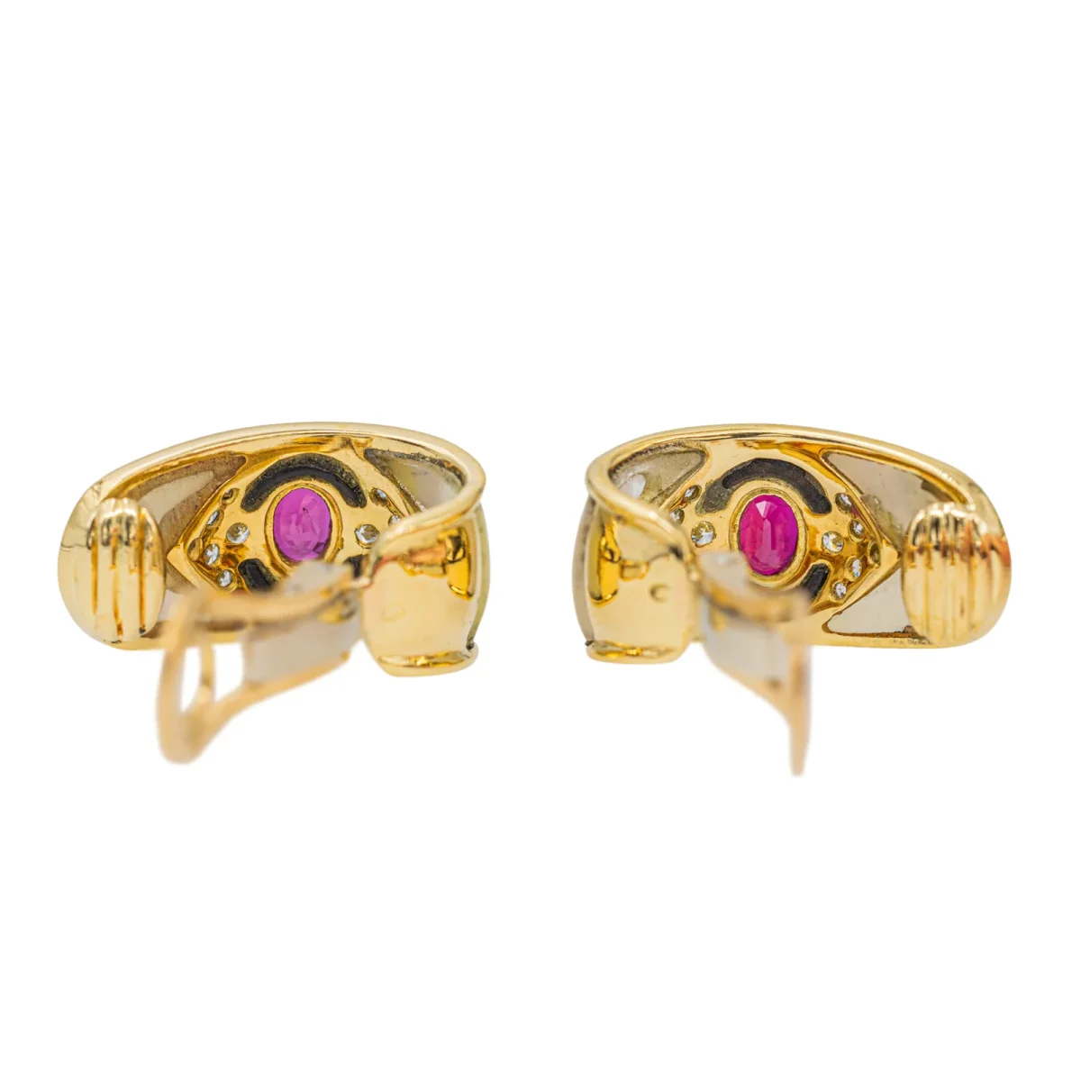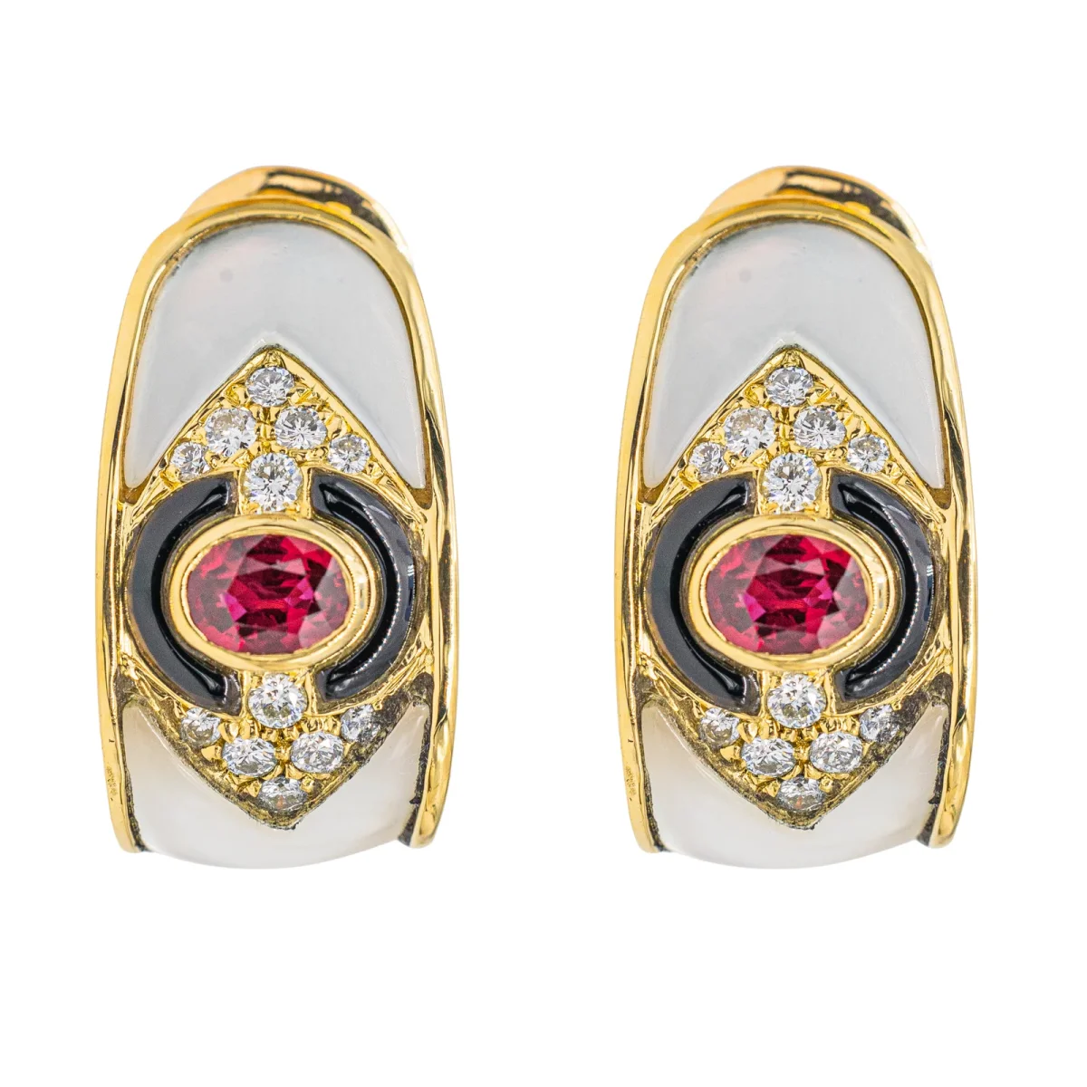 Boucles d’oreilles signées de la Maison Fred, clips, serties de rubis de diamants de nacre et d’onyx, en or jaune 750 millièmes (18 carats), 2 rubis taille ovale, d’un poids total d’environ 0,78 ct, (chaque rubis d’un poids d’environ 0,39ct), entouré de 24 diamants taille brillant, environ H-SI, d’un poids total d’environ 0,24 ct, (chaque diamant d’un poids d’environ 0,01 ct), dimensions: 2,30 cm x 1,16 cm, poids total: 11,11 g, poinçon tête d’aigle, excellent état