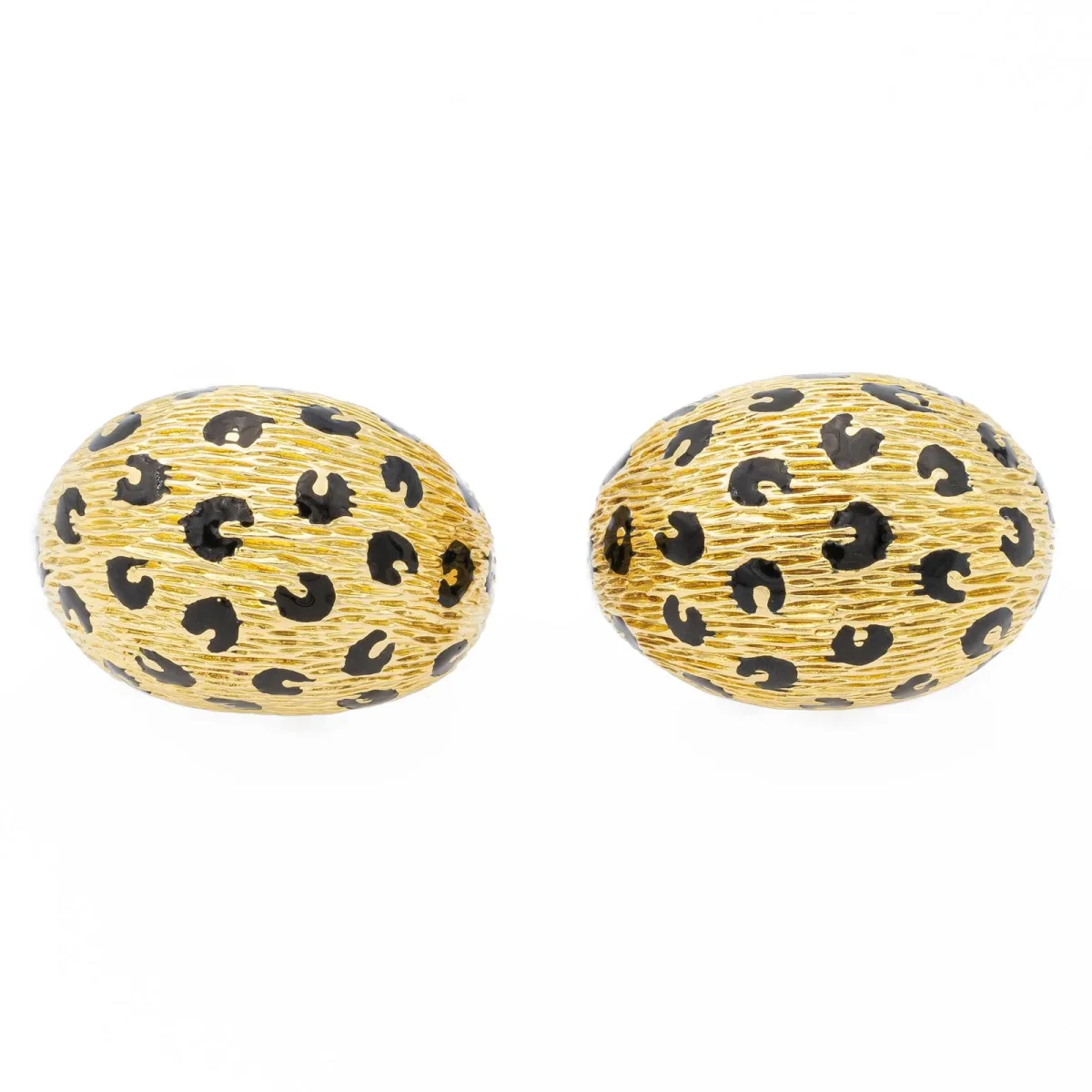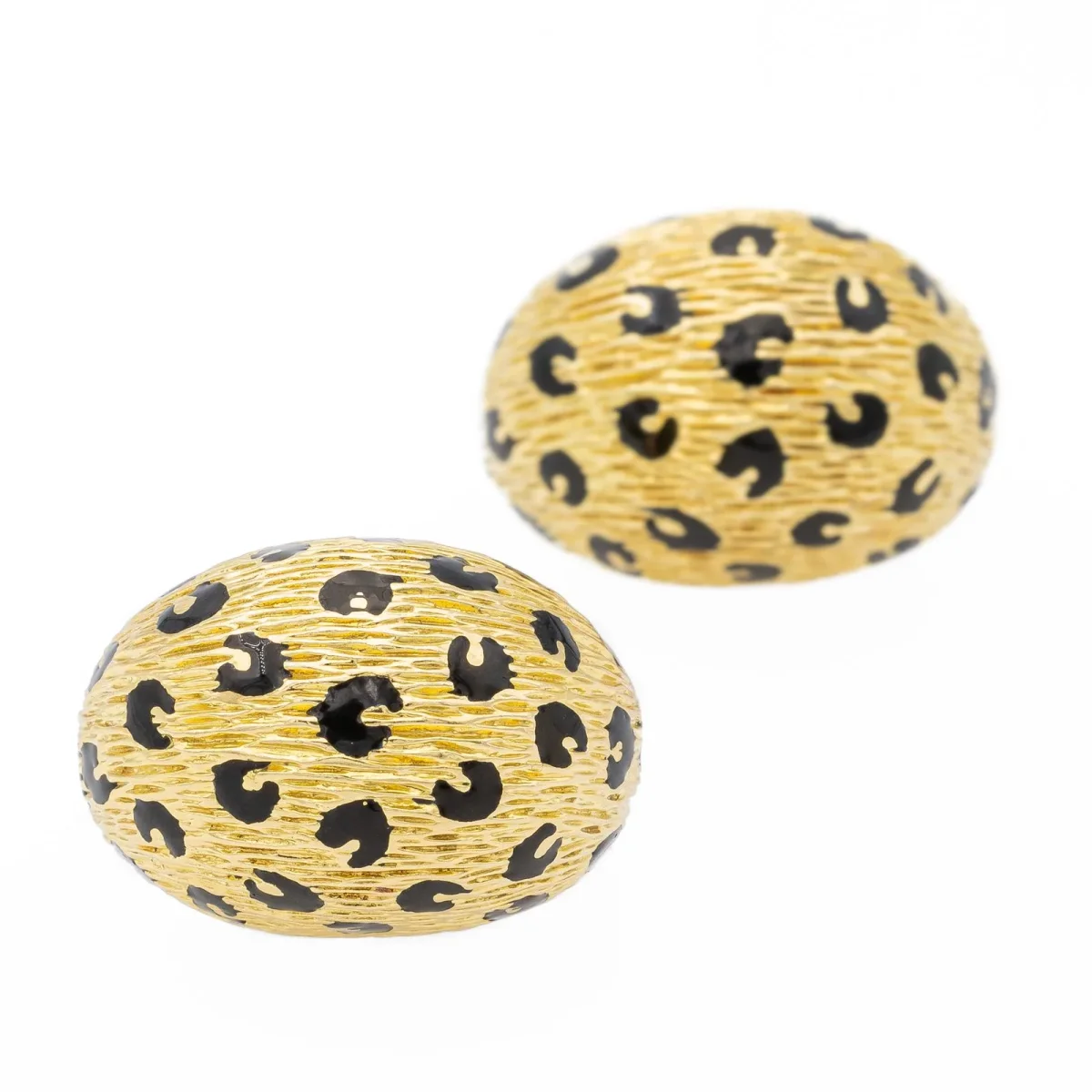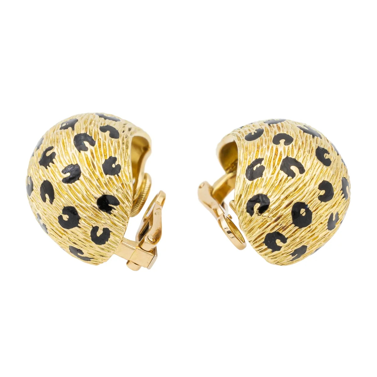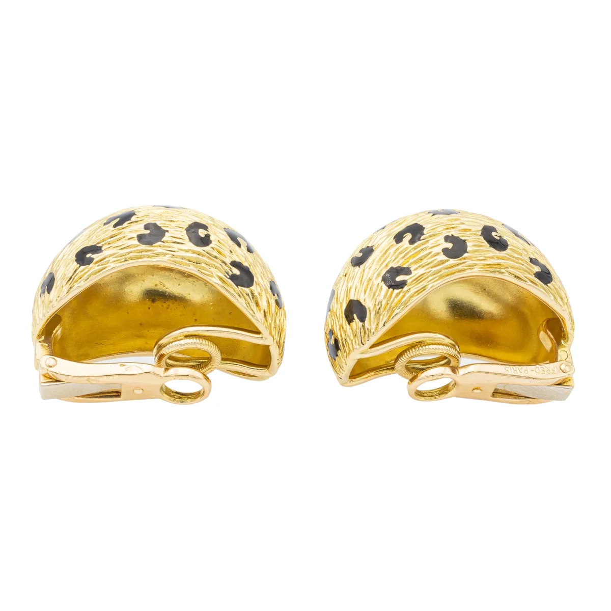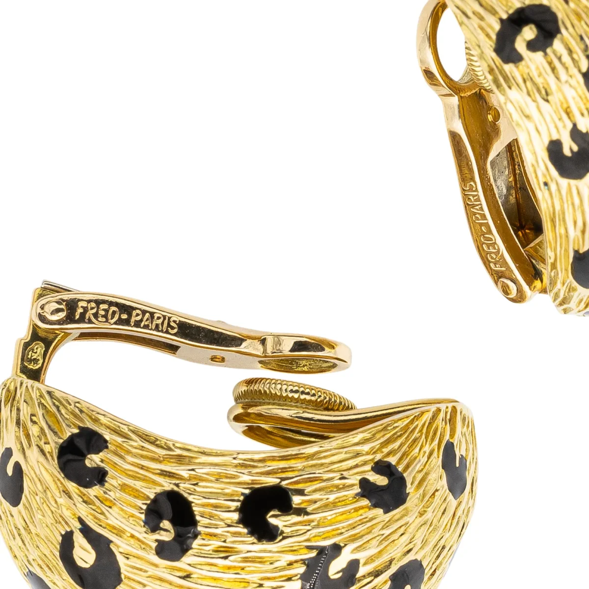 Boucles d’oreilles clips signées de la maison Fred, modèle panthère, années 1980, en or jaune 750 milllièmes (18 carats) et émail noir, clips, hauteur : 4,2 cm, largeur : 2,8 cm, poids total : 19,10 g, poinçon tête d’aigle, excellent état