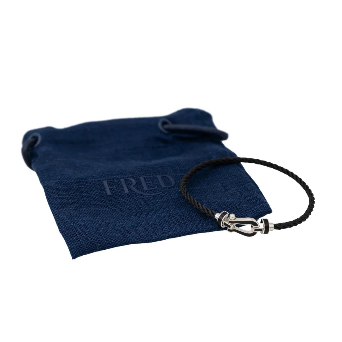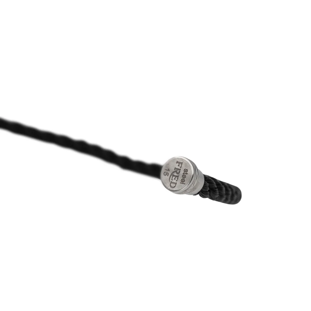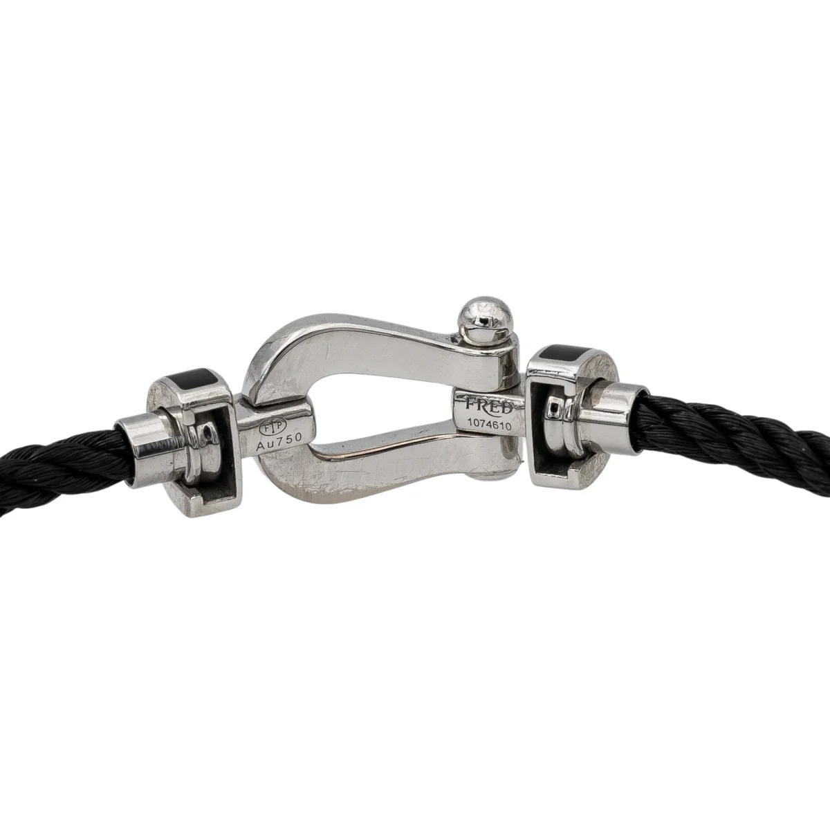 Bracelet signé de la maison Fred, collection Force 10, manille moyen modèle, en or blanc 750 millièmes (18 carats), laque noire, câble acier noir, dimension manille: 2 cm x 0,9 cm, câble: 15 cm, longueur totale bracelet: 16,5 cm, poids total: 5,70 g, poinçon tête d’aigle, signé et numéroté 1074610, prix neuf: 2730€, écrin Fred, jamais porté, excellent état