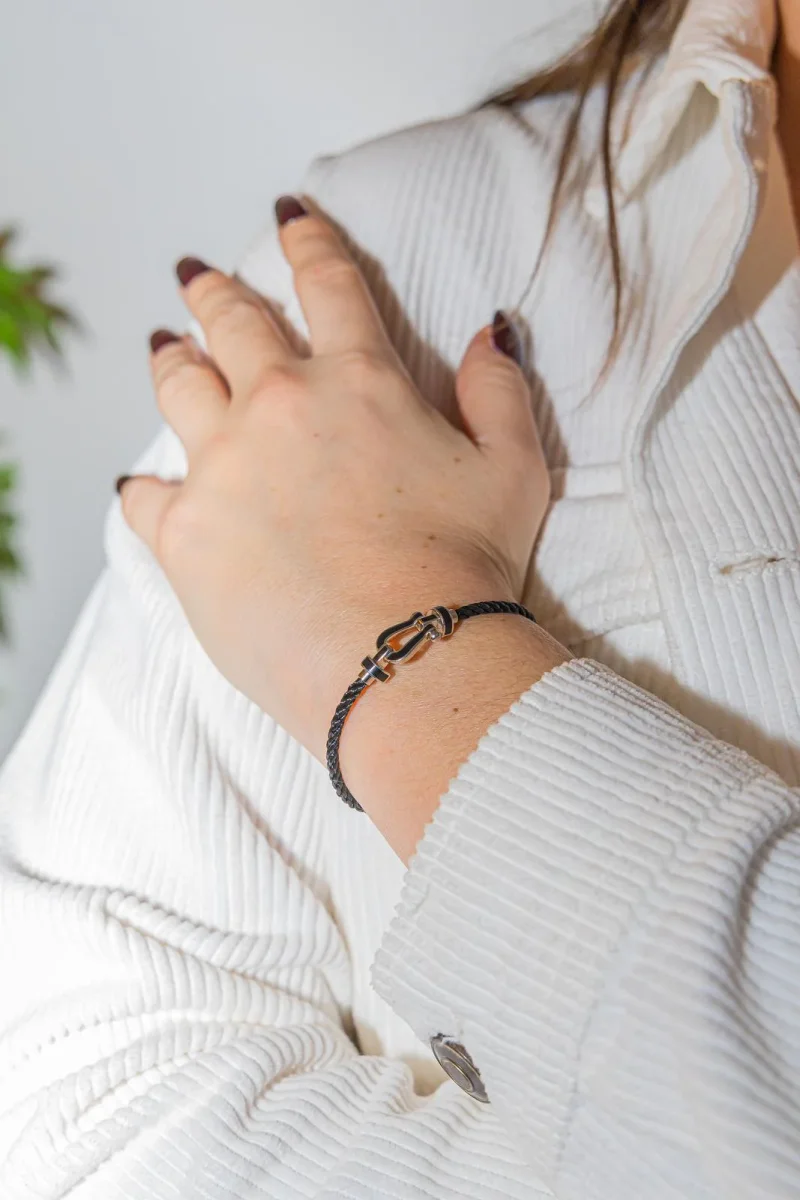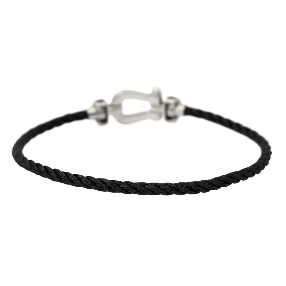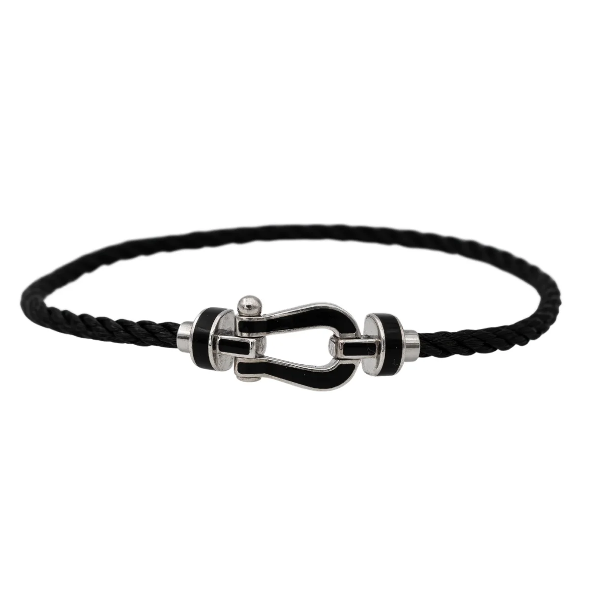 Bracelet signé de la maison Fred, collection Force 10, manille moyen modèle, en or blanc 750 millièmes (18 carats), laque noire, câble acier noir, dimension manille: 2 cm x 0,9 cm, câble: 15 cm, longueur totale bracelet: 16,5 cm, poids total: 5,70 g, poinçon tête d’aigle, signé et numéroté 1074610, prix neuf: 2730€, écrin Fred, jamais porté, excellent état