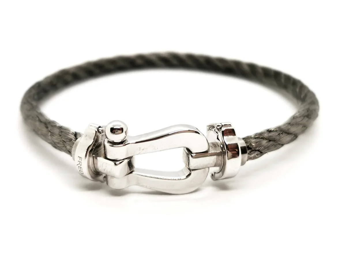 Bracelet signé de la maison Fred, collection Force 10, grand modèle, manille en or blanc 750 millièmes (18 carats), câble en acier inoxydable gris, câble: 18 cm, longueur totale (manille incluse): 20,5 cm, largeur câble: 0,40 cm, dimensions manille: 2,63 cm x 1,27 cm, Poids total: 16,85 g, numéroté: 860307, poinçon tête d’aigle, prix neuf: 3080€, excellent état