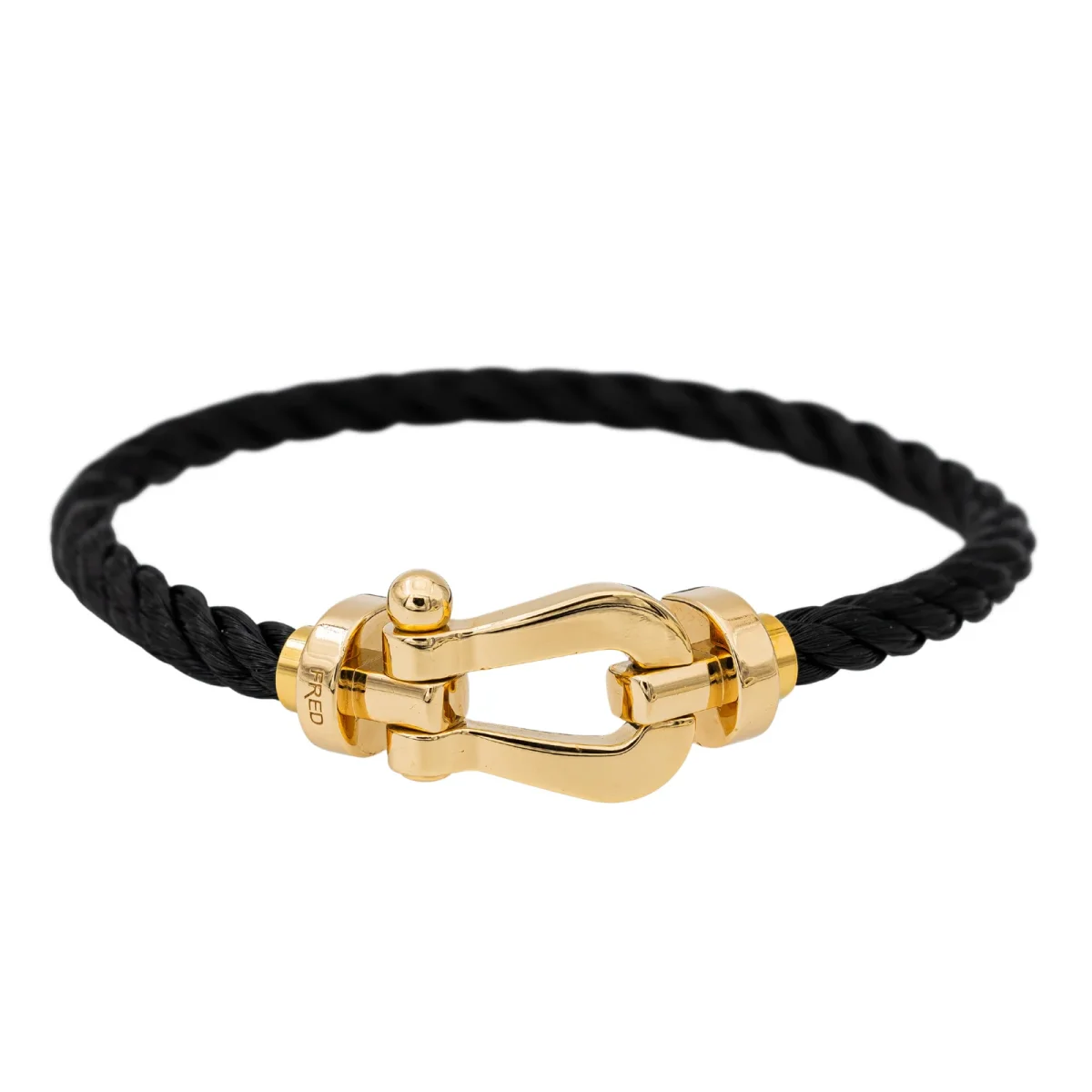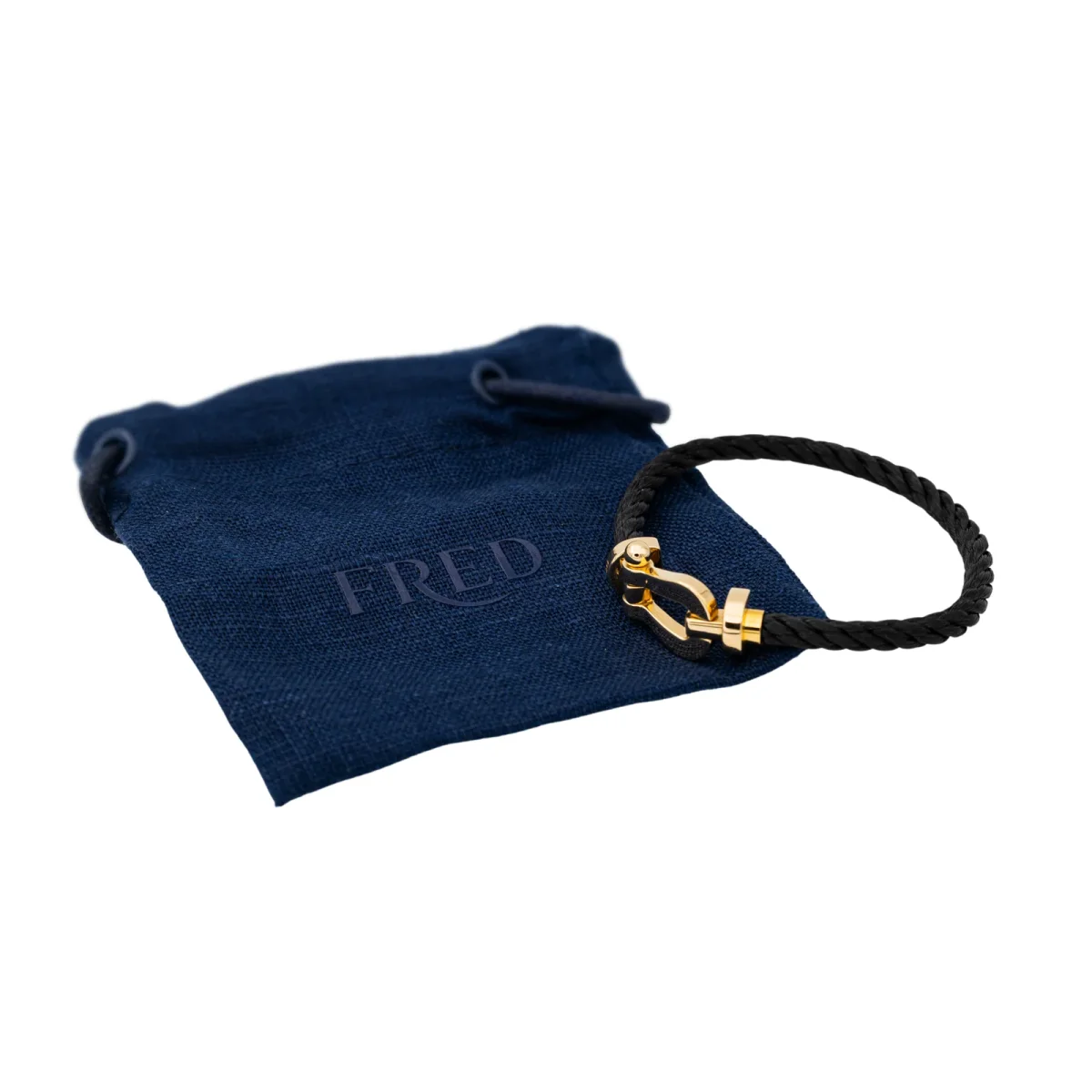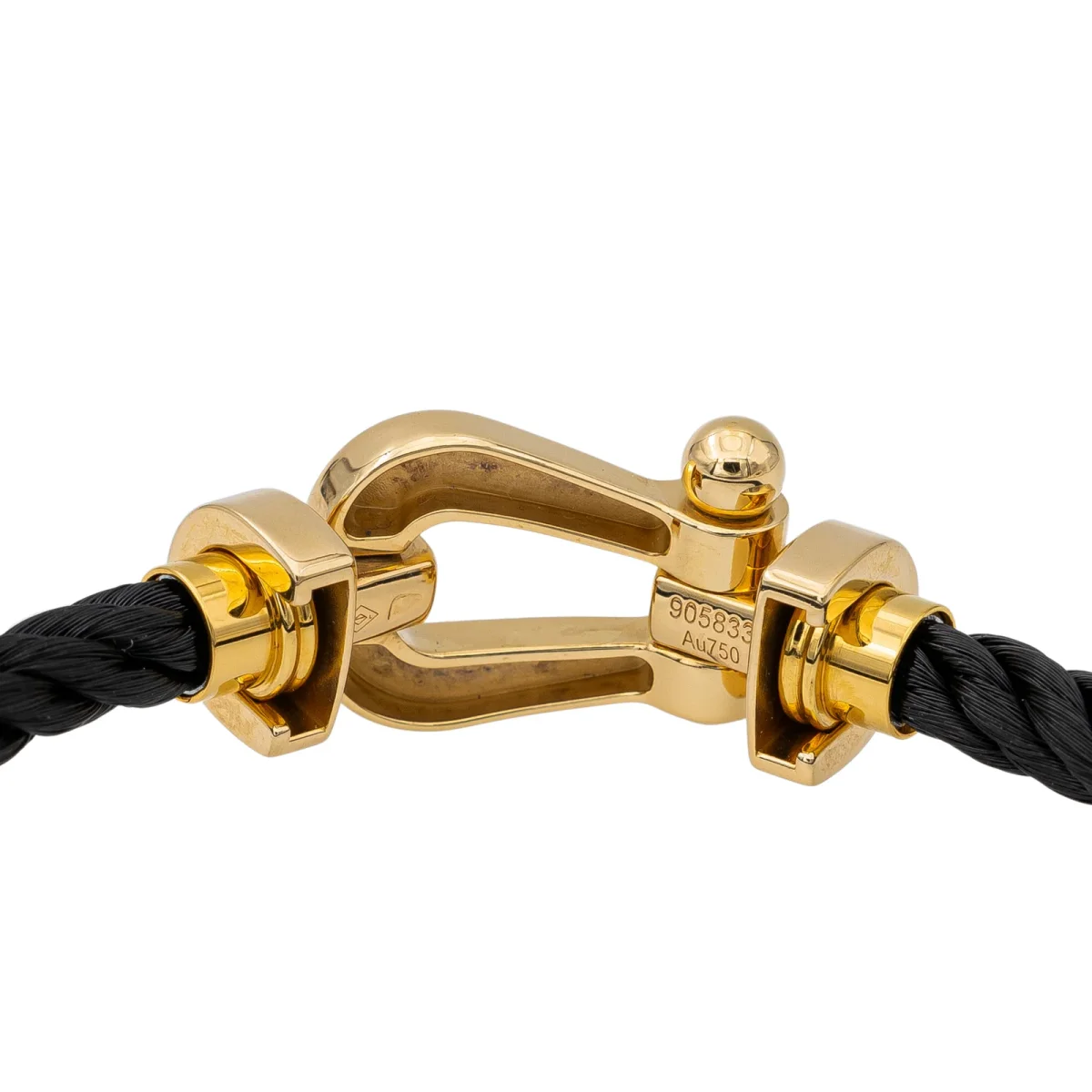 Bracelet signé de la Maison Fred, collection Force 10 GM, manille en or jaune 750 millièmes (18 carats), dimensions de la manille: 2,60 x 1,30 cm, câble acier noir 15 cm, longueur: 16,50 cm, poids total: 16,23 g, poinçon tête d’aigle, numérotée 905833, valeur neuf: 3250€, excellent état