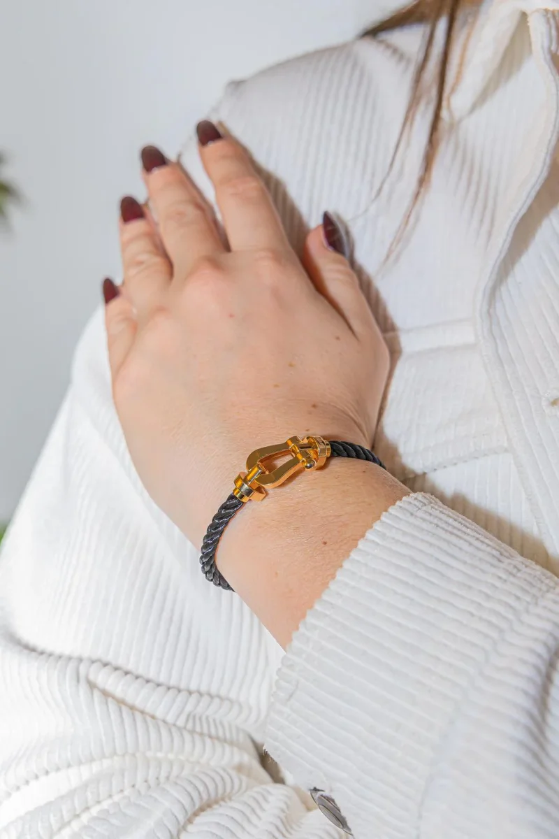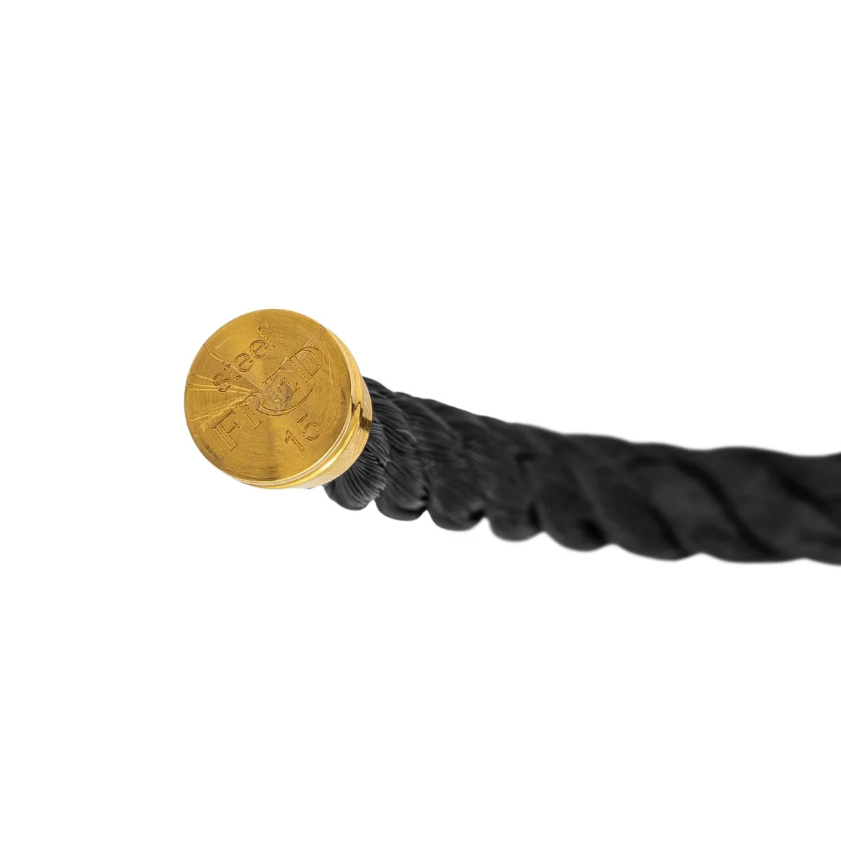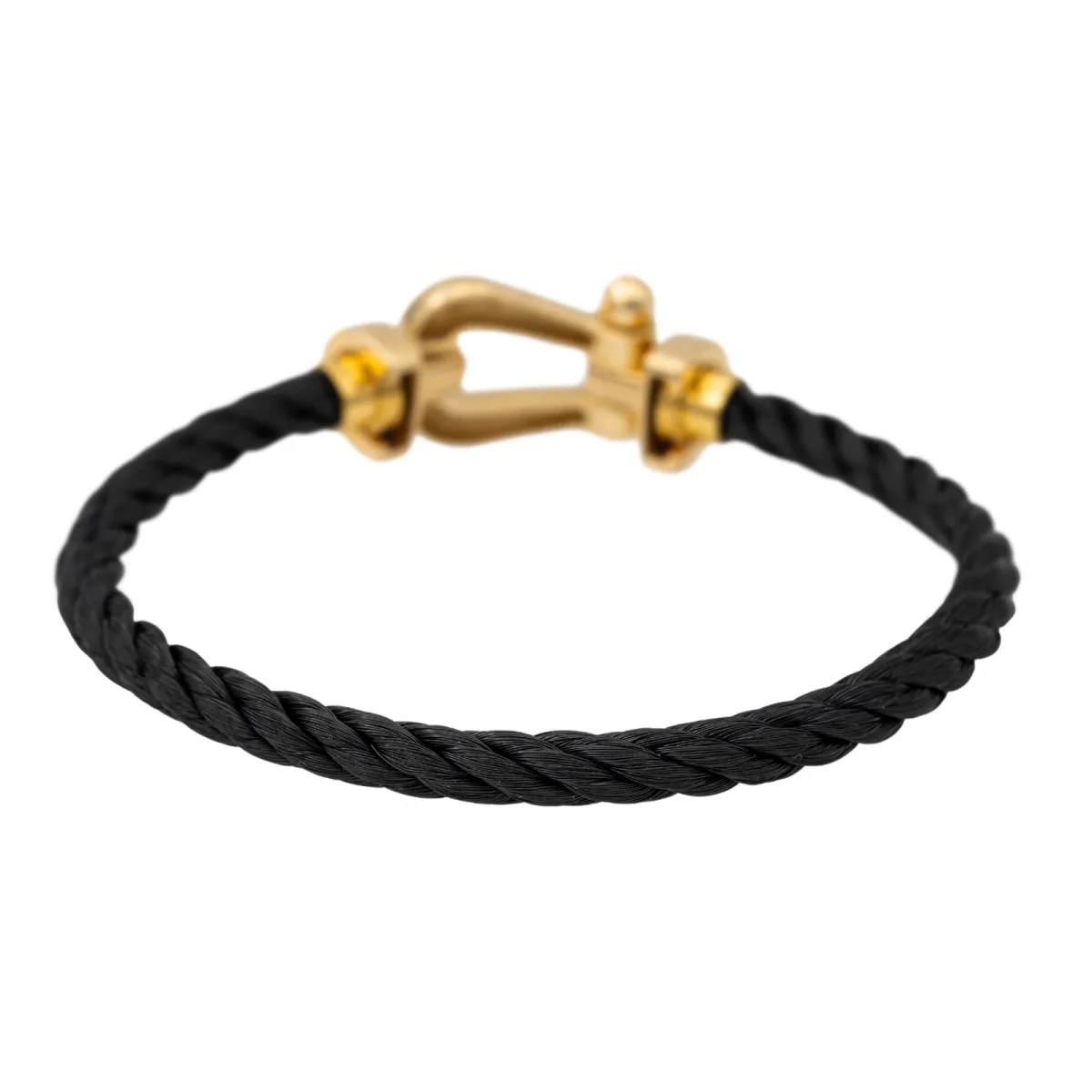 Bracelet signé de la Maison Fred, collection Force 10 GM, manille en or jaune 750 millièmes (18 carats), dimensions de la manille: 2,60 x 1,30 cm, câble acier noir 15 cm, longueur: 16,50 cm, poids total: 16,23 g, poinçon tête d’aigle, numérotée 905833, valeur neuf: 3250€, excellent état