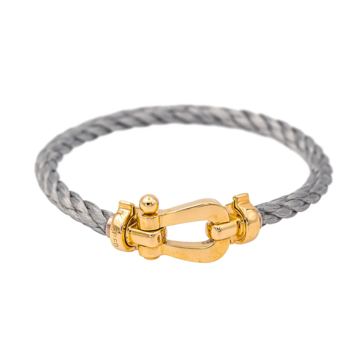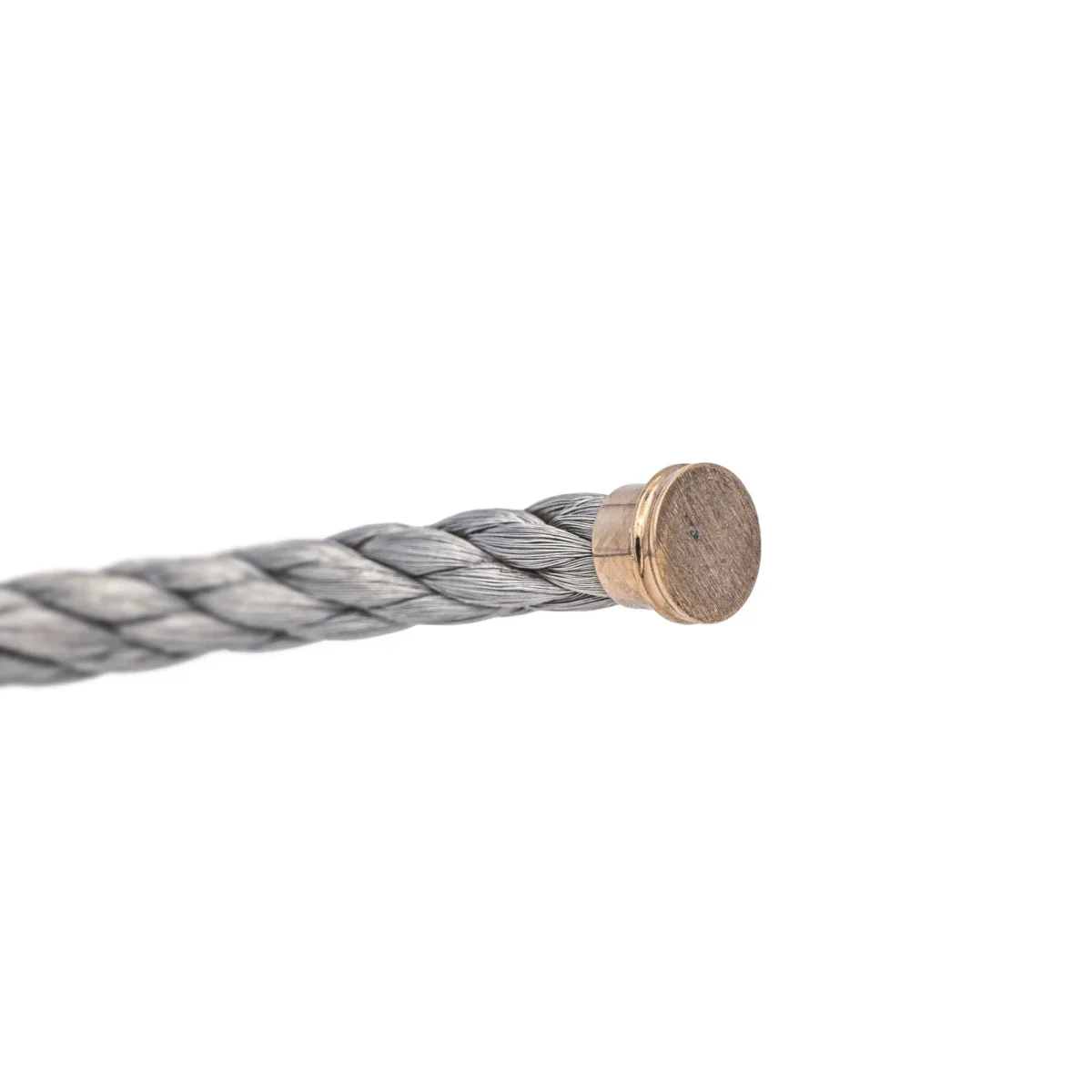 Bracelet signé de la Maison Fred en or jaune 750 millièmes (18 carats), modèle Force 10, câble acier, longueur : 19 cm, largeur : 1,25 cm, épaisseur : 0,43 cm, poids total : 23,36 g, poinçon tête d’aigle, vendu avec écrin d’origine et d’époque, numéroté : 80387, excellent état