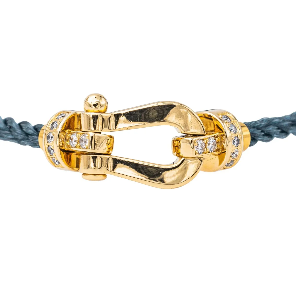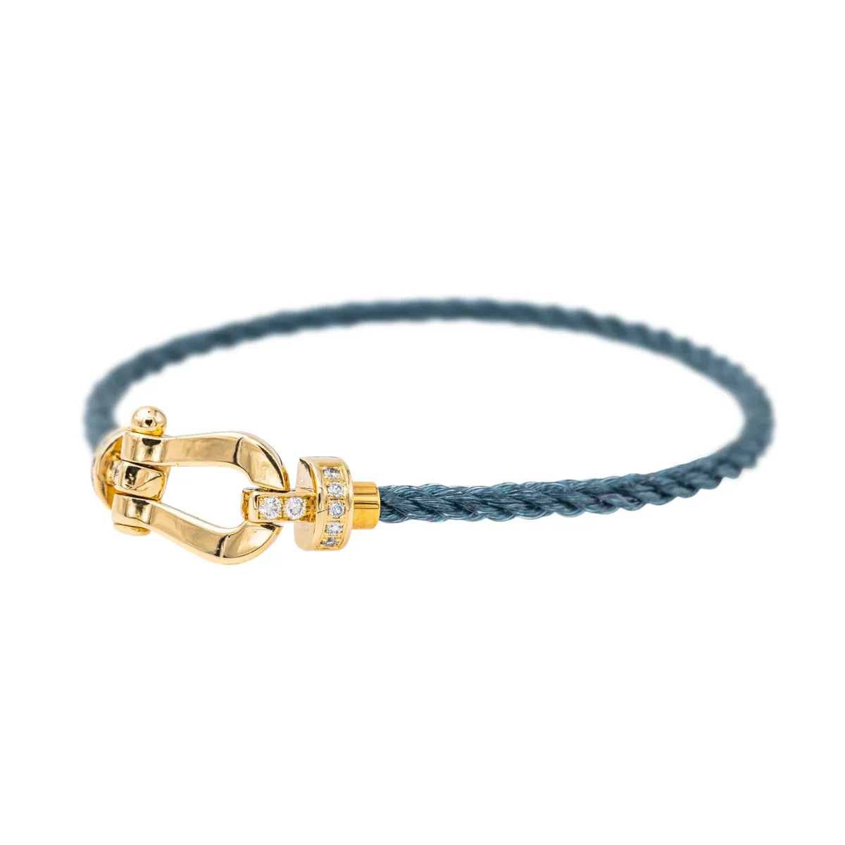 Bracelet signé de la Maison Fred, collection force 10 MM, en or jaune 750 millièmes (18 carats) testé, serti de 14 diamants, taille brillant environ G/VS, pour environ 0,12 ct au total, manille 2 cm x 1 cm, câble gris anthracite, taille 15, poids total : 4,13 g, numéroté: 1057033, livré avec écrin Fred, excellent état