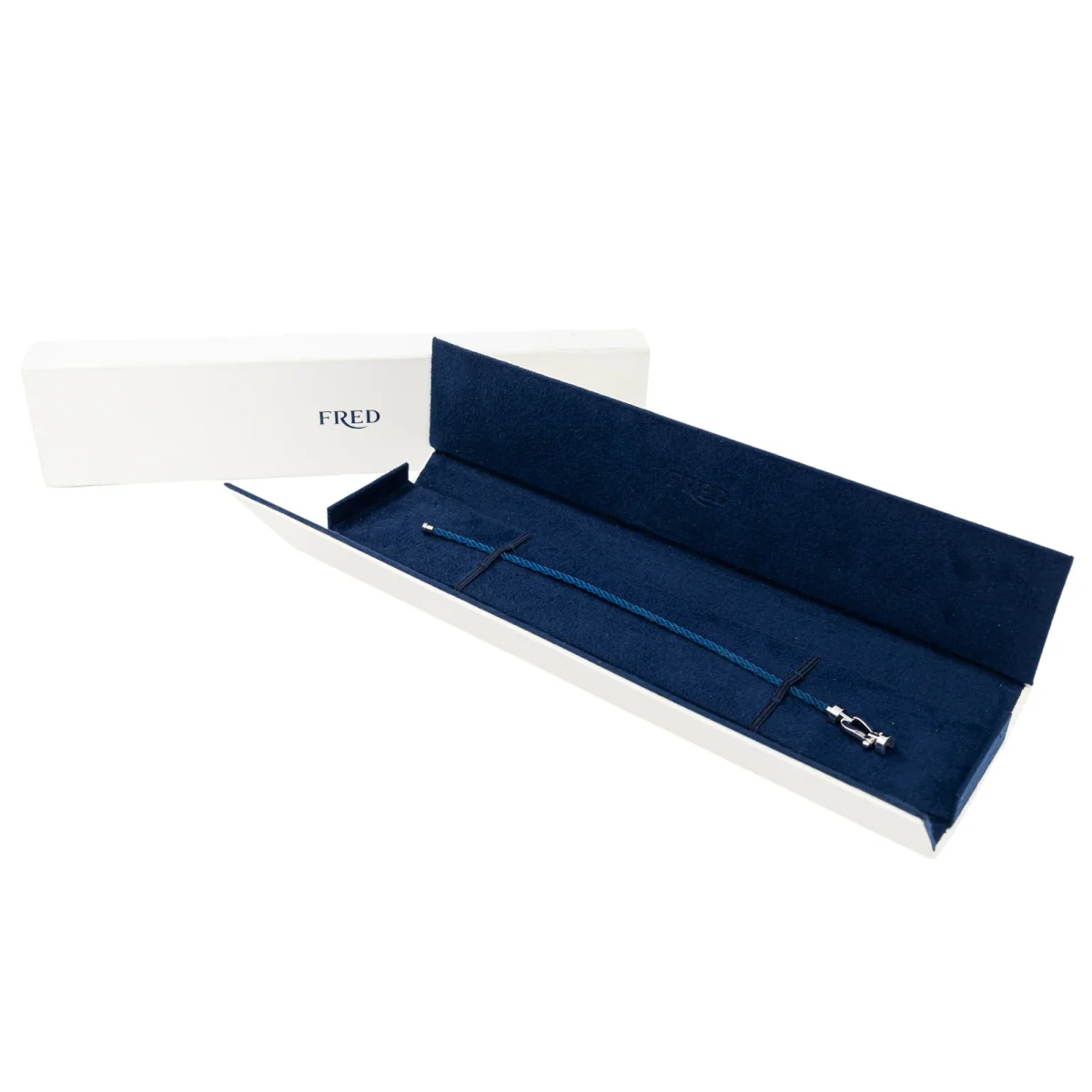Bracelet signé de la Maison Fred, moyen modèle Force 10, manille en or blanc 750 millièmes (18 carats) testé, dimensions de la manille: 2,45 x 0,90 cm, embouts du cable en acier, bracelet corderie bleue marine, longueur: 17,00 cm, poids total: 4,70 g, numérotée 1562256, vendu avec l’écrin d’origine, valeur neuf: 2520€, excellent état