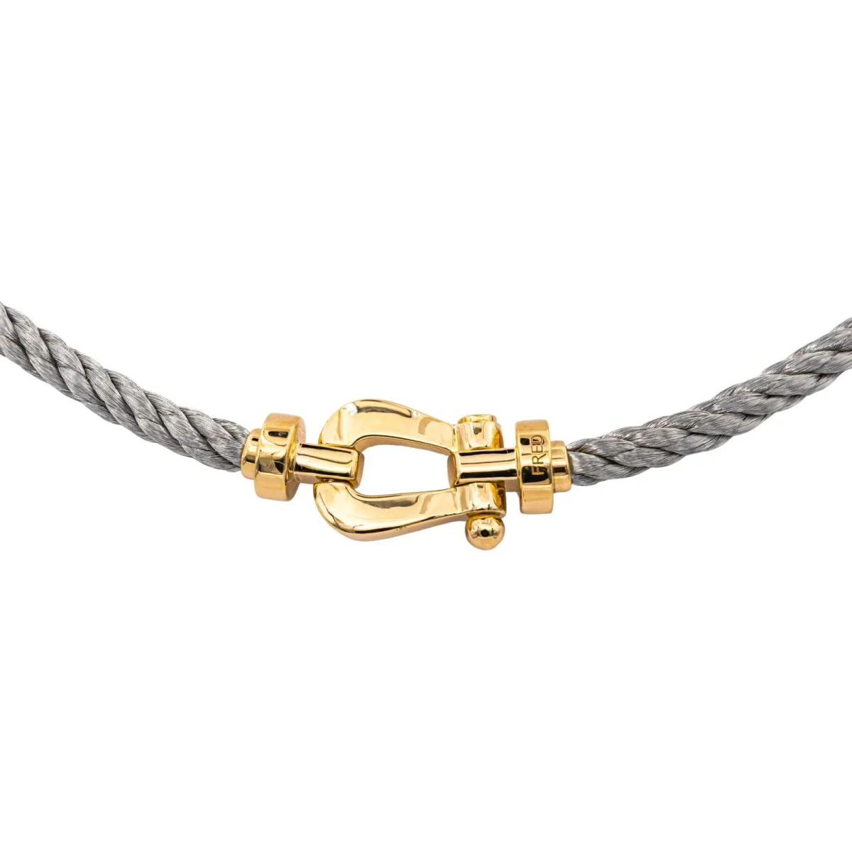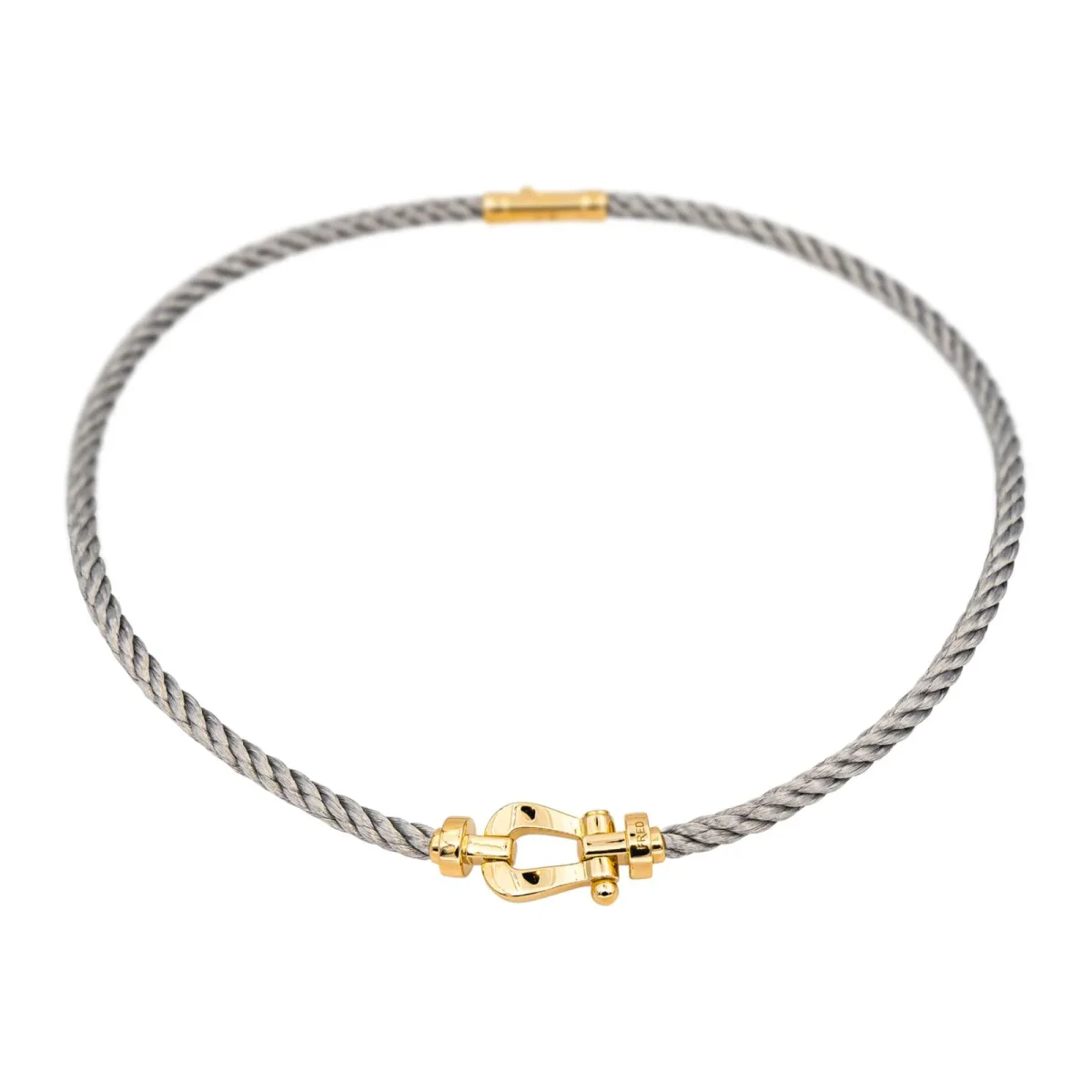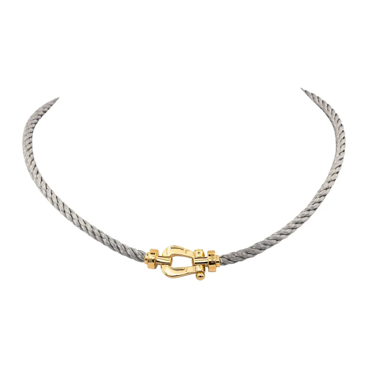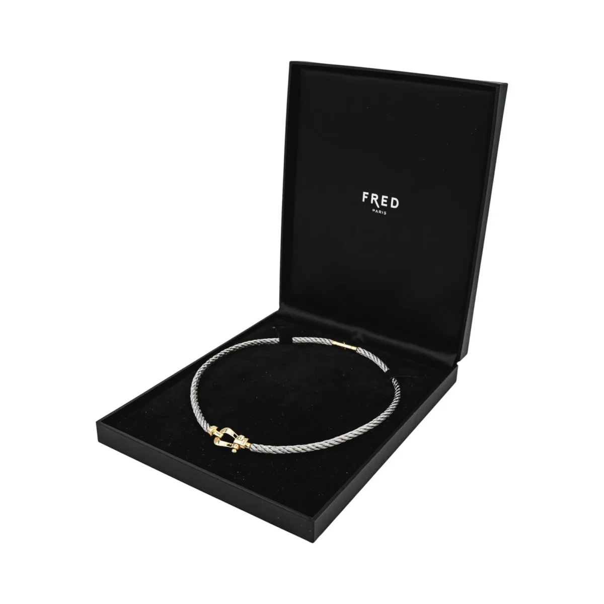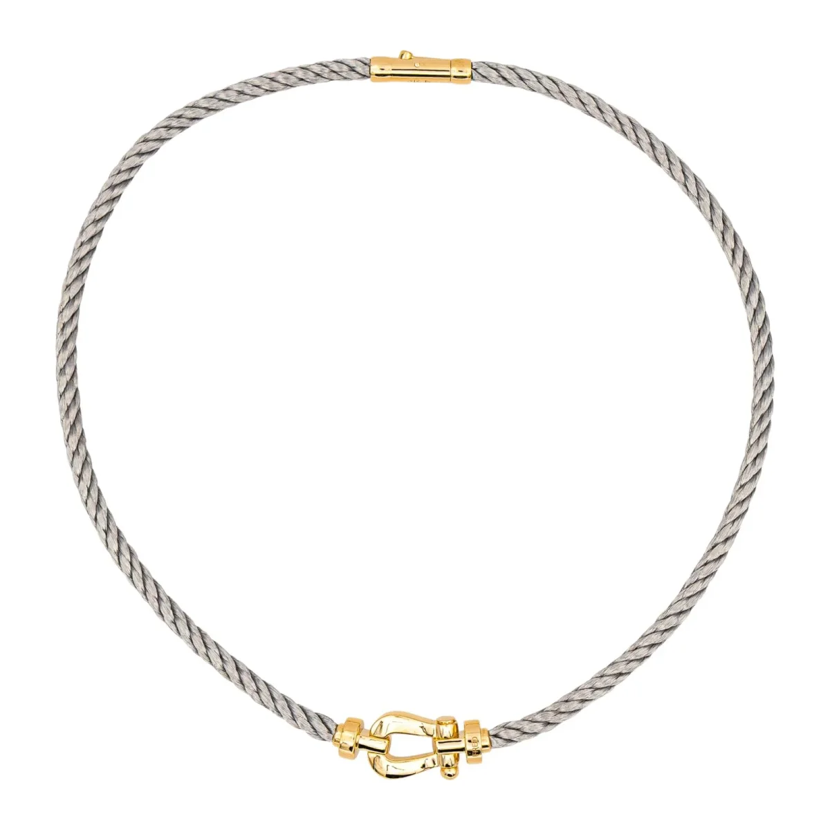 Collier signé de la Maison Fred en acier et or jaune 750 millièmes (18 carats), modèle Force 10, maille torsadée, longueur : 44,00 cm, largeur : 1,35 cm, épaisseur : 0,80 cm, poids total : 41,63 g, poinçon tête d’aigle, vendu avec écrin d’origine et d’époque, numéroté : 907534, excellent état