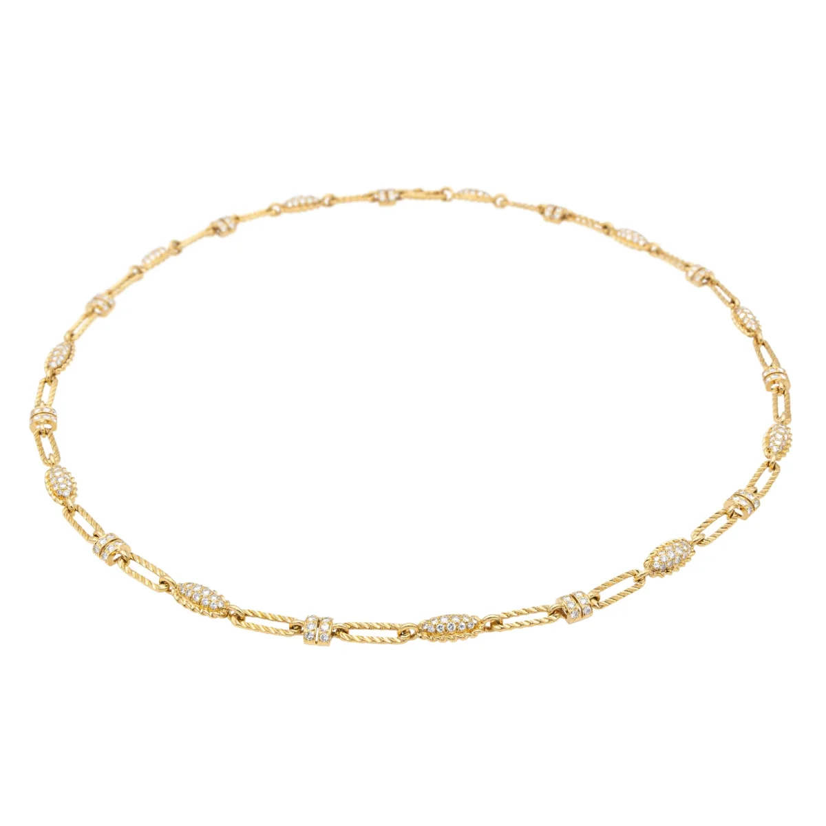 Sautoir signé de la Maison Fred, en or jaune 750 millièmes (18 carats), serti de 264 diamants taille brillant, estimés H/VS, chacun d’environ 0,03 ct, poids total diamants: 7,92 cts, longueur: 72 cm, largeur: 0,84 cm, poids total: 76,40 g, signature partiellement éffacée, poinçon tête d’aigle, excellent état