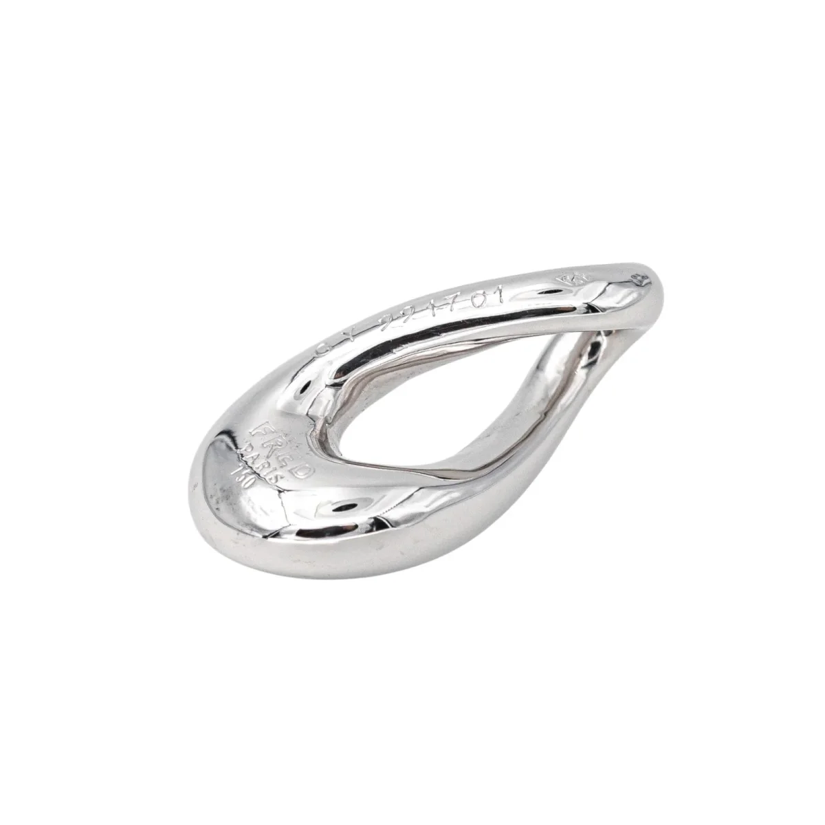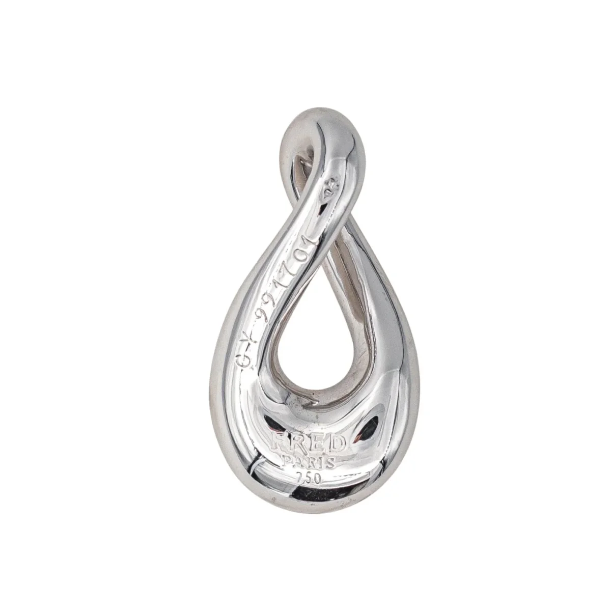 Pendentif signé de la Maison Fred en or blanc 750 millièmes (18 carats), modèle Mouvementé, dimensions avec la bélière : 2,20 cm x 1,15 cm, poids total : 7,25 g, poinçon tête d’aigle,numéroté : GY991701, excellent état