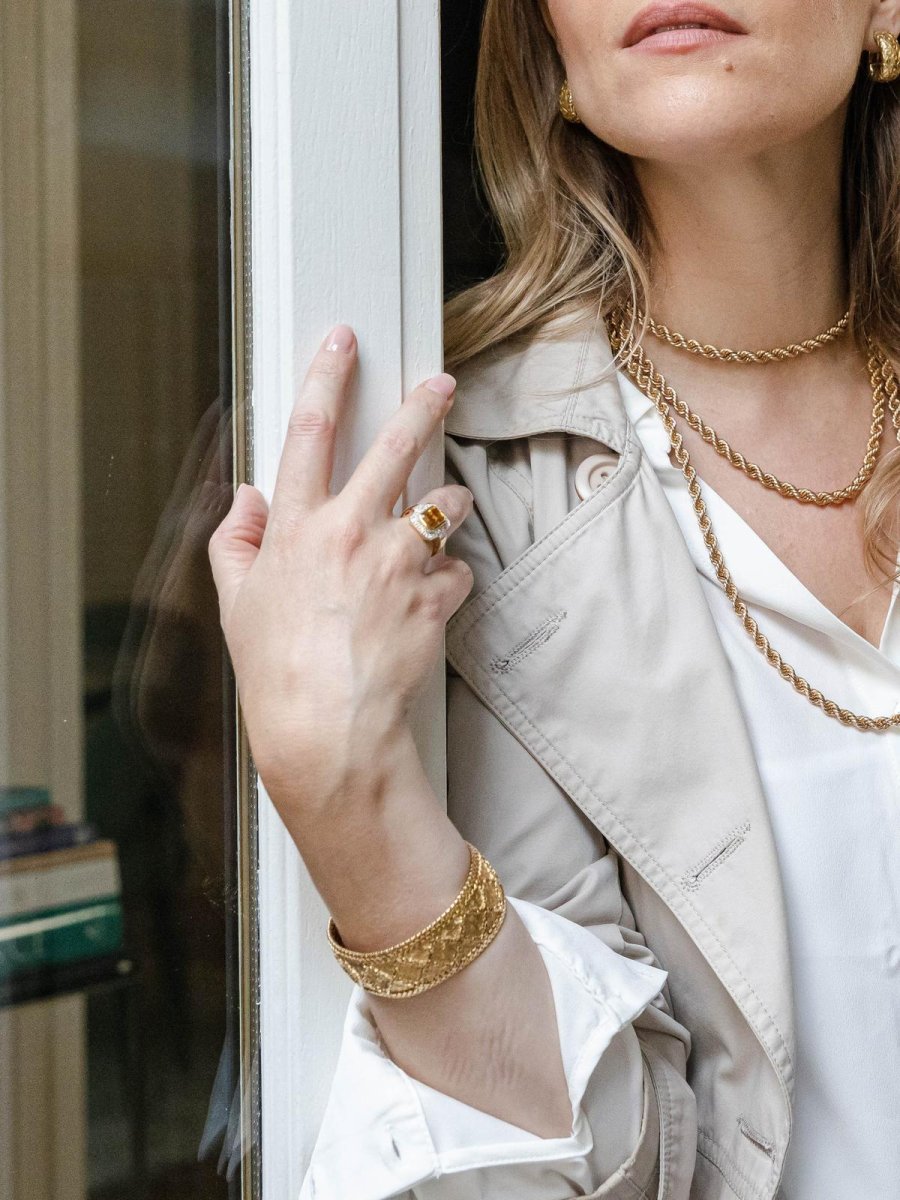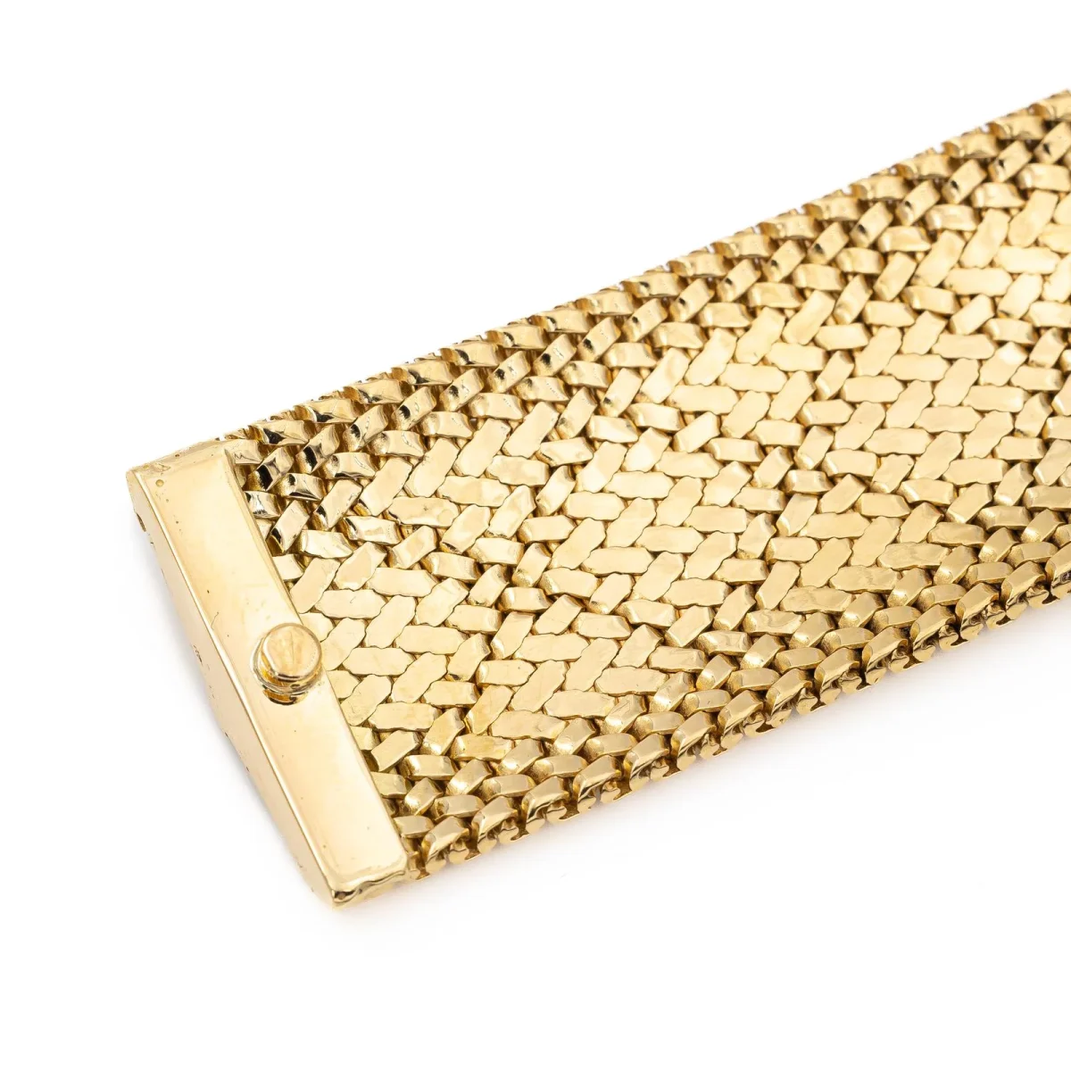 Bracelet signé Gay Frères, en or jaune 750 millièmes (18 carats), vintage, or texturé effet tweed, longueur : 19,50 cm, largueur : 2,50 cm, poids total : 83,28 g, poinçon tête d’aigle, excellent état