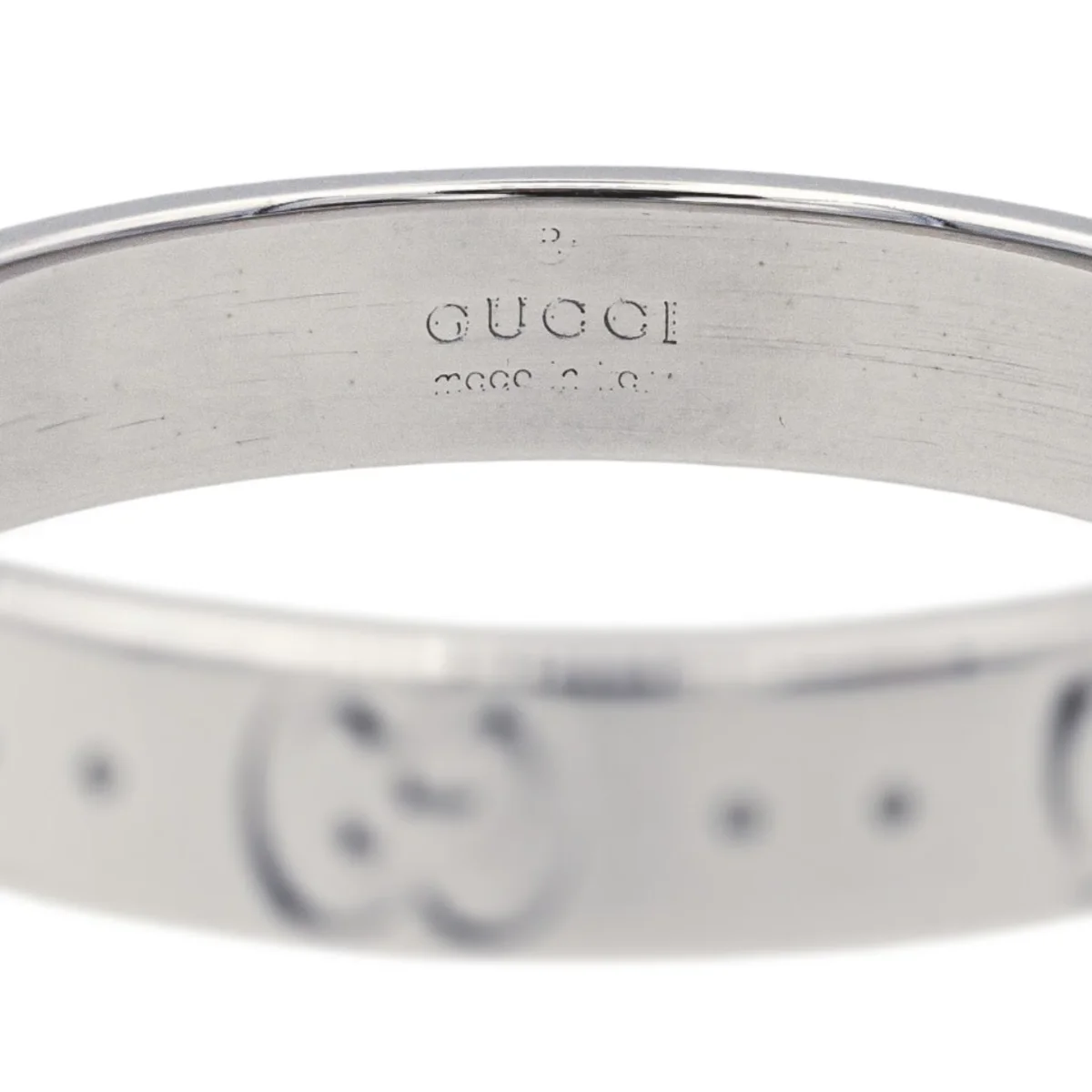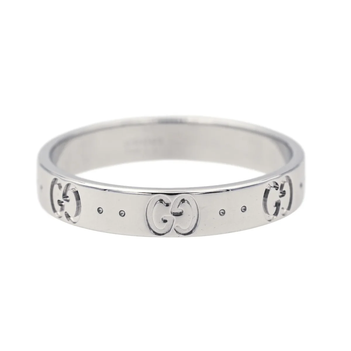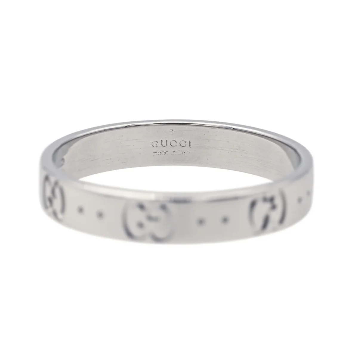 Bague signée de la Maison Gucci en or blanc 750 millièmes (18 carats), modèle Fine Icon, largeur sur le dessus: 0,38 cm, tour de doigt: 61,5, poids total: 4,22 g, poinçon tête de Saint Bernard, excellent état