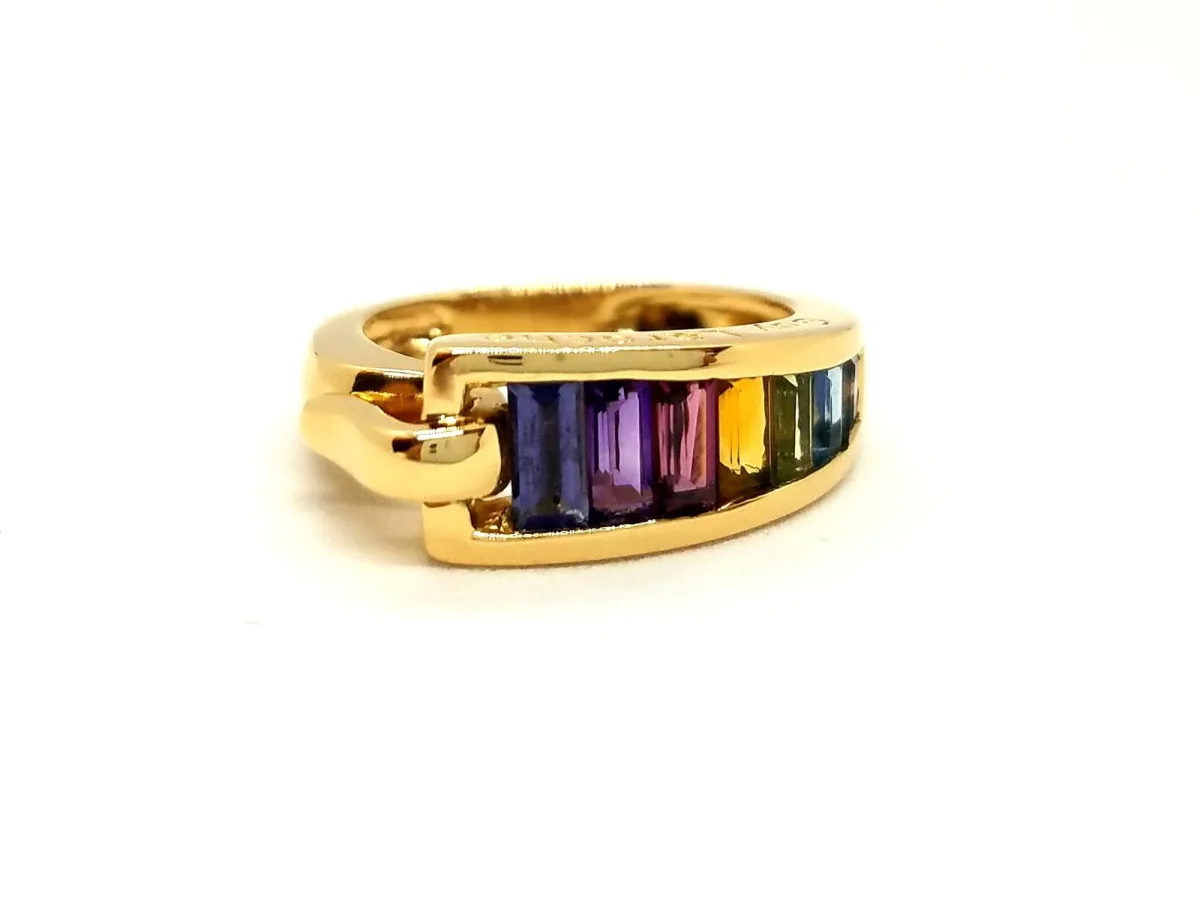 Bague signée Guy Laroche, en or jaune 750 millièmes (18 carats), serti de 7 pierres fines en baguette pour environ 0,75 ct au total, améthystes, citrines, péridot et topaze, Taille: 49, largeur sur le dessus: 0,72 cm, poids total: 4,68 g, poinçon tête d’aigle, excellent état