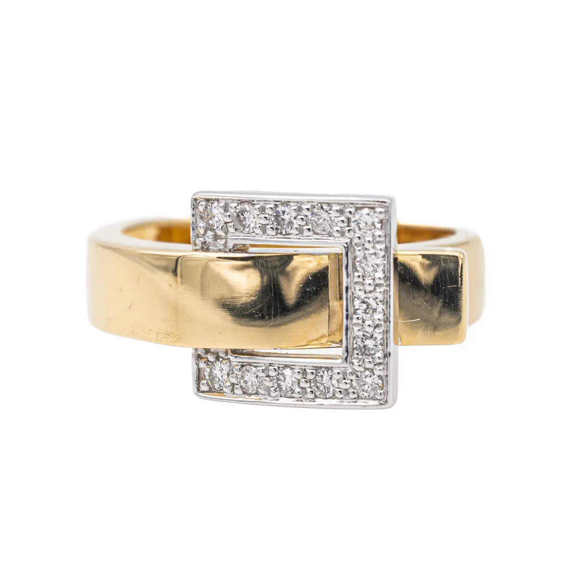 Bague signé de la Maison Guy Laroche, en or blanc et or jaune 750 millièmes (18 carats), 13 diamants taille brillant, environ H-VS, d’un poids total d’environ 0,13 ct, (chaque diamant d’un poids d’environ 0,01 ct), largeur sur le dessus : 1,04 cm, tour de doigt : 52, poids total : 5,84 g, poinçon tête d’aigle, excellent état