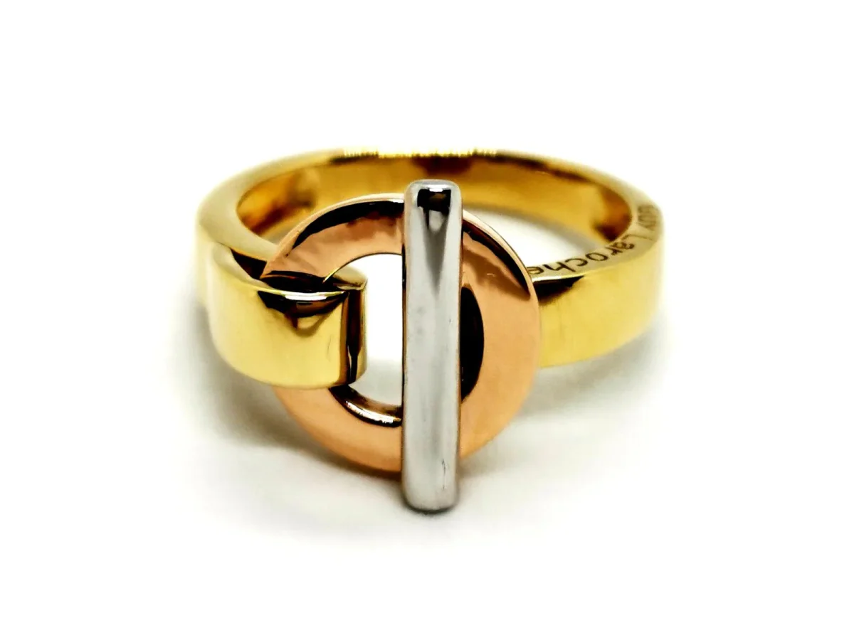 Bague signée de la maison Guy Laroche, en or 750 millièmes (18 carats), or jaune, or rose, et or blanc, tour de doigt: 54, largeur sur le dessus: 1,41 cm, poids total: 5,37 g, poinçon hibou, excellent état