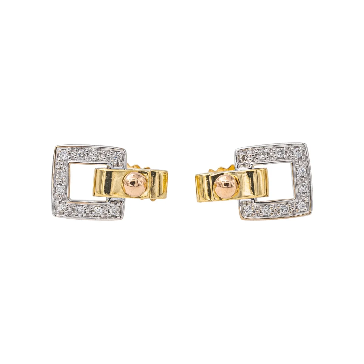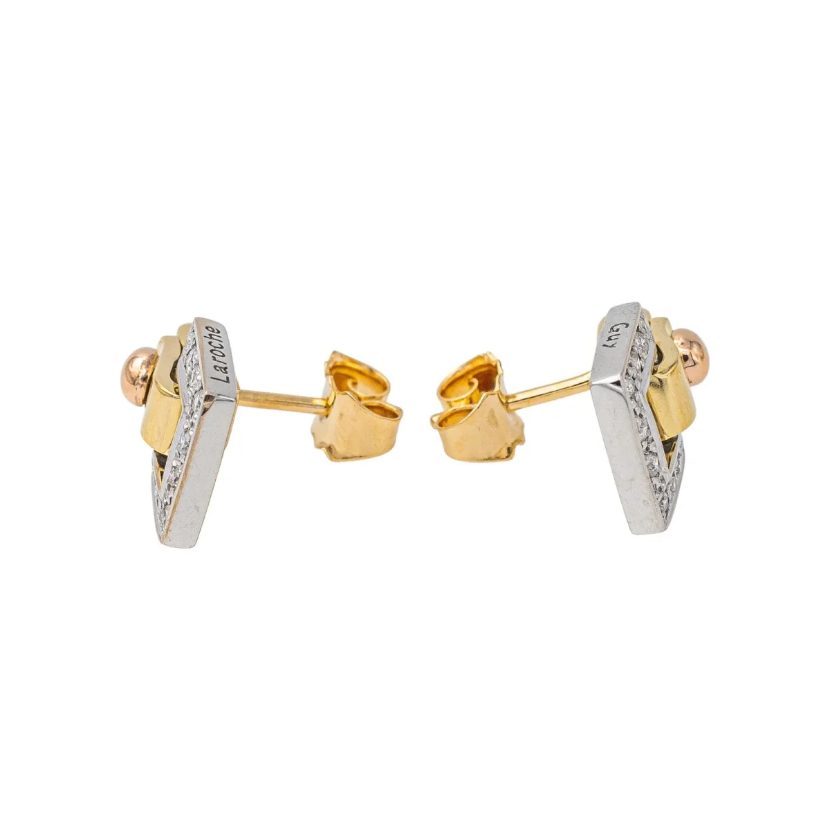 Boucles d’oreilles signées de la Maison Guy Laroche en or jaune, blanc et rose 750 millièmes (18 carats) testé, modèle Boucle de ceinture, serties de 20 diamants taille brillant, environ H-VS chaque diamant d’un poids d’environ 0,01 ct, poids total de diamants environ : 0,20 ct, dimensions : 1,40 cm x 0,91 cm, poids total : 4,63 g, excellent état
