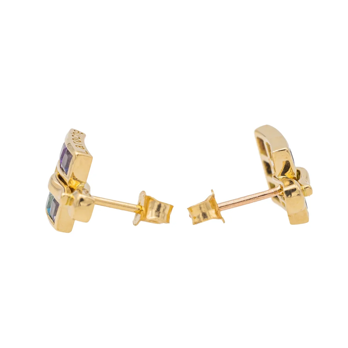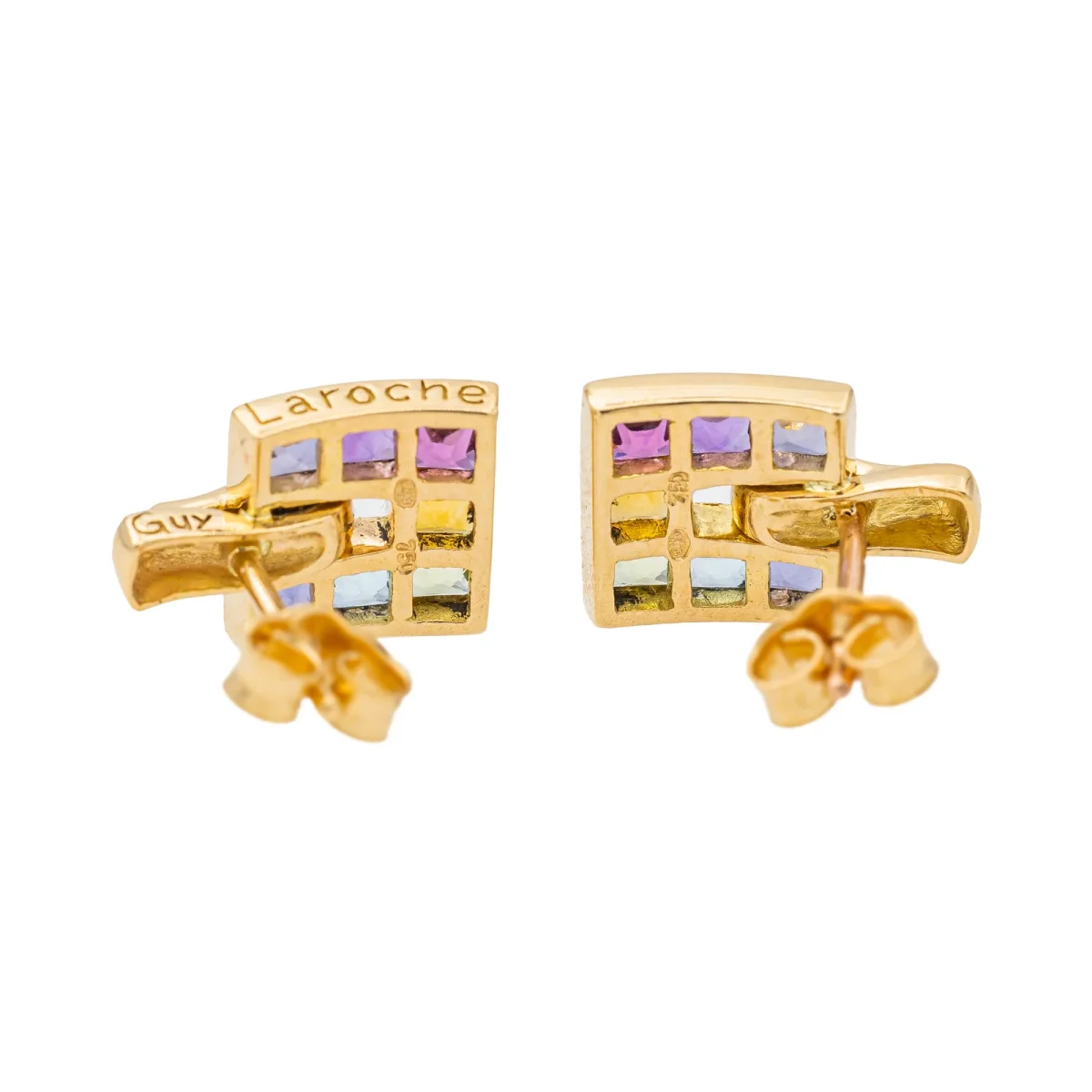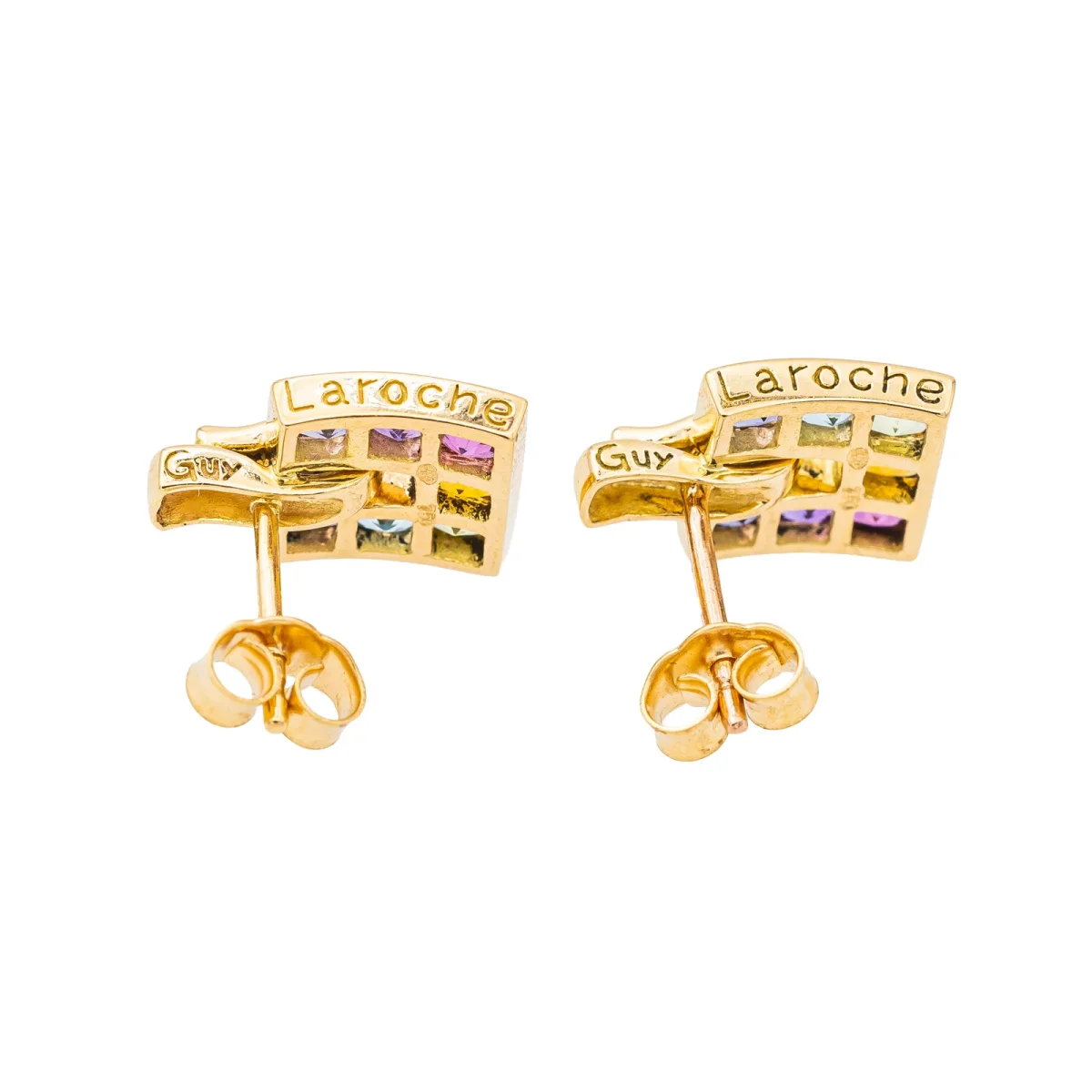 Boucles d’oreilles signées de la maison Guy Laroche, en or jaune 750 millièmes (18 carats) testé, serties de 4 cordiérites, 2 améthystes, 2 grenats, 2 citrines, 2 péridots et 2 topazes, chaque gemme taille carrée et calibrée d’environ 0,02 ct chacune, poids total des gemmes : 0,28 ct, dimensions : 1,29 cm x 0,89 cm, poids total : 3,48 g, excellent état