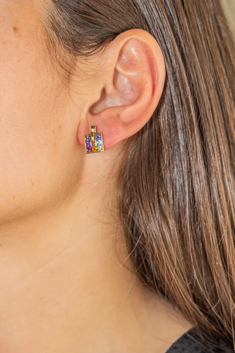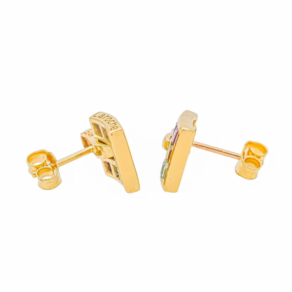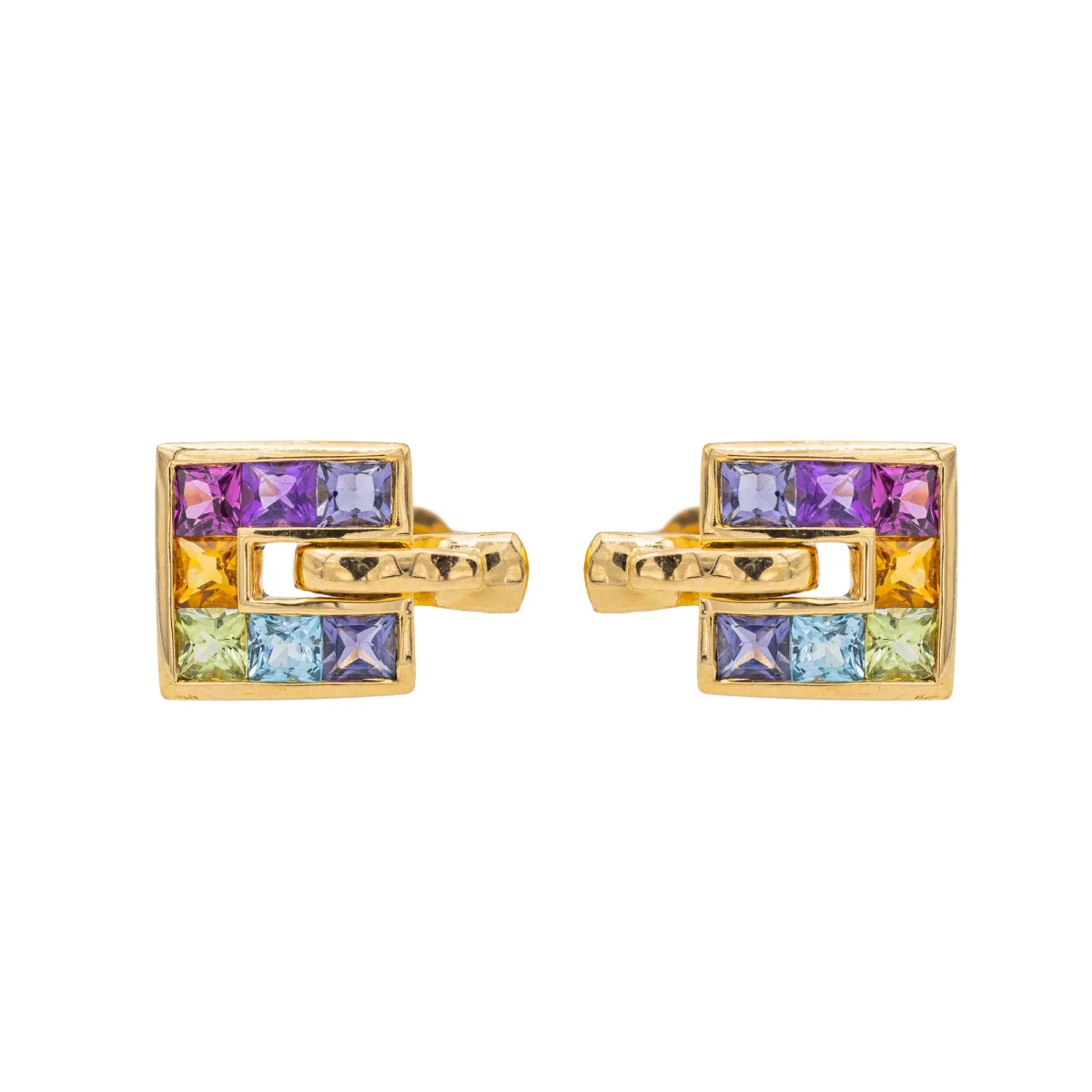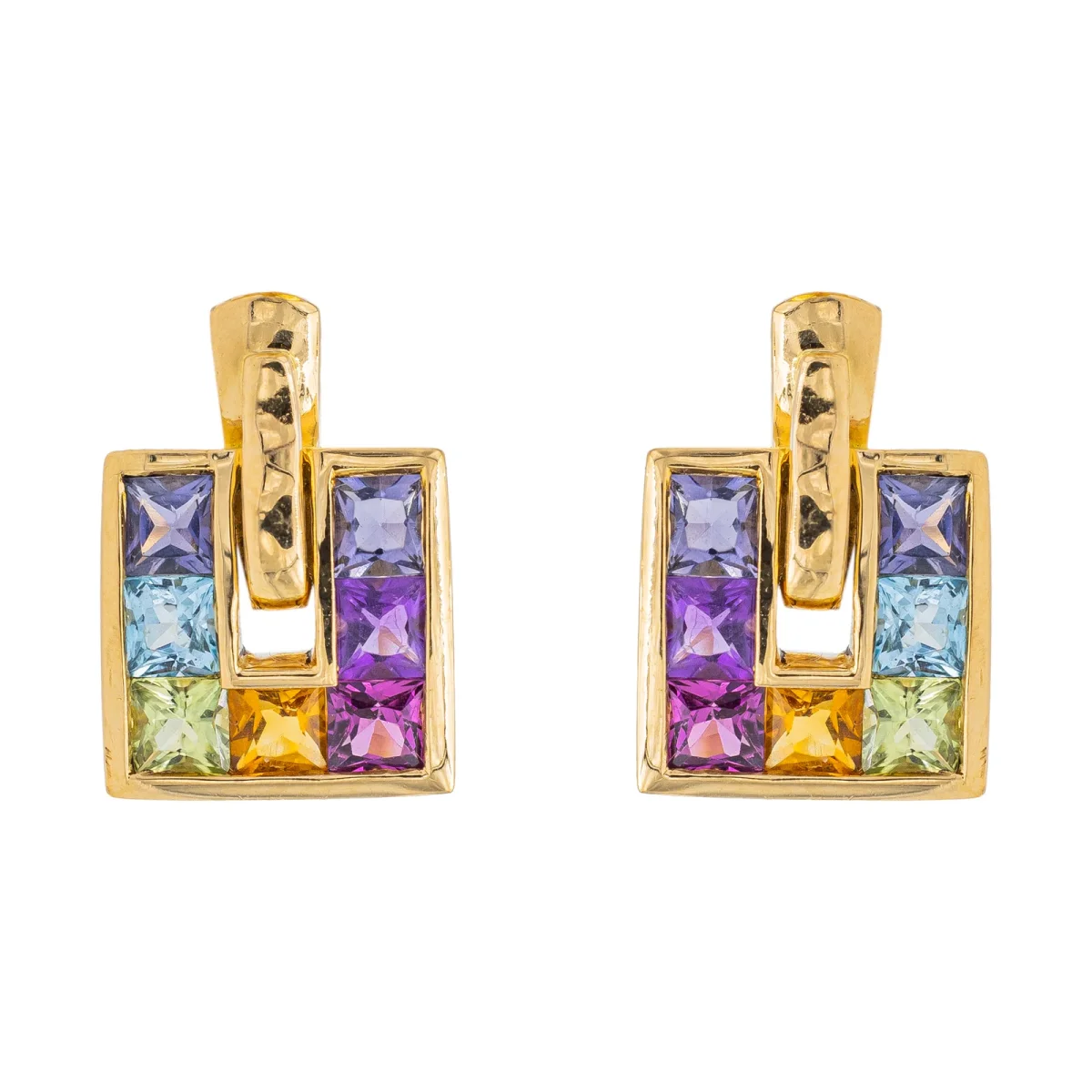 Boucles d’oreilles signées de la maison Guy Laroche, en or jaune 750 millièmes (18 carats) testé, serties de 4 cordiérites, 2 améthystes, 2 grenats, 2 citrines, 2 péridots et 2 topazes, chaque gemme taille carrée et calibrée d’environ 0,02 ct chacune, poids total des gemmes : 0,28 ct, dimensions : 1,29 cm x 0,89 cm, poids total : 3,48 g, excellent état