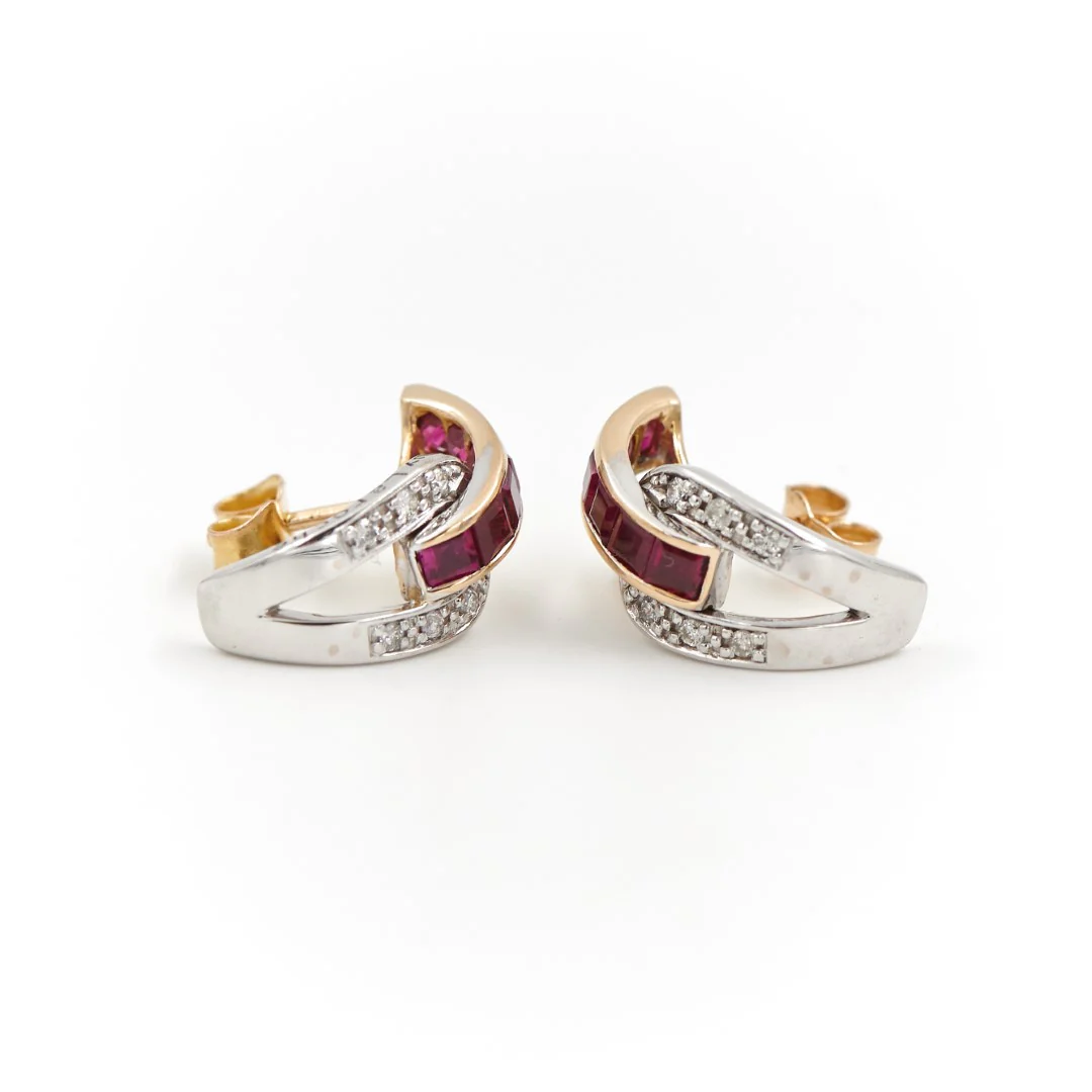 Boucles d’oreilles de la maison Guy Laroche, en or jaune et or blanc 750 millièmes (18 carats) testé, puces d’oreilles, 14 diamants brillant d’environ 0,01 ct chacun, environ H-SI, poids total diamants : 0,14 ct, 12 rubis rectangulaire d’environ 0,08 ct chacun, poids total rubis : 0,96 ct, hauteur : 1,62 cm, largeur : 0,79 cm, poids total bijou : 5,05 g, excellent état