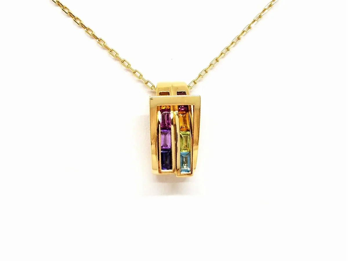 Collier en or jaune 750 millièmes (18 carats), pendentif signé Guy Laroche, serti de 8 pierres fines en baguette pour environ 0,80 ct au total, améthystes, citrines, péridot et topaze, longueur chaîne: 50 cm, largeur chaîne: 0,11 cm, dimensions pendentif: 1,67 cm x 0,89 cm, poids total: 6,55 g, poinçon tête d’aigle, excellent état