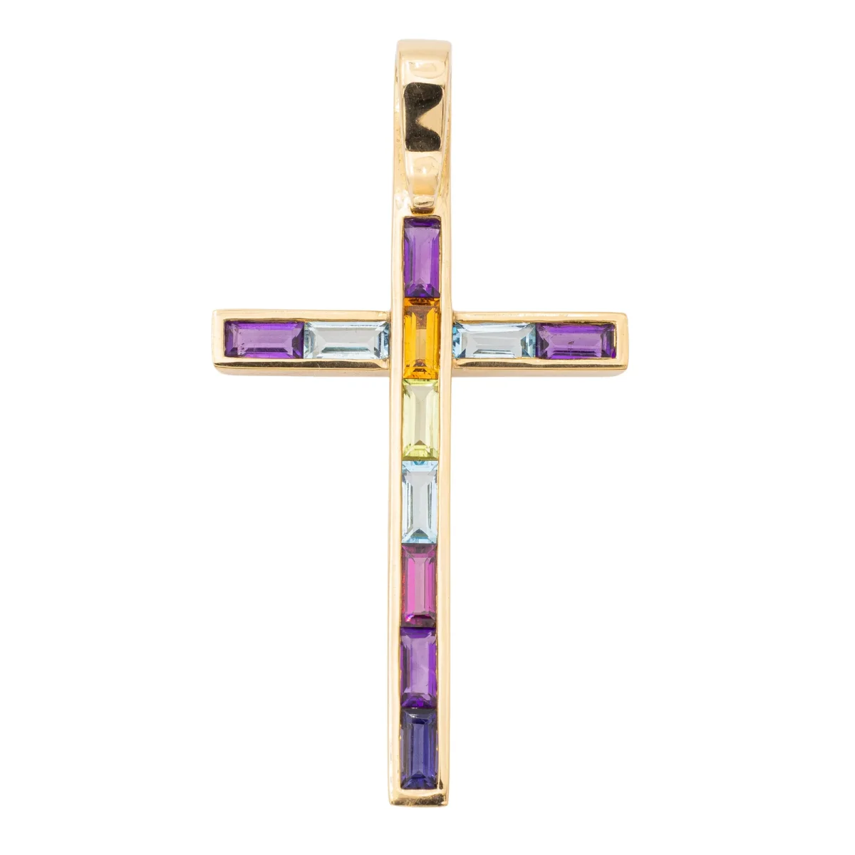 Pendentif signé de la Maison Guy Laroche en forme de croix serti de pierres de couleur taille rectangle, en or jaune 750 millièmes (18 carats), 5 améthystes d’un poids total d’environ 0,45 ct, 1 grenat d’un poids d’environ 0,14 ct, 3 topazes bleues d’un poids total d’environ: 0,39 ct, 1 péridot d’un poids d’environ 0,12 ct et 1 citrine d’un poids d’environ 0,09 ct, dimensions avec la bélière: 4,7 cm x 2,5 cm, poids total: 5,09 g, poinçon tête d’aigle, excellent état