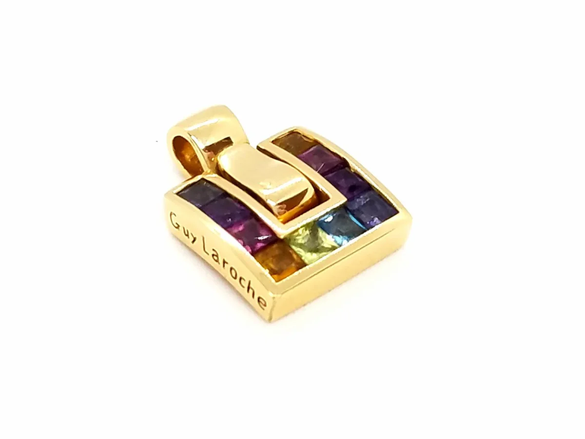 Pendentif signé de la maison Guy Laroche, en or jaune 750 millièmes (18 carats), serti d’environ 0,80 ct de pierres fines taillées carrées, 6 amétystes d’environ 0,08 ct chacune, deux citrines d’environ 0,08 ct chacune, un péridot d’environ 0,08 ct, et une topaze d’environ 0,08 ct, dimensions: 1,15 cm x 1,15 cm, hauteur bélière incluse: 1,61cm, poids total: 4,01 g, poinçonné, excellent état