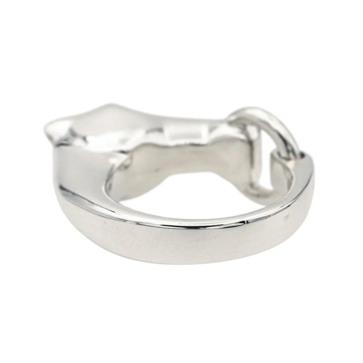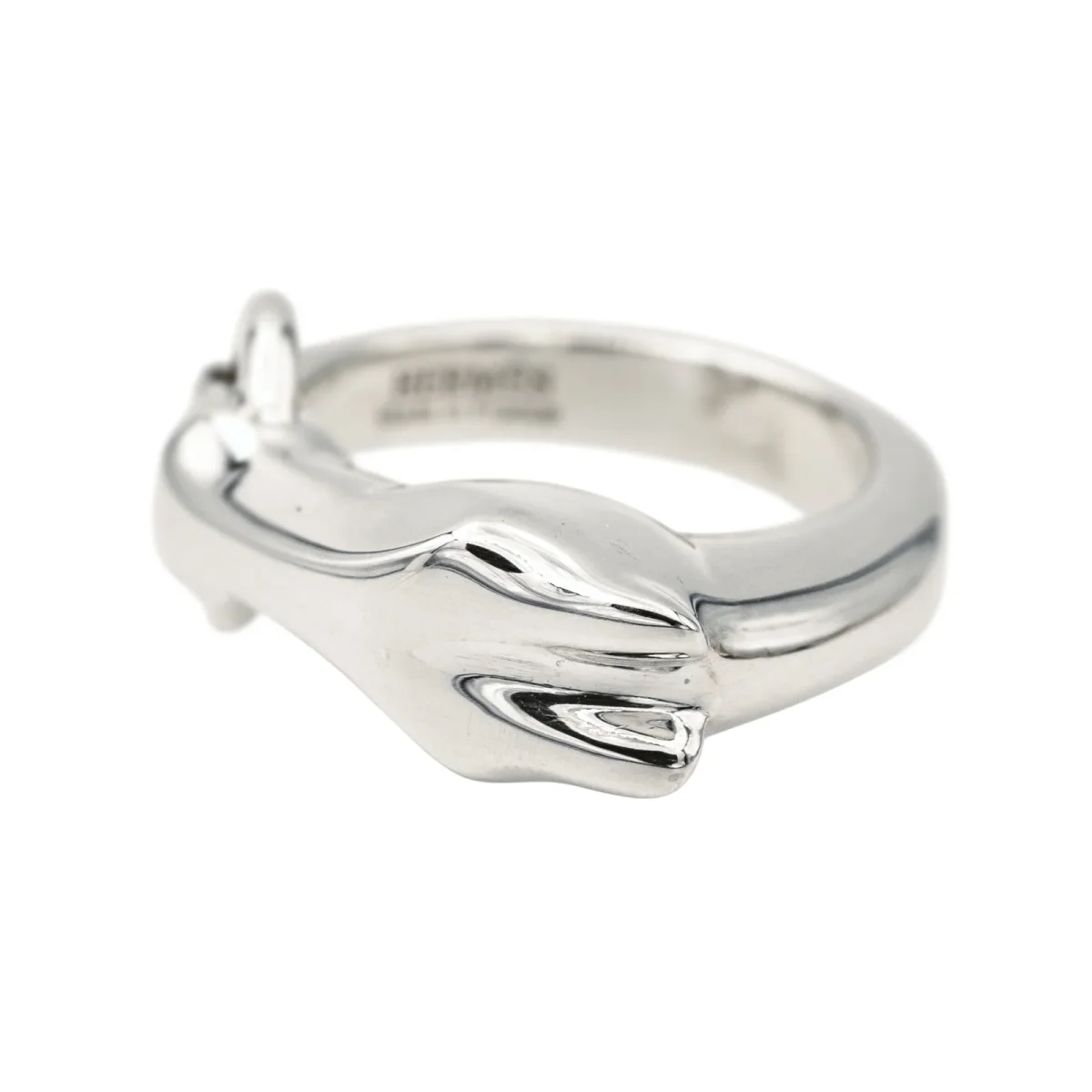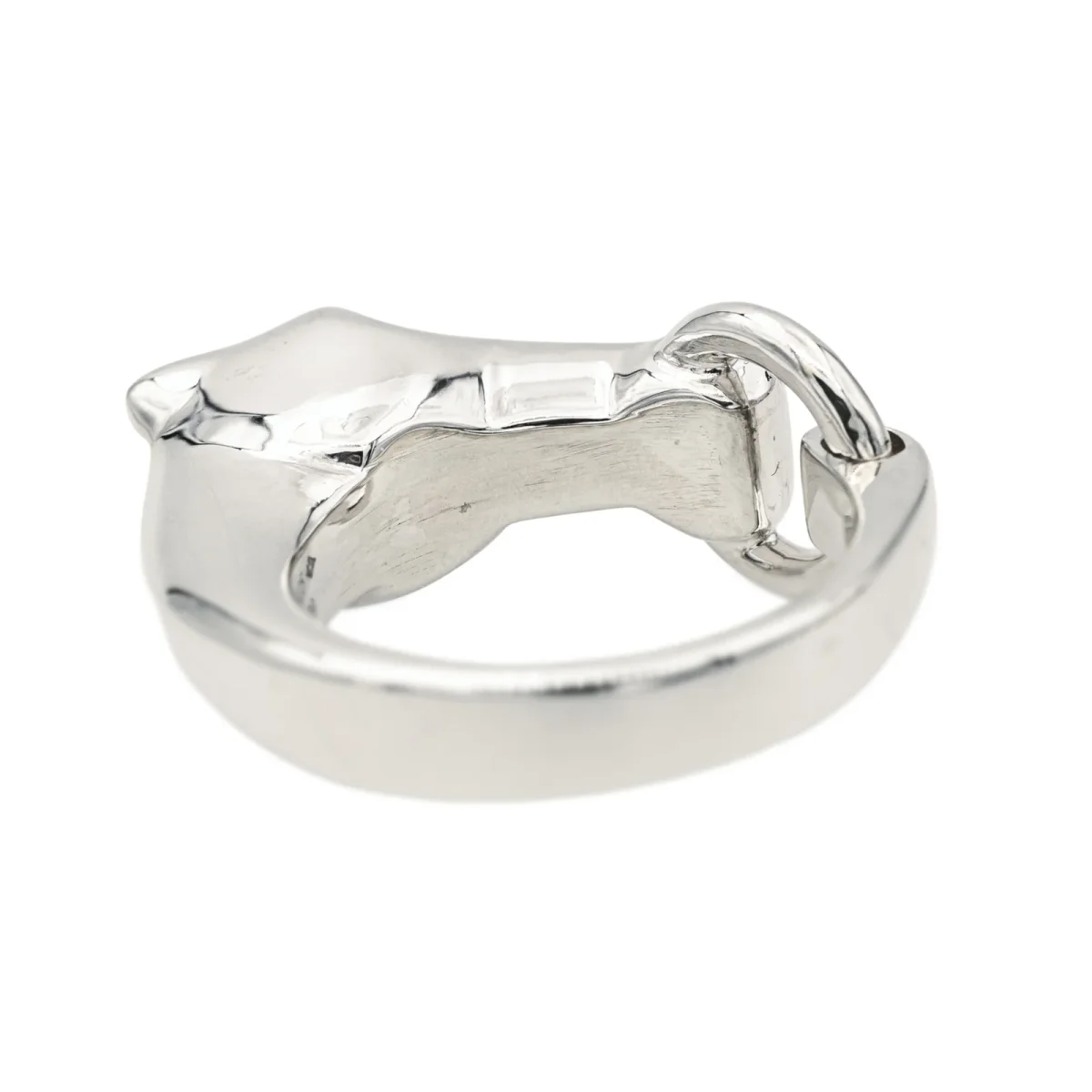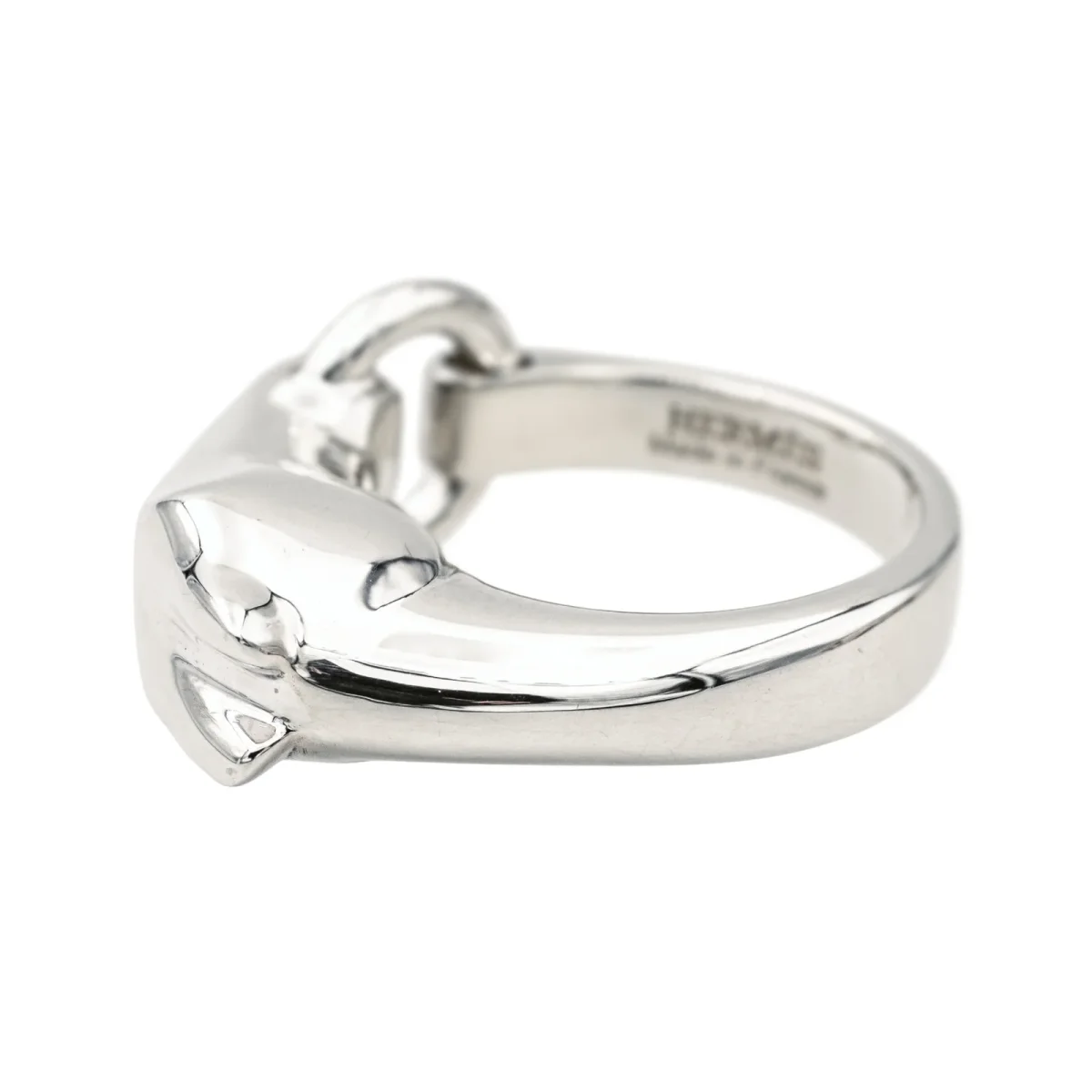Bague signée de la Maison Hermès en argent 925 millièmes, modèle galop petit modèle, largeur sur le dessus : 1,07 cm, tour de doigt : 56, poids total : 14,89 g, vendue avec écrin d’origine et d’époque, numérotée : 220439769, excellent état