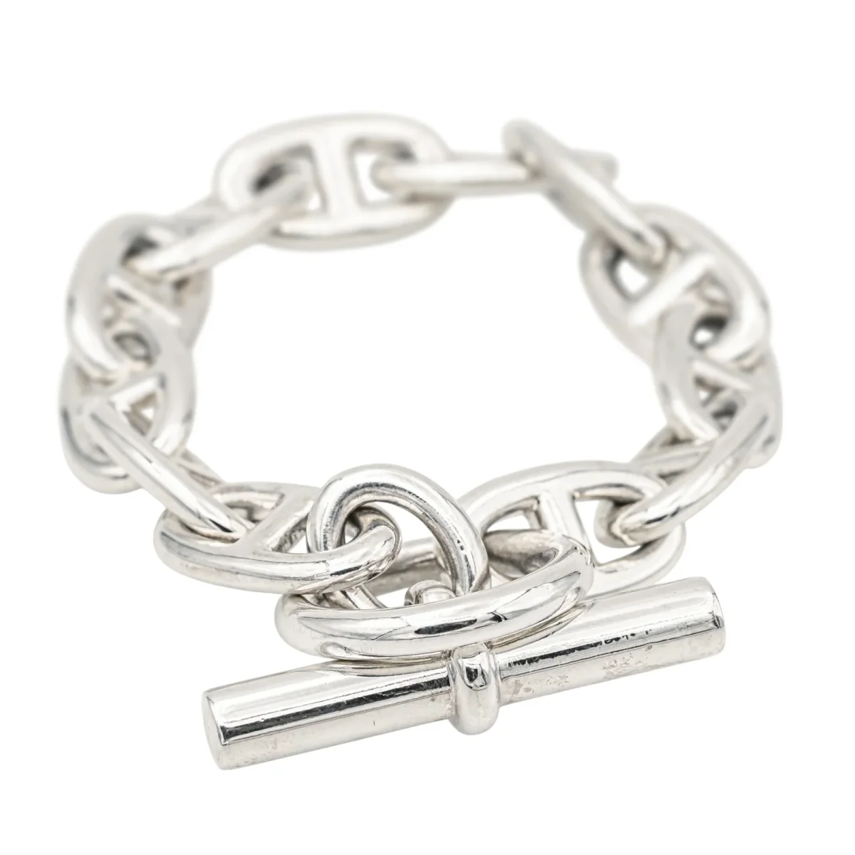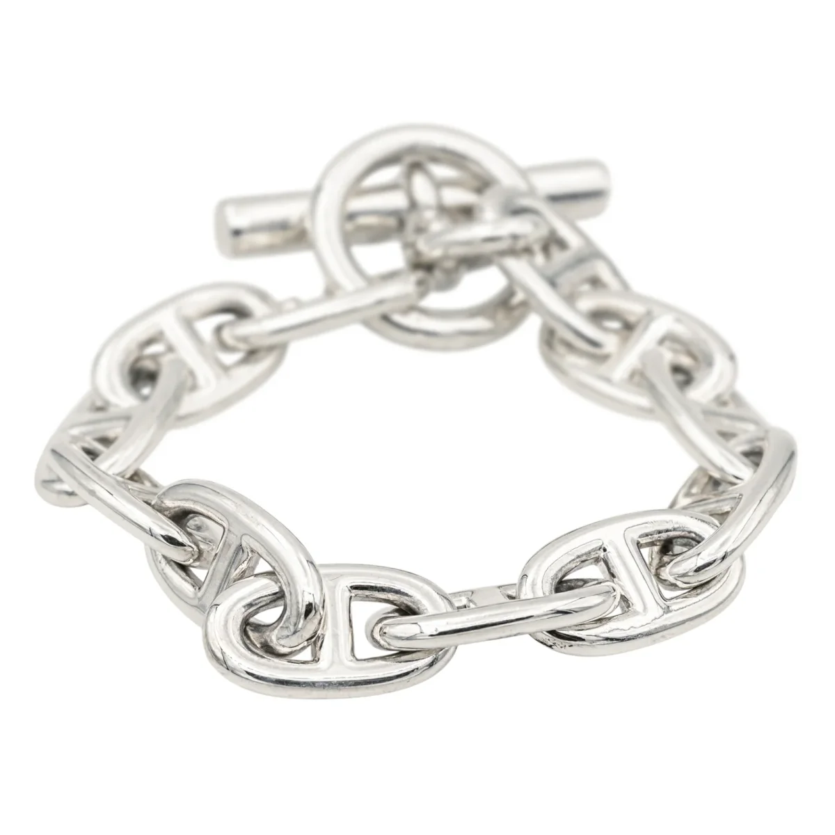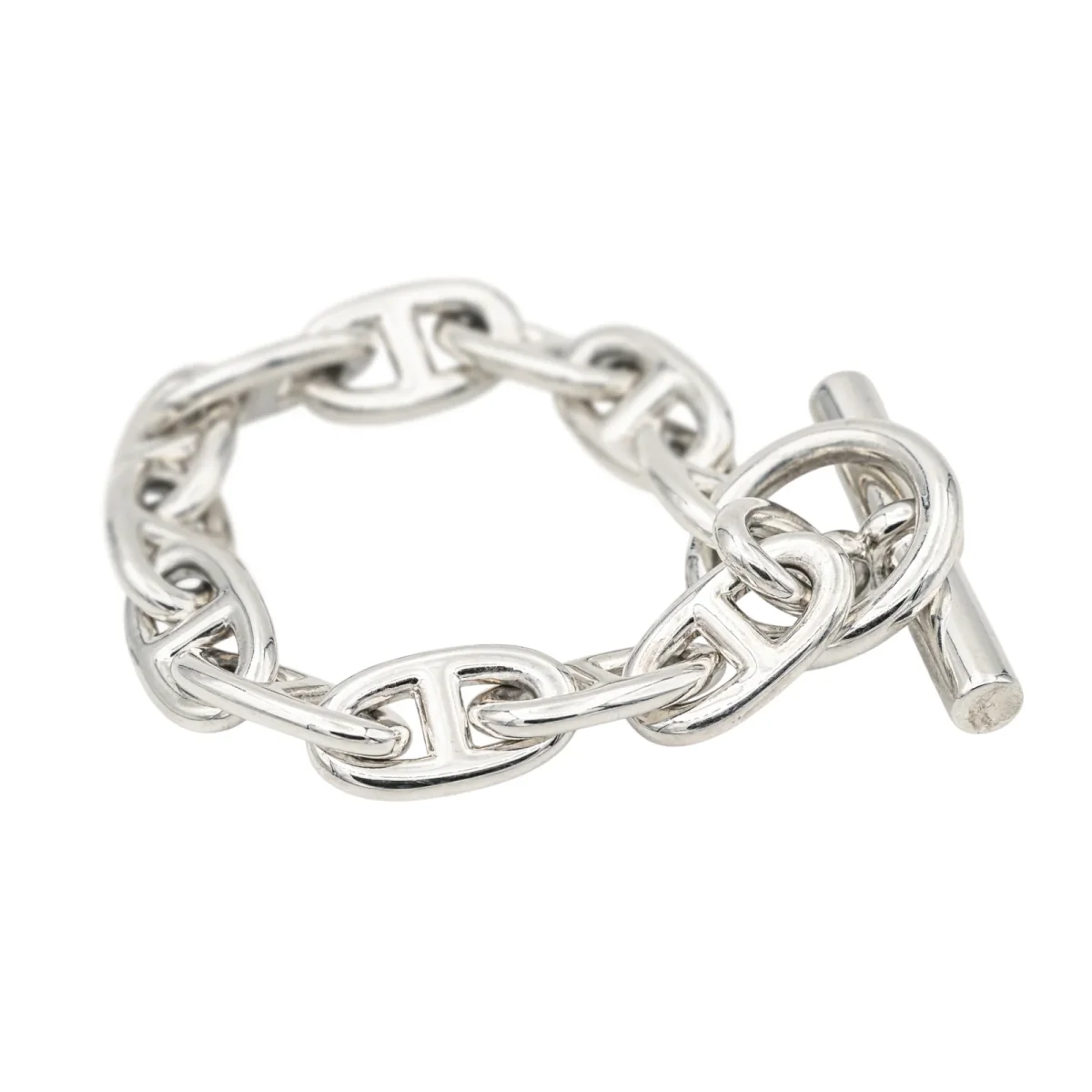 Bracelet signé de la Maison Hermès en argent 925 millièmes, moyen modèle chaîne d’ancre, maille marine, longueur : 20 cm, largeur : 1,16 cm, épaisseur : 0,29 cm, poids total : 67,17 g, fermoir avec « T », poinçon cygne, excellent état