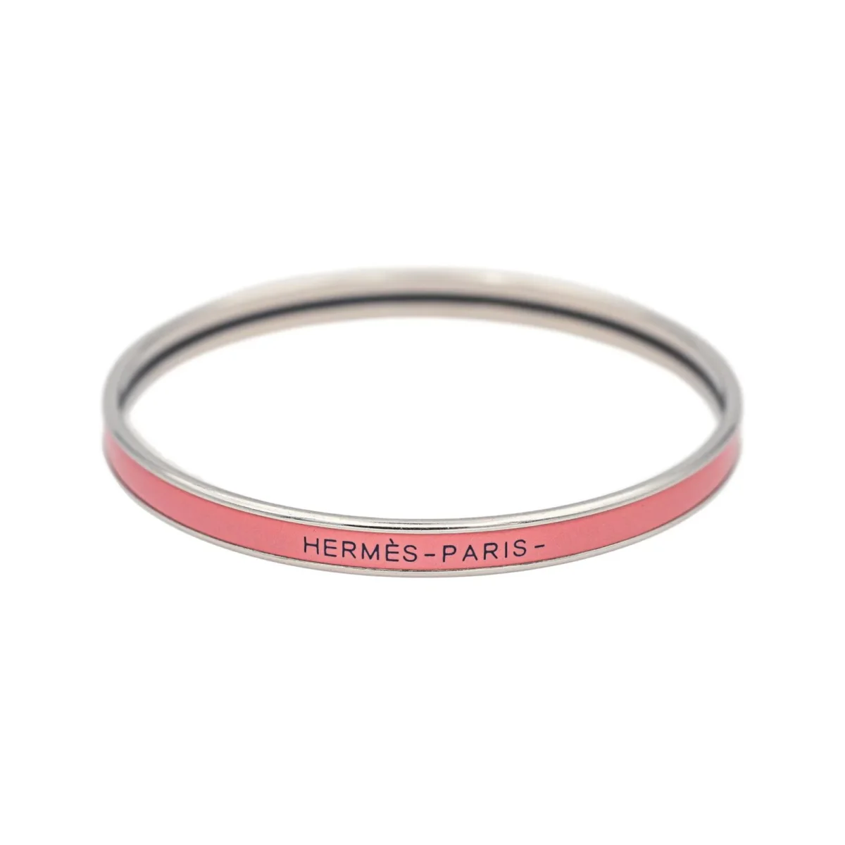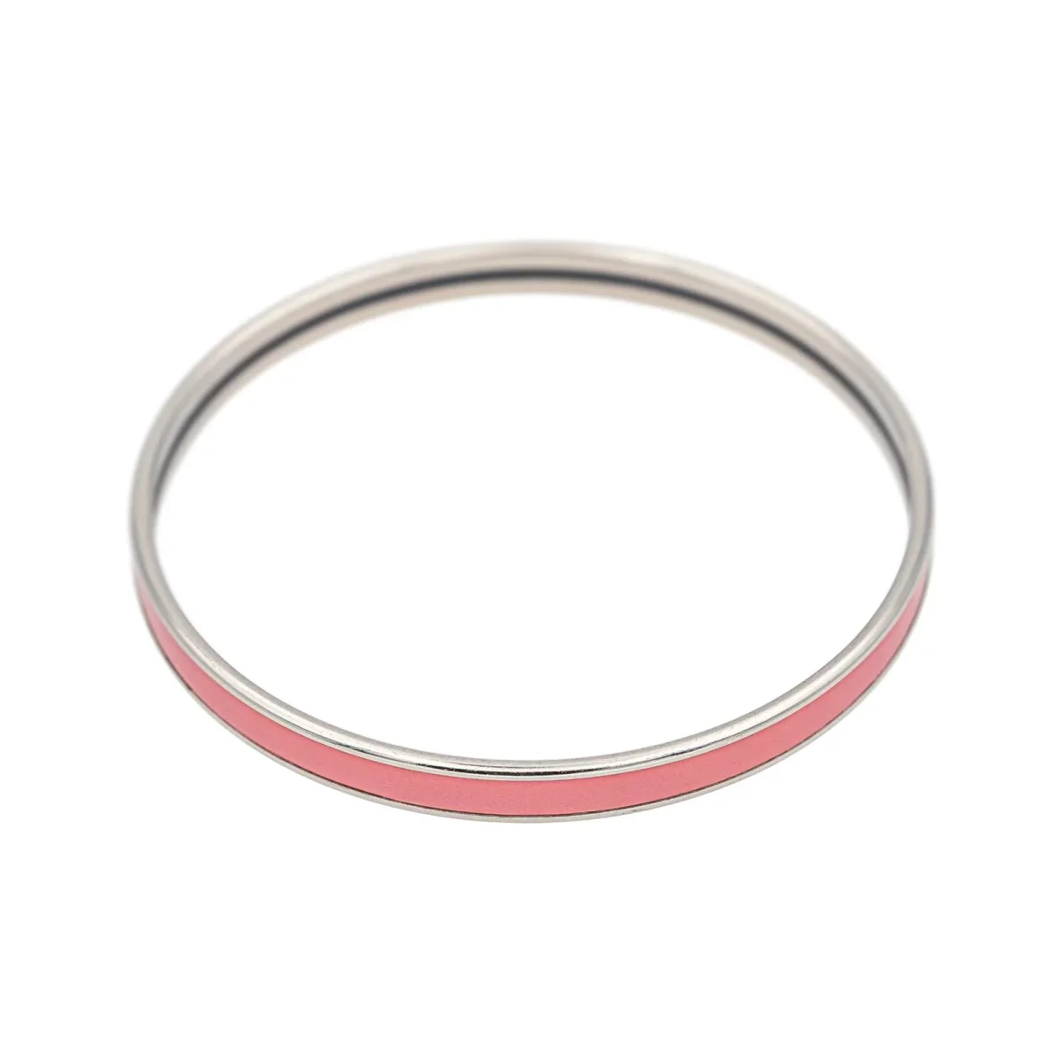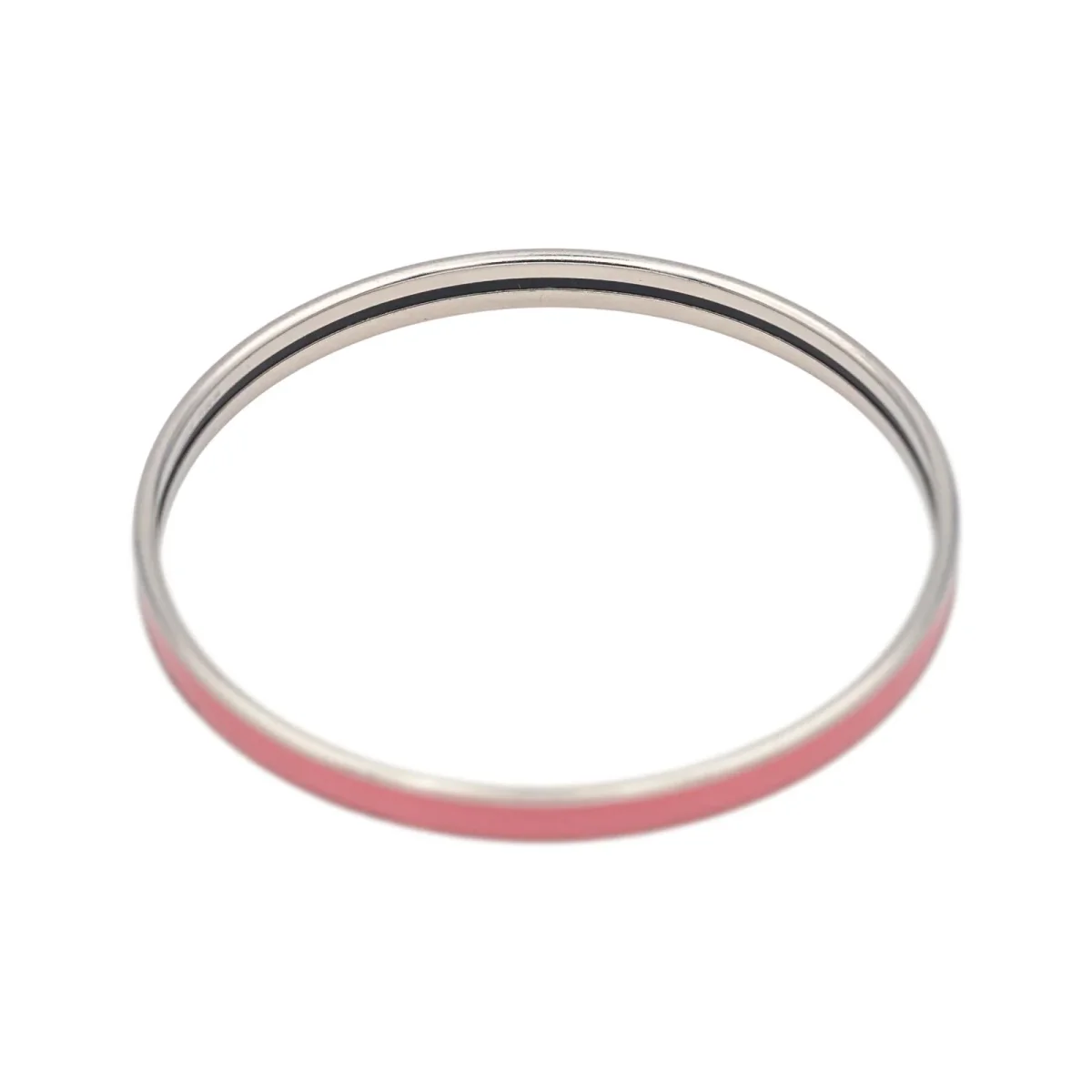 Bracelet signé de la maison Hermès en métal argenté, en émail rose, diamètre : 5,90 cm, largeur : 0,60 cm, poids total: 10,70 g, bon état