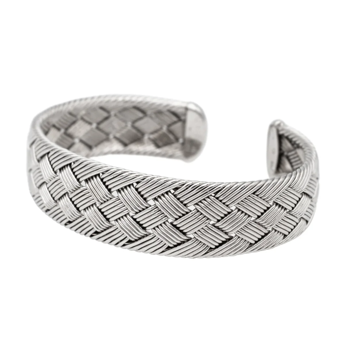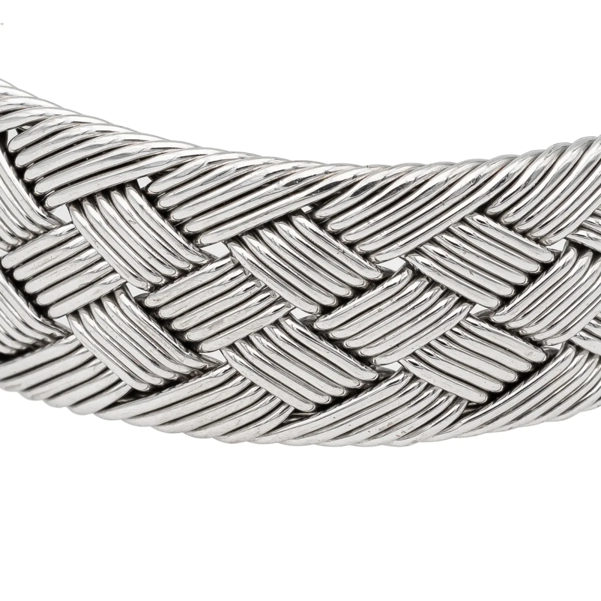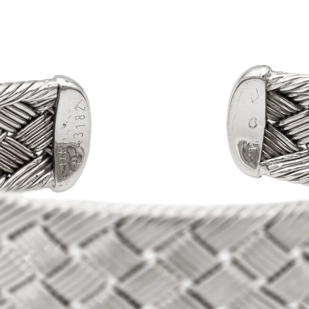 Bracelet signé de la maison Hermès, en or blanc 750 millièmes (18 carats), modèle vintage, RARE, manchette ouverte rigide, forme ovale, motif tressé, taille: 19 cm, largeur: 1,75 cm, épaisseur: 0,33 cm, diamètre intérieur: 6,1 cm x 4,6 cm, signature Hermès partiellement estompée, numéroté: P43182, poids total: 51,45 g, poinçonné tête d’aigle, excellent état