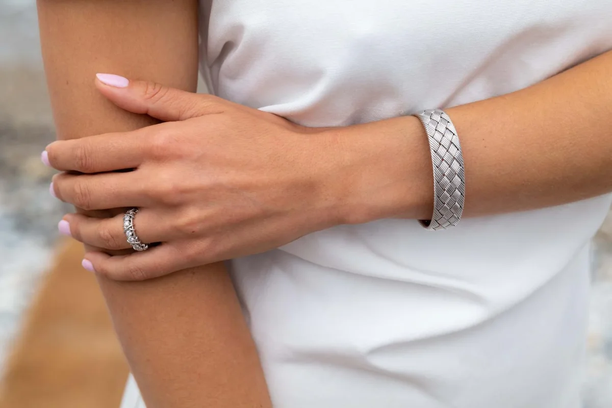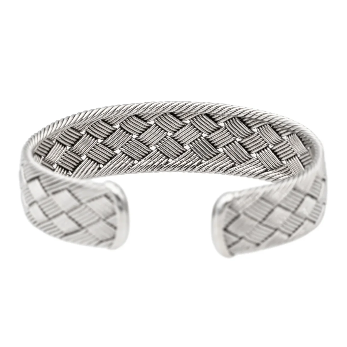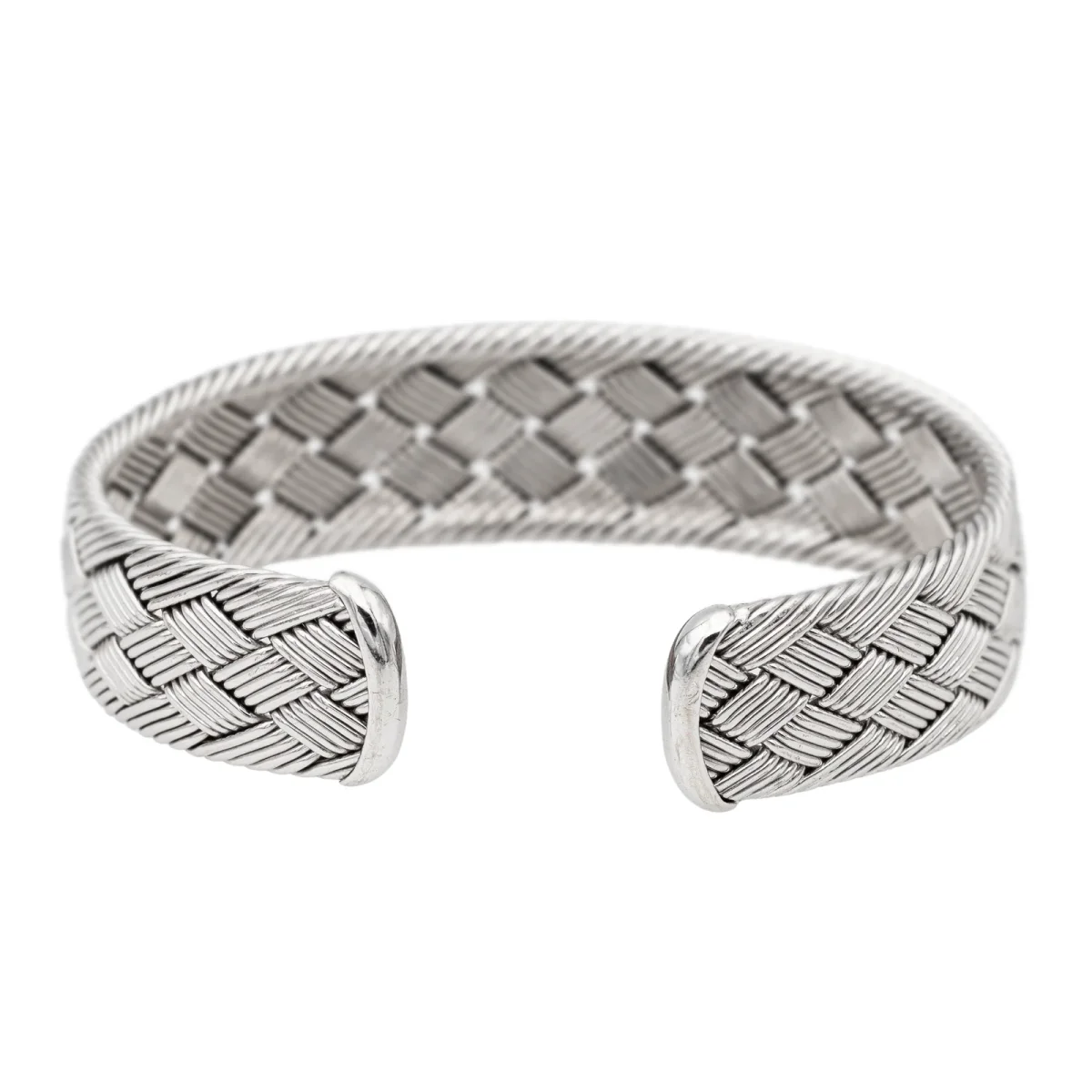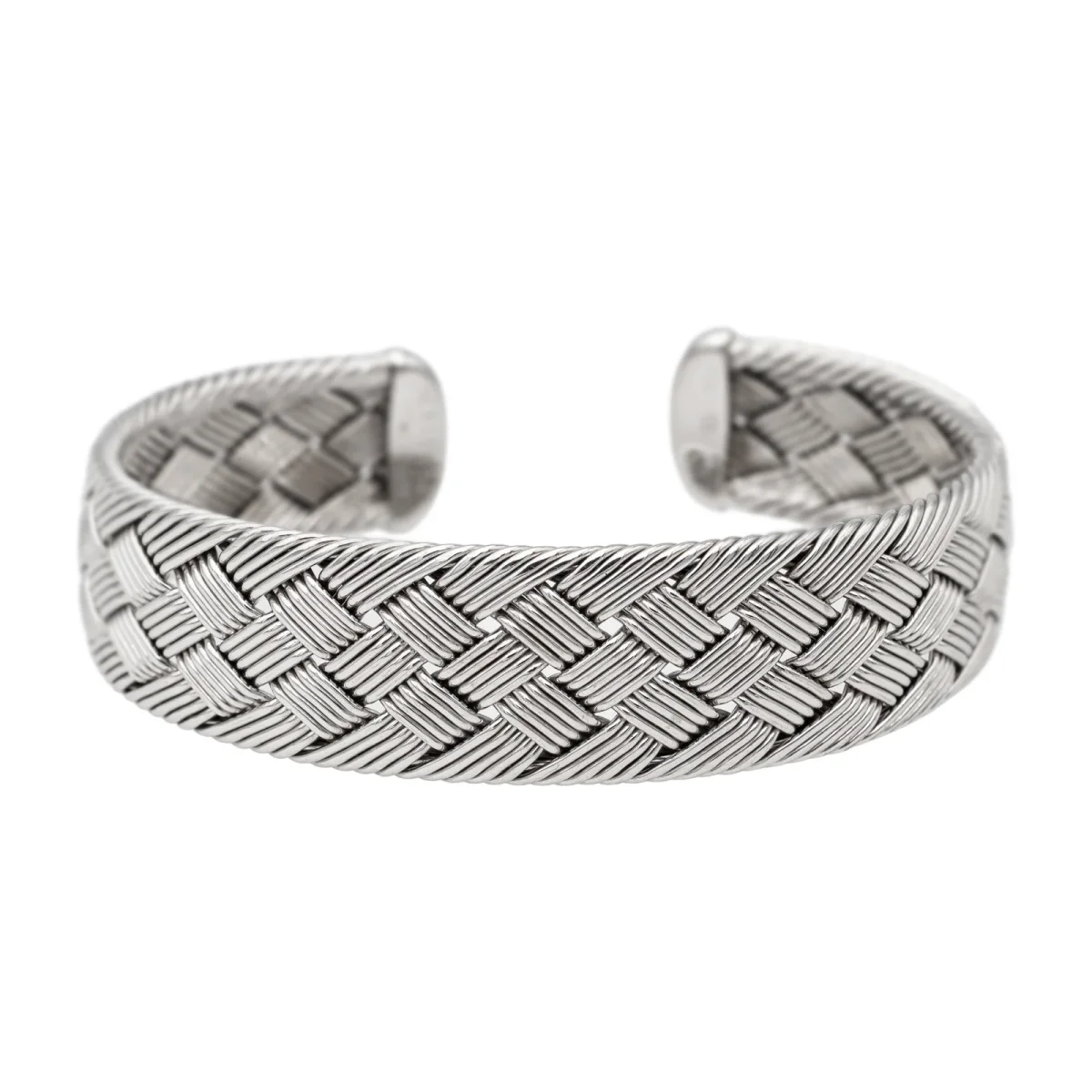 Bracelet signé de la maison Hermès, en or blanc 750 millièmes (18 carats), modèle vintage, RARE, manchette ouverte rigide, forme ovale, motif tressé, taille: 19 cm, largeur: 1,75 cm, épaisseur: 0,33 cm, diamètre intérieur: 6,1 cm x 4,6 cm, signature Hermès partiellement estompée, numéroté: P43182, poids total: 51,45 g, poinçonné tête d’aigle, excellent état