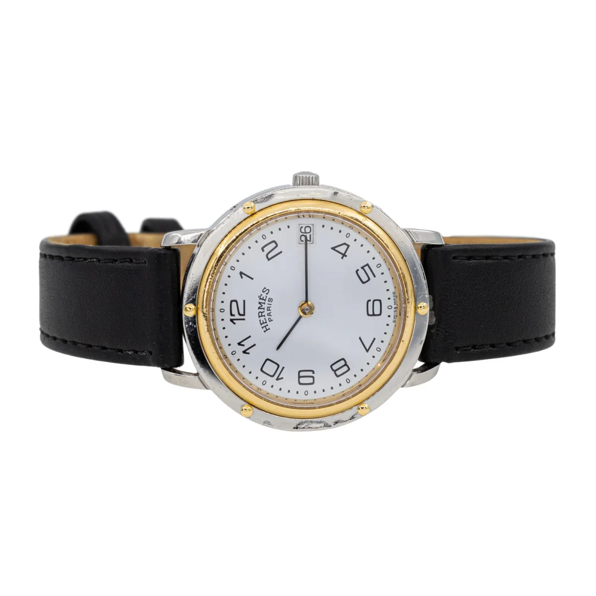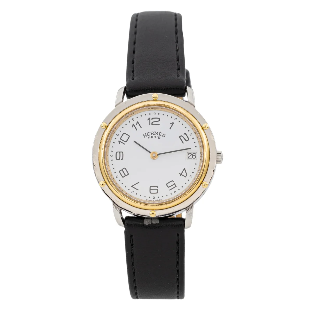Montre signée de la Maison Hermès modèle Clipper Acier, n°série 111595, cadran blanc à chiffres arabes, mouvement quartz, boitier 34,00 mm, verre saphir, bracelet en cuir à boucle ardillon (taille du poignet 20,00 cm ajustable, largeur du bracelet 1,40 cm), poids total 33,94 g, année 1997, Excellent état