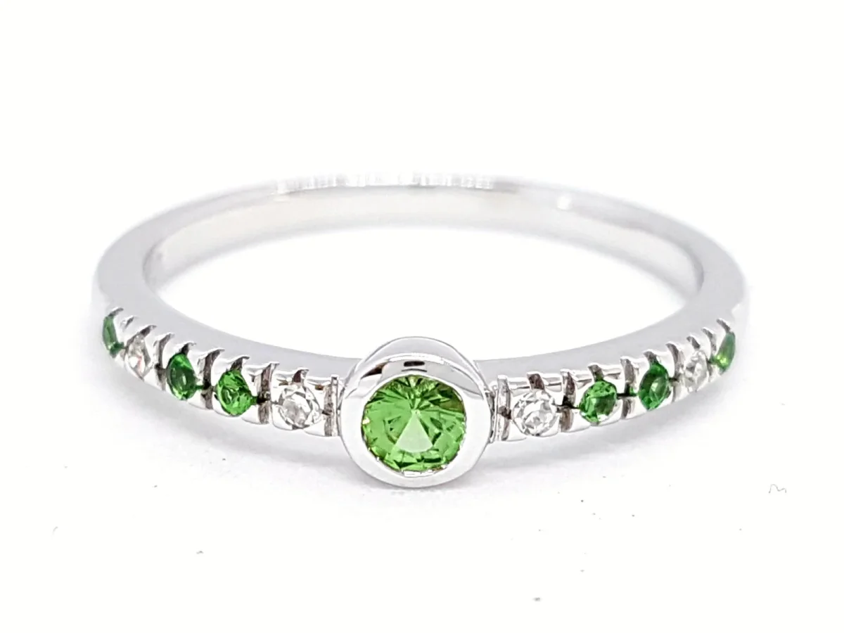 Bague signée Isbelle Langlois, en Or blanc 750 millièmes (18 carats), sertie de 4 diamants taille brillant G-H, V-SI pour environ 0,04 ct au total et de saphirs verts, 1 saphir vert rond central d’environ 0,05 ct et 6 saphirs verts d’environ 0,01 ct chacun, total saphirs vert environ 0,11 ct, taille de doigt: 53, Etat neuf, prix boutique 890€