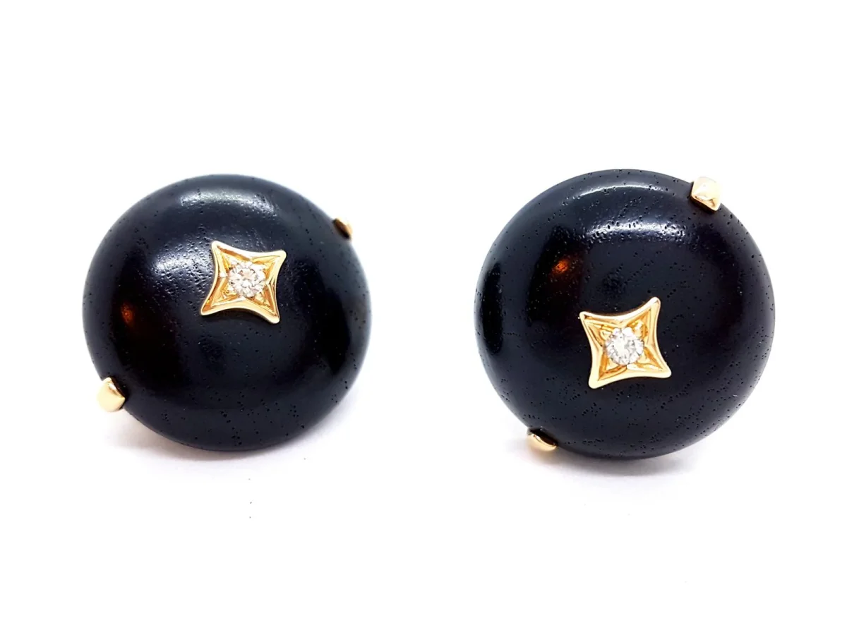 Boucles d’oreilles clips signés Isabelle Langlois, en ébene et sertis sur or rose 750 millièmes (18 carats), 2 diamants taille brillant G-H V-SI d’environ 0,035 ct chacun, diamètre: 2,2 cm, poids en or: 5,86 g, état neuf, prix neuf: 1200€