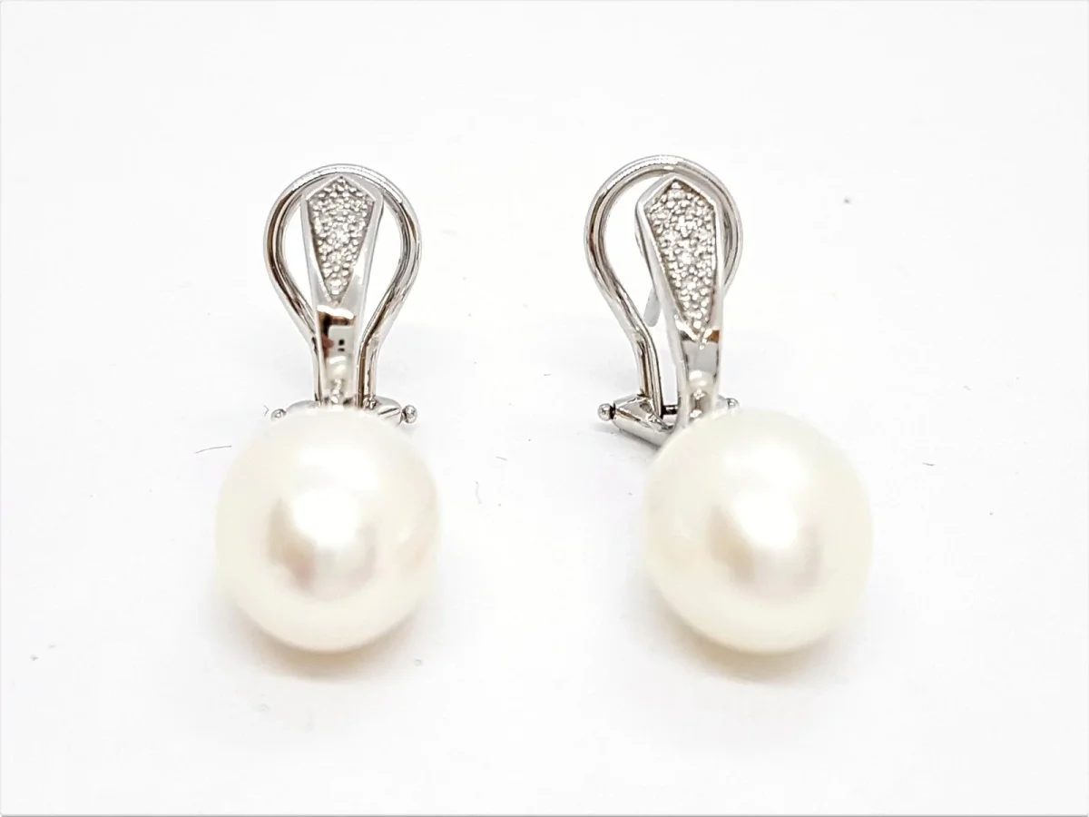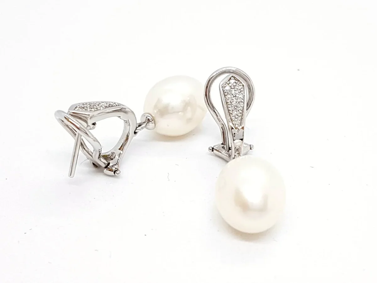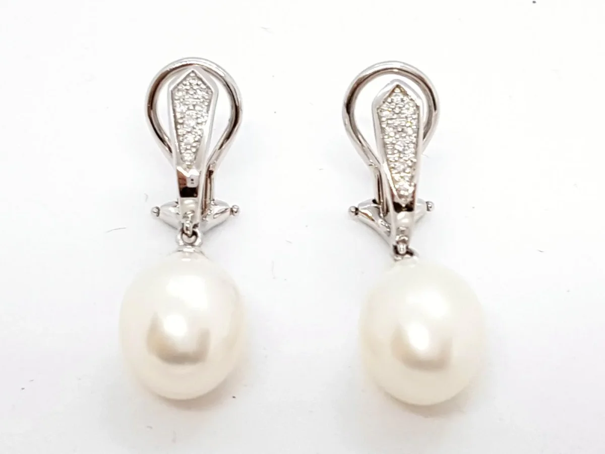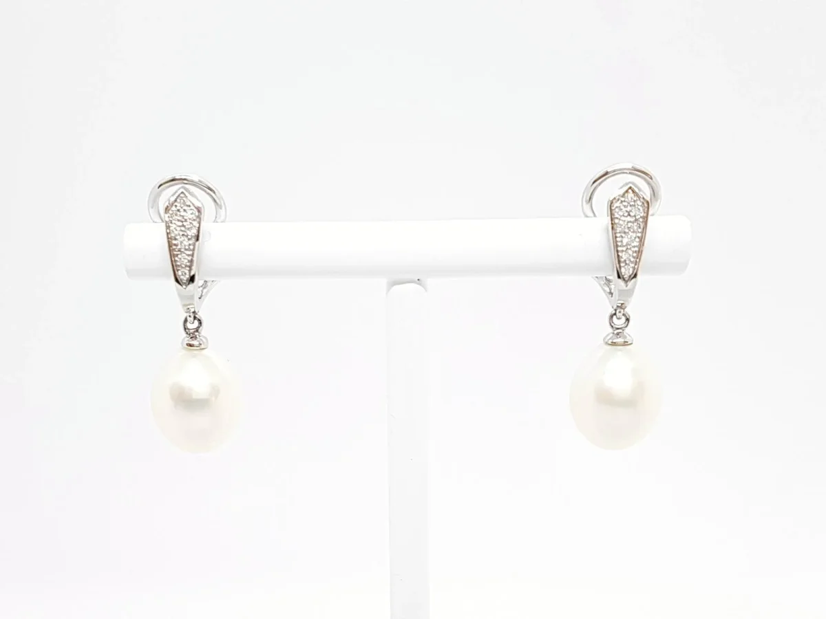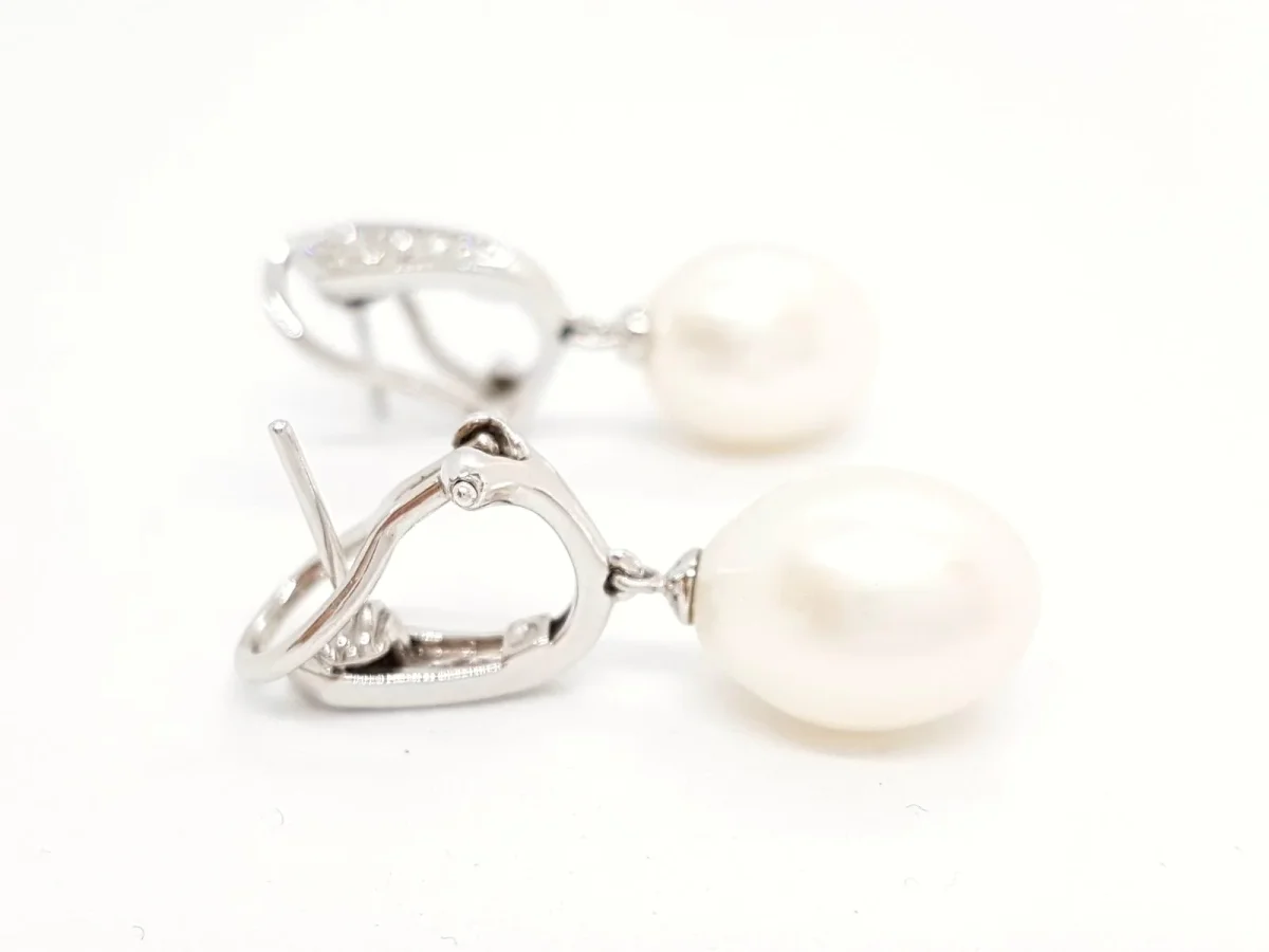 Boucles d’oreilles signées Isabelle Langlois, Or blanc 750 millièmes (18 carats), avec 16 Diamants taille brillant G-H V-SI pour environ 0.10 cts au total, et perles ovales de dimension 1 cm x 1.3 cm, Pendantes, longueur: 3 cm, poids total 7.56 g, poinçonné, etat neuf