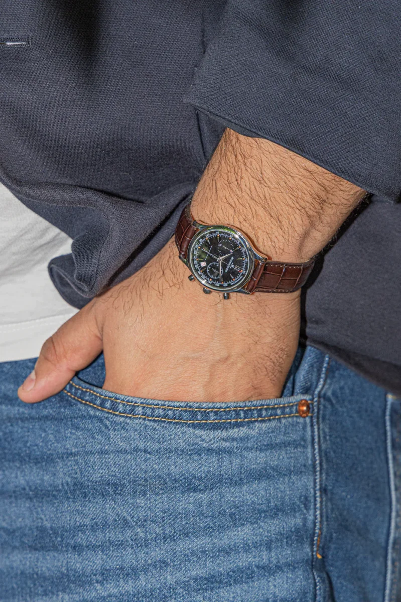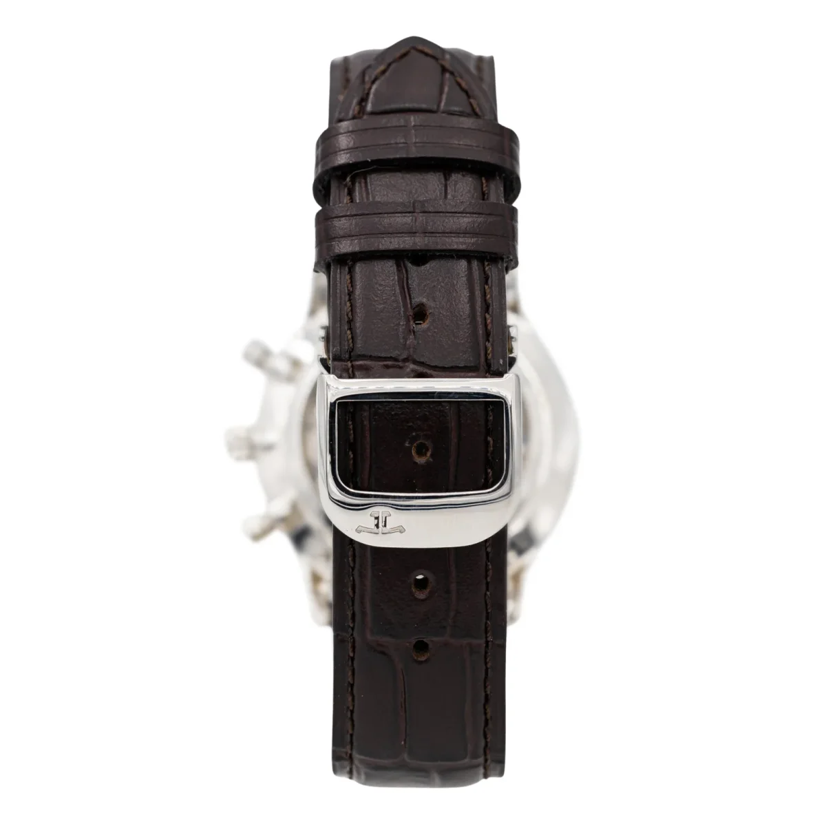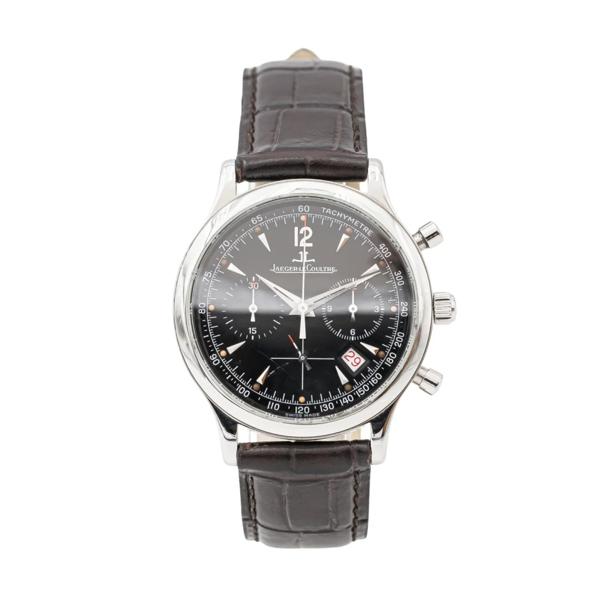 Montre Jaeger Lecoultre modèle Master Control acier réf : 145.8.31.S, n° de série 2884016, cadran noir chrono à index, mouvement à quartz, boitier 34mm, verre saphir, bracelet cuir boucle déployante (Taille poignet 21cm ajustable, Largeur bracelet 1,6cm) poids total 42,58g, années 2000, Excellent état