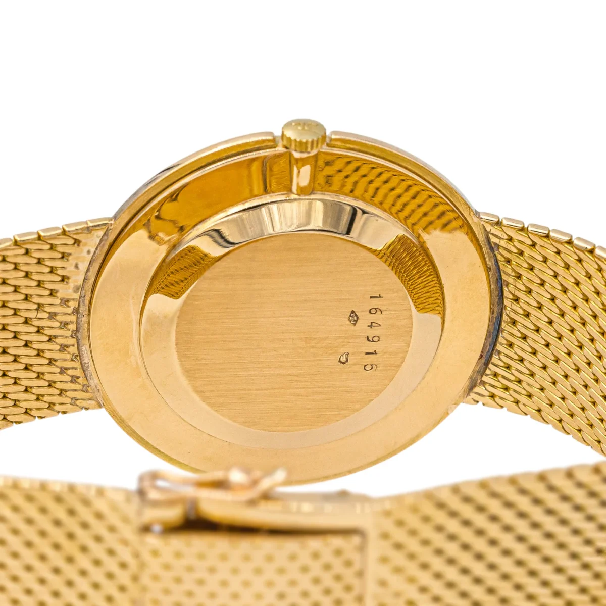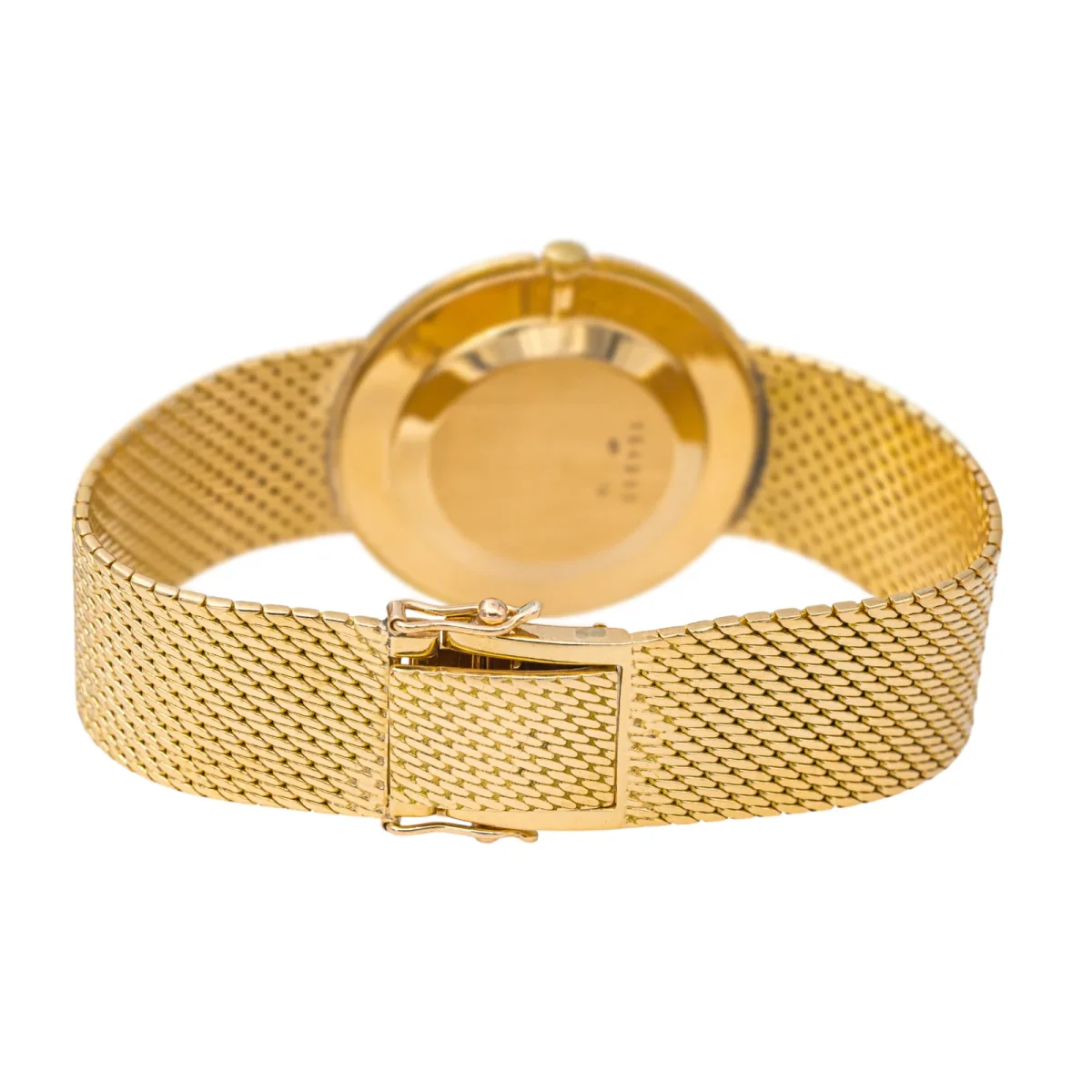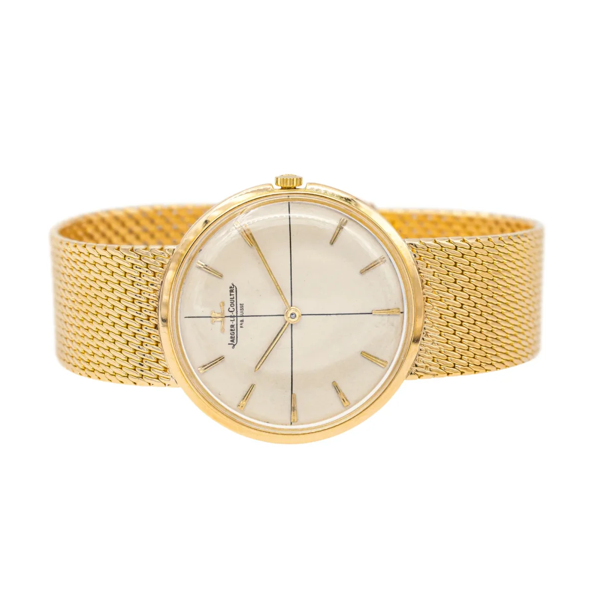 Montre femme, signée de la maison Jaeger Lecoultre, en or jaune 750 millièmes (18 carats), mouvement mécanique, boitier rond 33 mm, cadran beige, aiguilles dorées, index barres dorées, bracelet maille milanaise, fermoir à cliquet avec double huit de sécurité, verre plexiglas, largeur du bracelet: 1,73 cm, taille du poignet : 17 cm, modèle vintage, années 1950, signée et numérotée: 164915, poids total: 64,23 g, poinçons tête d’aigle, en état de marche, excellent état.