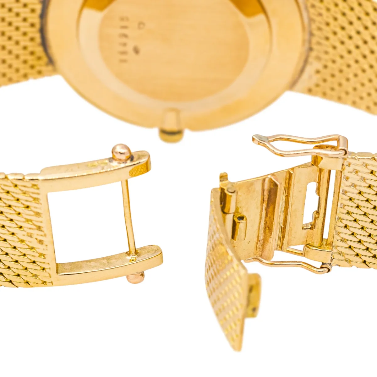 Montre femme, signée de la maison Jaeger Lecoultre, en or jaune 750 millièmes (18 carats), mouvement mécanique, boitier rond 33 mm, cadran beige, aiguilles dorées, index barres dorées, bracelet maille milanaise, fermoir à cliquet avec double huit de sécurité, verre plexiglas, largeur du bracelet: 1,73 cm, taille du poignet : 17 cm, modèle vintage, années […]