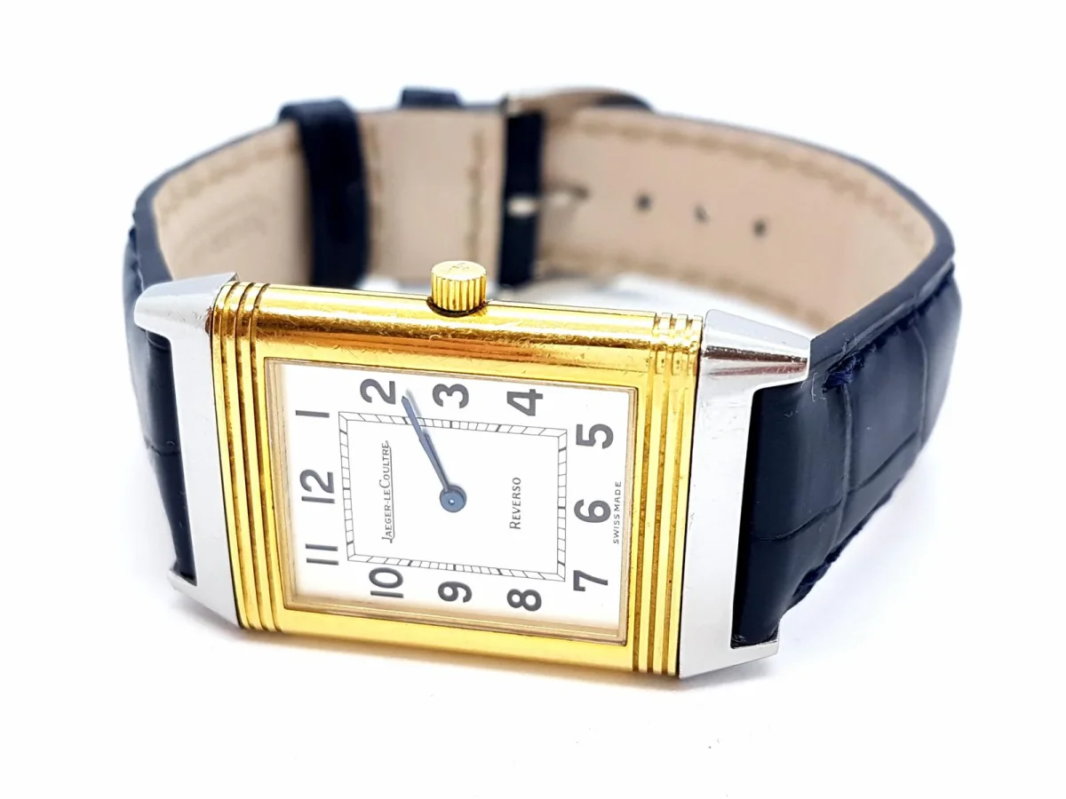 Montre femme signée de la maison Jaeger Lecoultre, modèle réverso, bicolore en or jaune 750 millièmes (18 carats) et acier, mouvement quartz, cadran blanc, aiguilles bleues, taille du boîtier: 3,3 cm x 2,3 cm, bracelet neuf en alligator bleu, boucle ardillon en acier neuve, taille bracelet: longueur: 17 cm, largeur: 1,2 cm, Taille du poignet ajustable jusqu’ à 21,5 cm, modèle des années 1990, numéroté: 250.5.08 1754583, bon état, prix neuf: environ 8000€