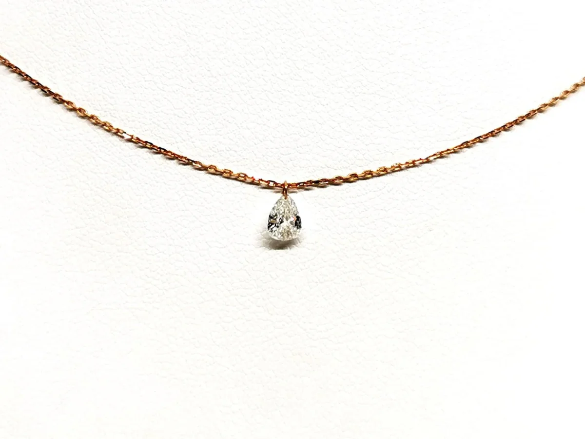 Collier signé de la maison La Brune et la Blonde, Collection 360°, en or rose 750 millièmes (18 carats) testé, fine chaîne maille forçat, sur laquelle est monté un diamant percé, taille poire, environ F/G – VS/SI1, de 0,25 carat, longueur chaîne: 41 cm avec anneau intermédaire à 39 cm, largeur chaîne: 0,07 cm, dimensions poire: 0,51 cm x 0,38 cm, poids total: 1,02 g, prix neuf: 2150€, excellent état