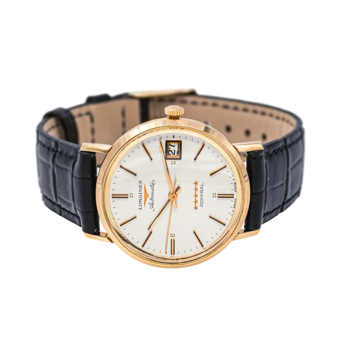 Montre Longines modèle Admiral en or jaune 750 millièmes (18 carats), cadran argent à index batons, mouvement mécanique à remontage automatique, boîtier 34 mm, verre plexiglass, bracelet cuir noir boucle ardillon d’origine, poids total : 41,12 g, boite d’origine, années 70, révision complète, excellent état