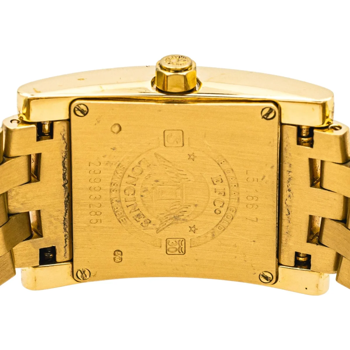 Montre Longines modèle Dolce Vita square L5.166.7 en or jaune 750 millièmes (18 carats), n°série 29993285, cadran blanc à chiffres romains, sertie de 48 diamants taille brillant, environ H-VS, poids total de diamant environ 0,48ct (chaque diamant d’un poids d’environ 0,01ct), mouvement quartz, boîtier 21 mm, verre saphir, bracelet en or jaune, fermoir papillon, taille poignet 15,00 cm, largeur bracelet 1,50 cm, poids total : 75,12 g, années 2000, révision complète et garantie 1 an, excellent état