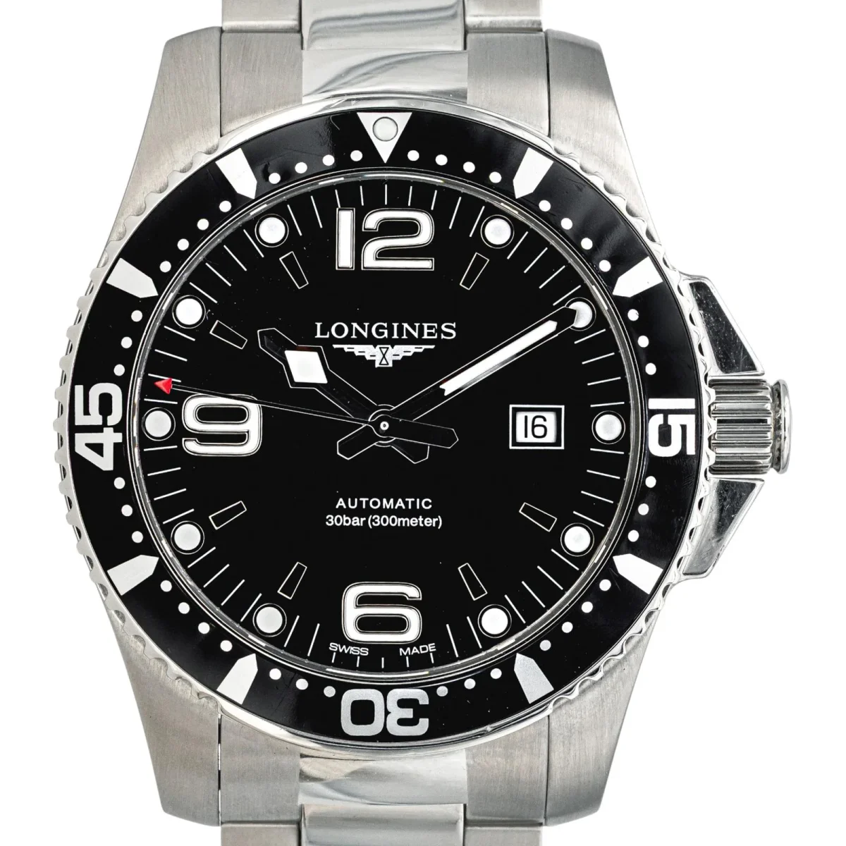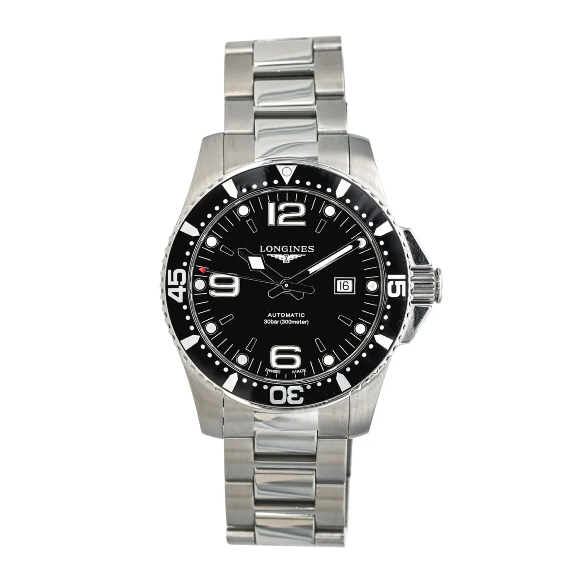 Montre Longines modèle Hydroconquest en acier, n°série 3.841.4, cadran noir à chiffres arabes, mouvement mécanique à remontage manuel, boîtier 43 mm, verre saphir, bracelet en acier boucle déployante, (taille poignet 25 cm, largeur bracelet 2,19 cm), poids total : 206,85 g, full set (boite et papier d’origine), année 2021, révision complète et garantie 1 an, excellent état