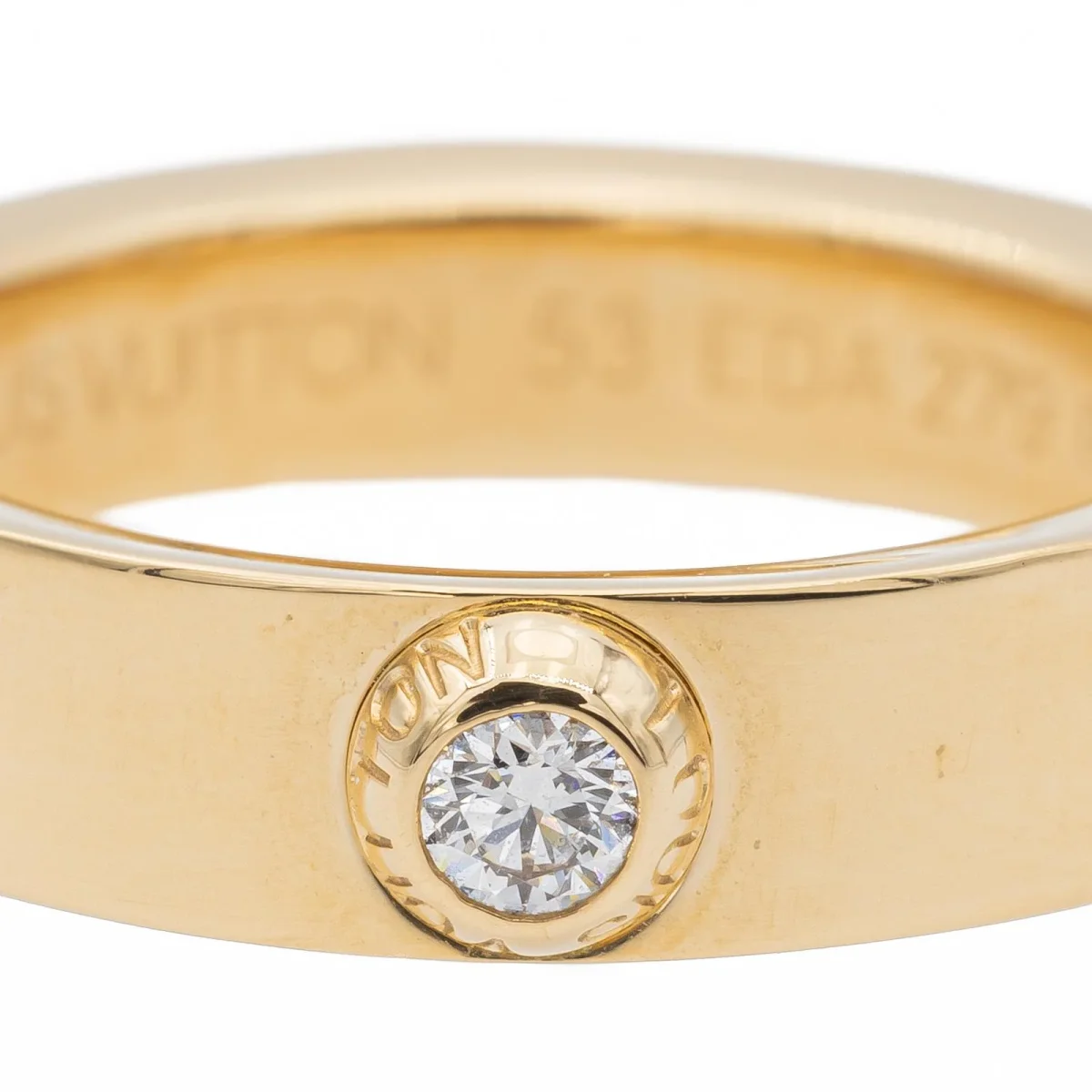 Bague signée de la Maison Louis Vuitton, modèle Clous, en or jaune 750 millièmes (18 carats), sertie d’un diamant taille brillant environ H/VS, d’un poids total d’environ 0,07 ct, largeur sur le dessus: 0,47 cm, tour de doigt: 53, poids total: 10,63 g, numérotée: EDA279, poinçon hibou, excellent état